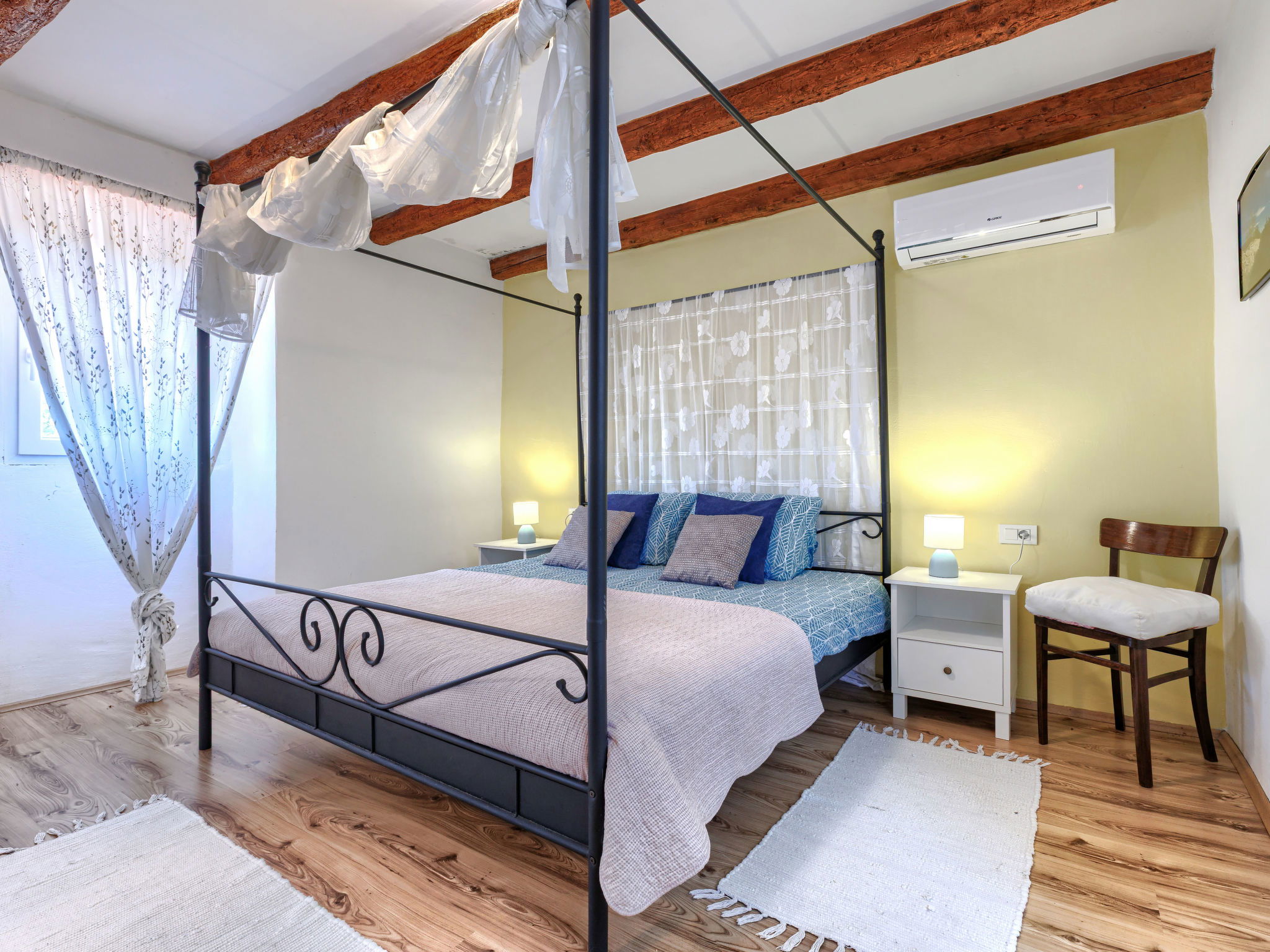 3-room semi-detached house 80 m2 on 2 levels. Living room with satellite TV and air conditioning. Kitchen (1 hot plate, oven, 3 gas rings, toaster, kettle, microwave, freezer, electric coffee machine) with dining table. Exit to the terrace. Shower/WC. Upper floor: 1 room with 1 french bed (200 cm, length 200 cm), air conditioning. 1 room with 2 beds (90 cm, length 200 cm). Balcony 10 m2. Terrace furniture, balcony furniture, deck chairs. Facilities: iron, hair dryer. Internet (WiFi, free). Please note: non-smoking house. Maximum 2 pets/ dogs allowed.