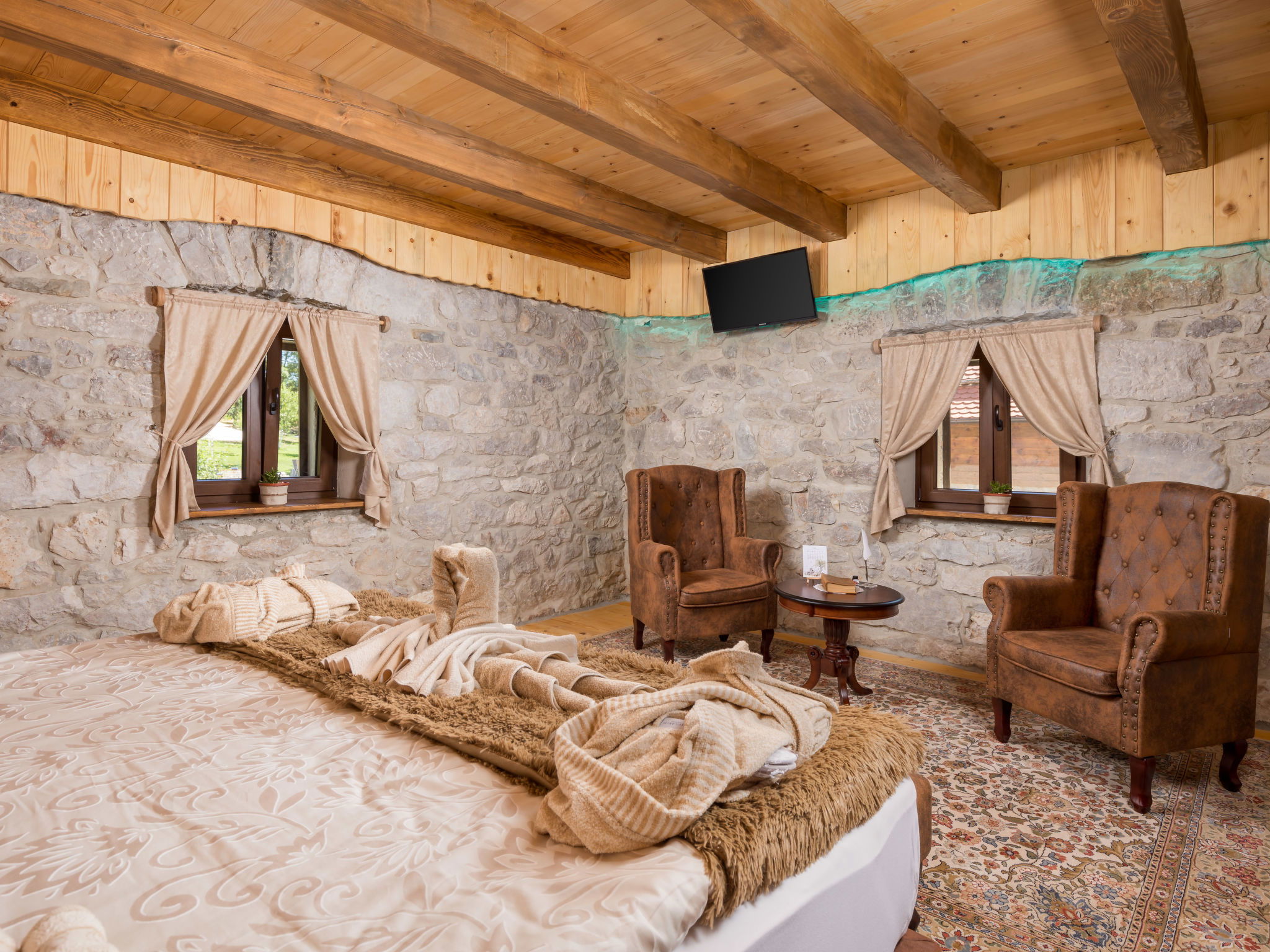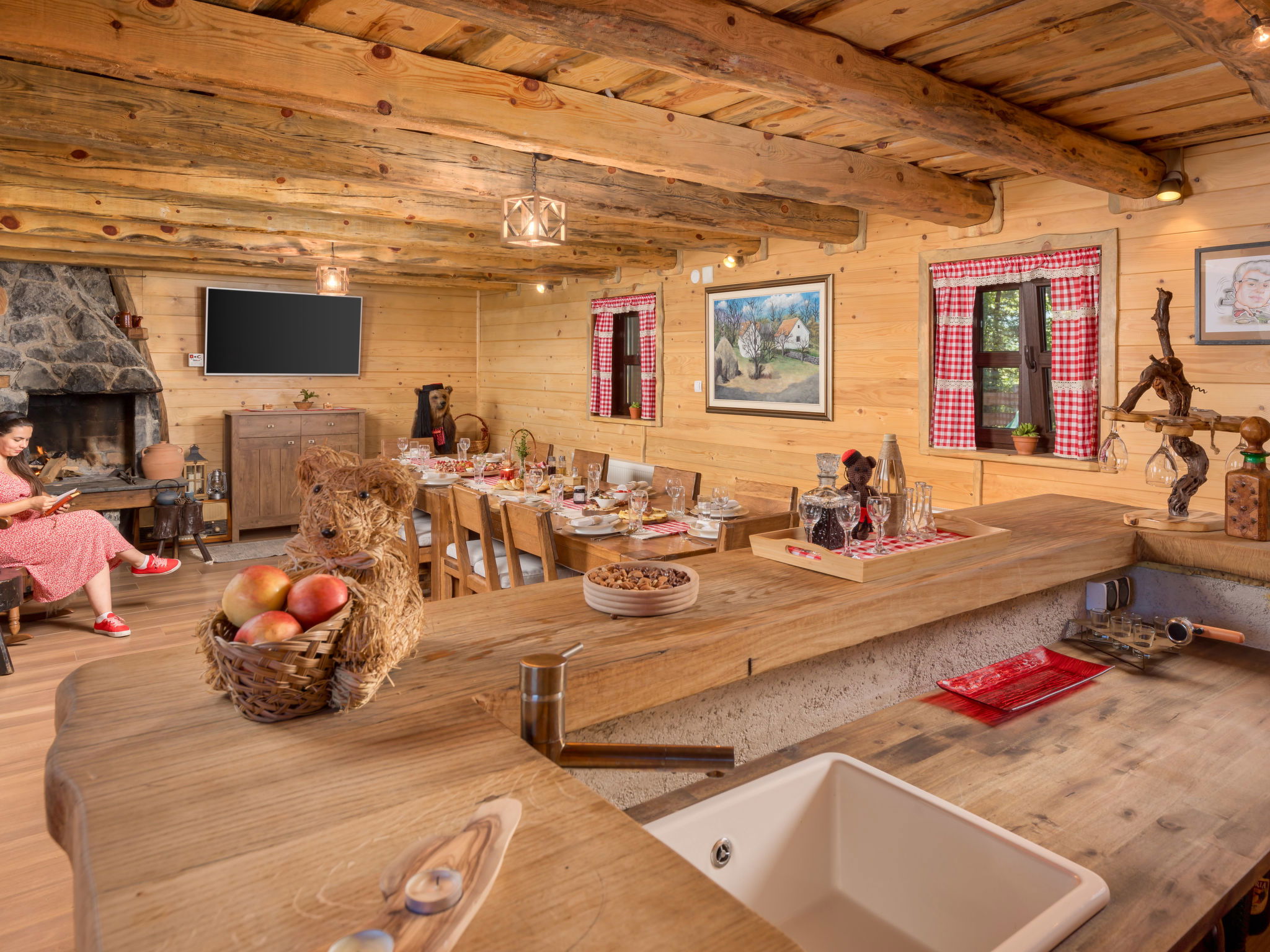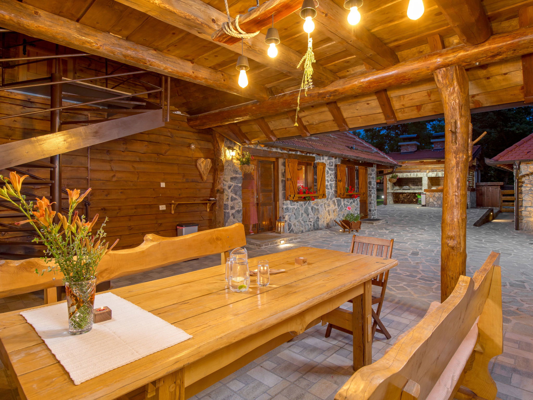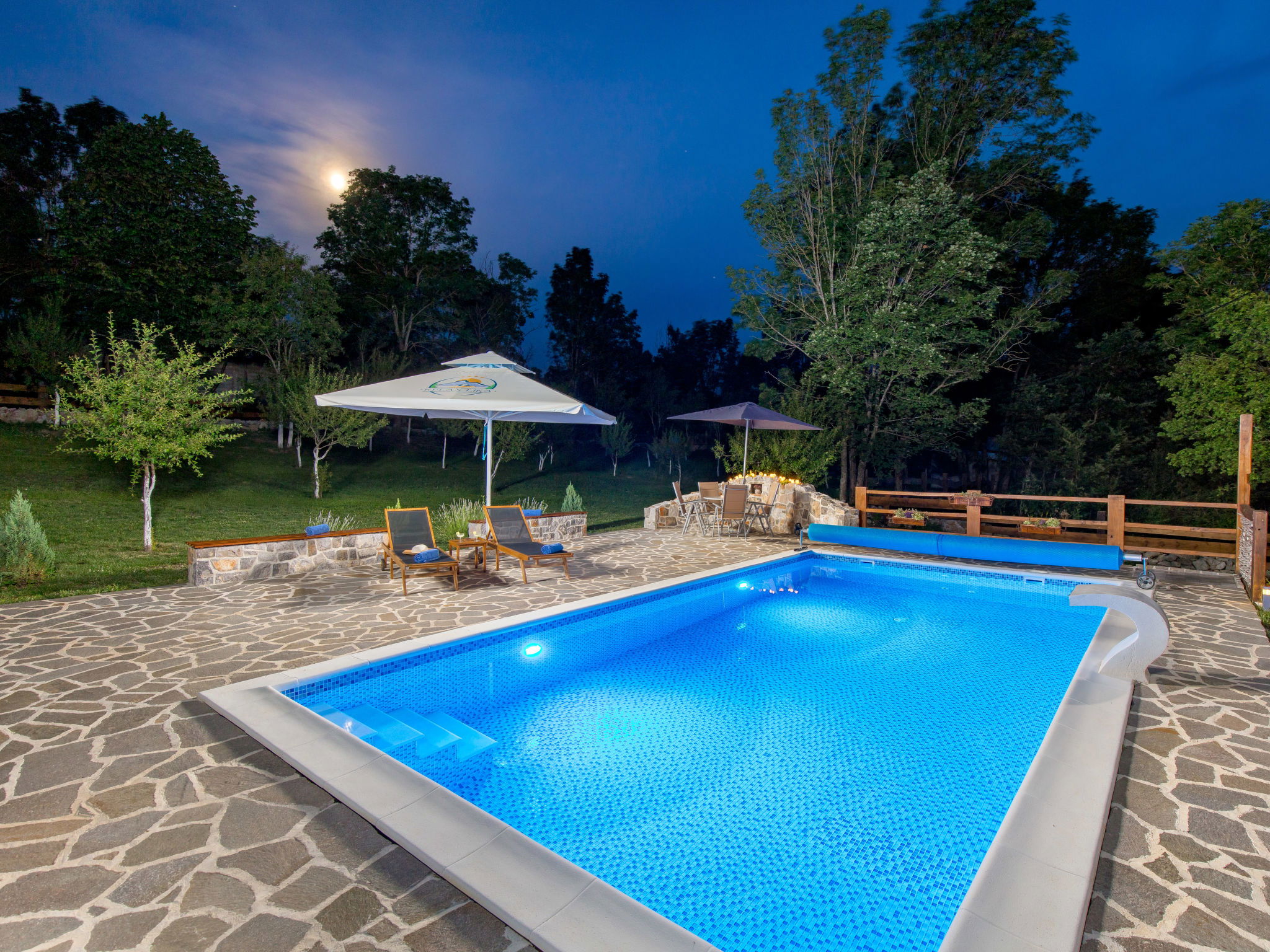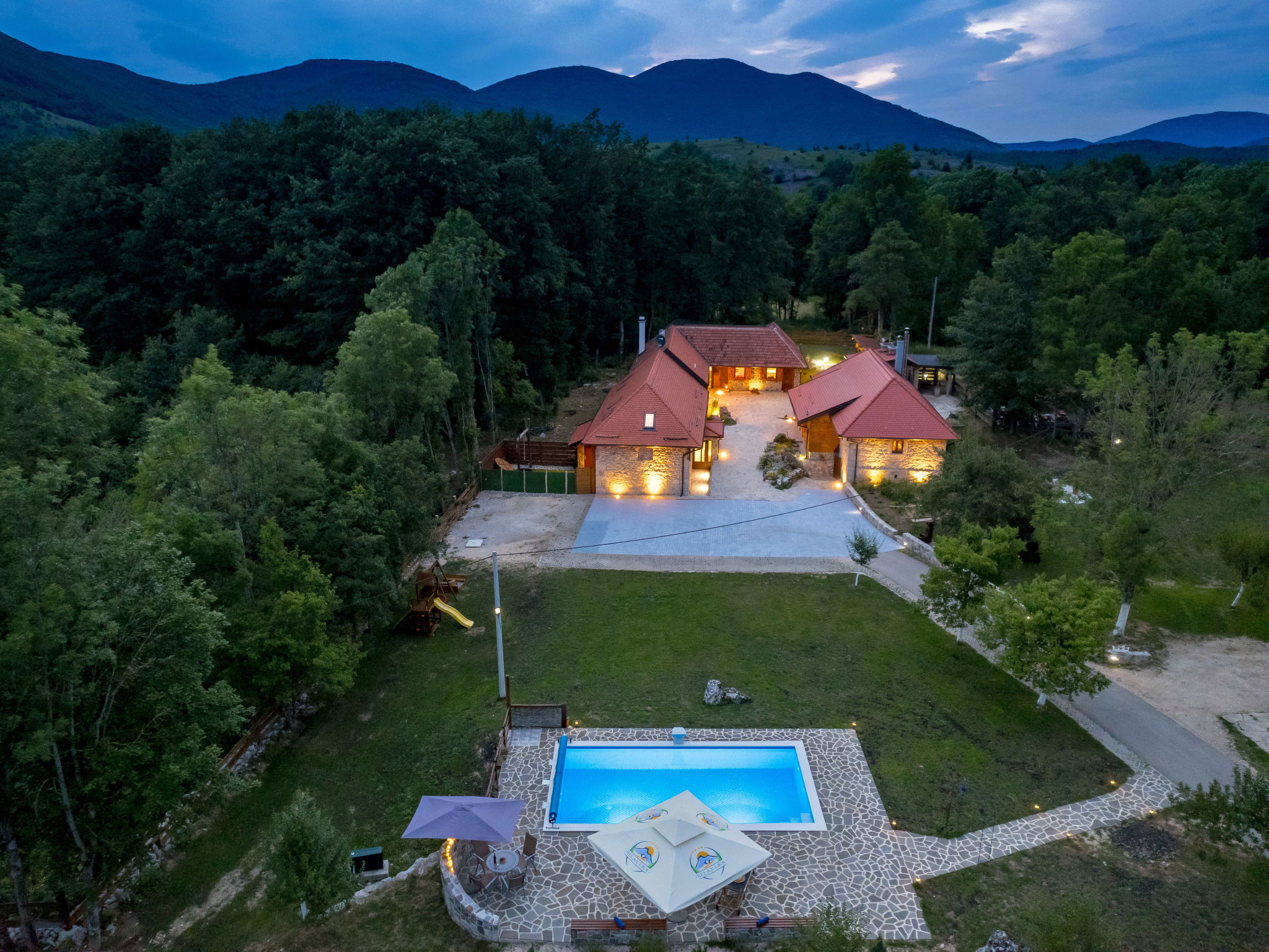 The wellness area on the ground floor consists of a steam and bio Finnish sauna, a heated hot tub for 6 people, warm benches, a cold barrel and two showers. Large, comfortable country house "Relax Lika", 3 storeys, detached in 2022, surrounded by trees and fields. In the hamlet Tomingaj 6 km from the centre of Gračac, in a secluded position, 45 km from the sea, 12 km from the lake, 45 km from the beach, in the countryside, in the woods. Private: natural state property 2'000 m2, well-kept garden with wildlife garden and trees, swimming pool round, heated (32 m2, depth 150 cm, seasonal availability: 01.May. - 01.Oct.) with internal staircase, shutter cover and salt-electrolysis pool-cleaning system. Outdoor shower, badminton, garden furniture, barbecue, children's playground (slide). In the house: internet access, WiFi, spa area, central heating system, air conditioning, washing machine. Parking (for 5 cars) at the house on the premises. Shop 6 km, restaurant 5 km, bus stop 5 km, railway station 6 km, pebble beach "Rovanjska" 45 km, lake Ričica 12 km. Nearby attractions: Cerovačke Špilje 10 km, Jezero Ričice 12 km. Please note: car recommended. Groups of teenagers on request only. The owner lives on the same property. Animals in the neighbourhood. Motorway 50 km from the property. Railway line 6 km from the property. Airfield 70 km from the property.