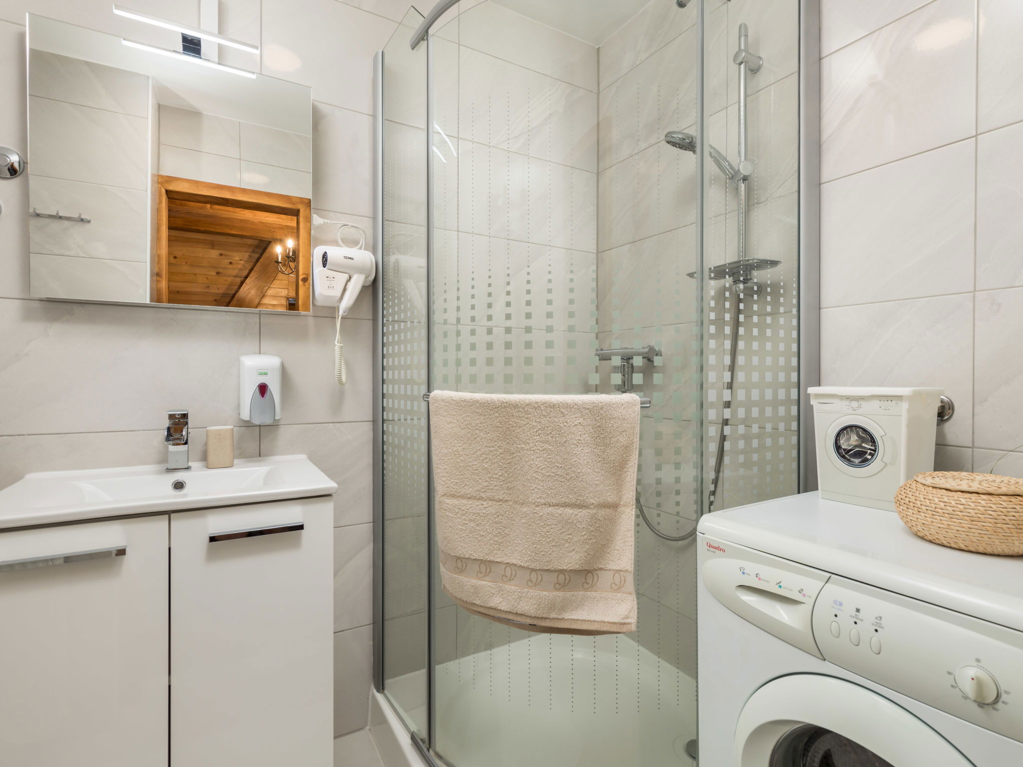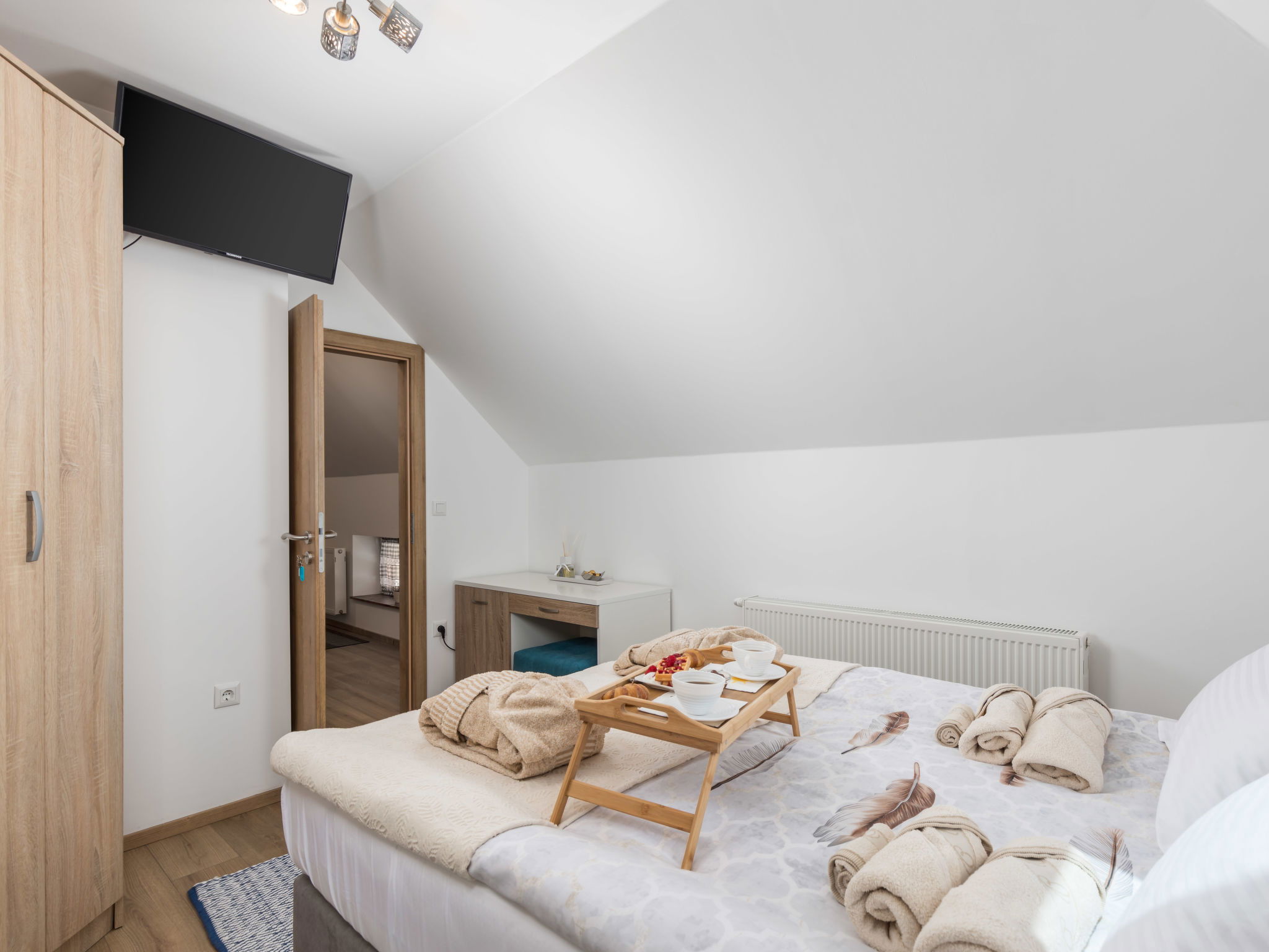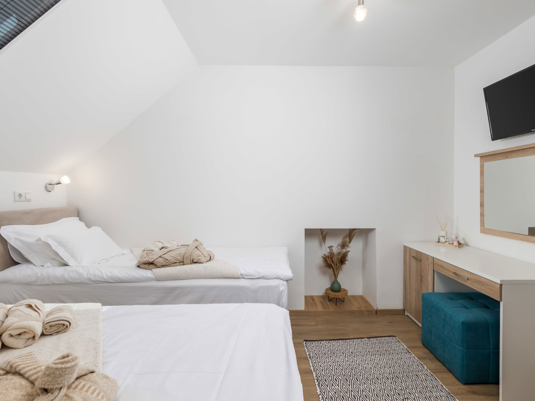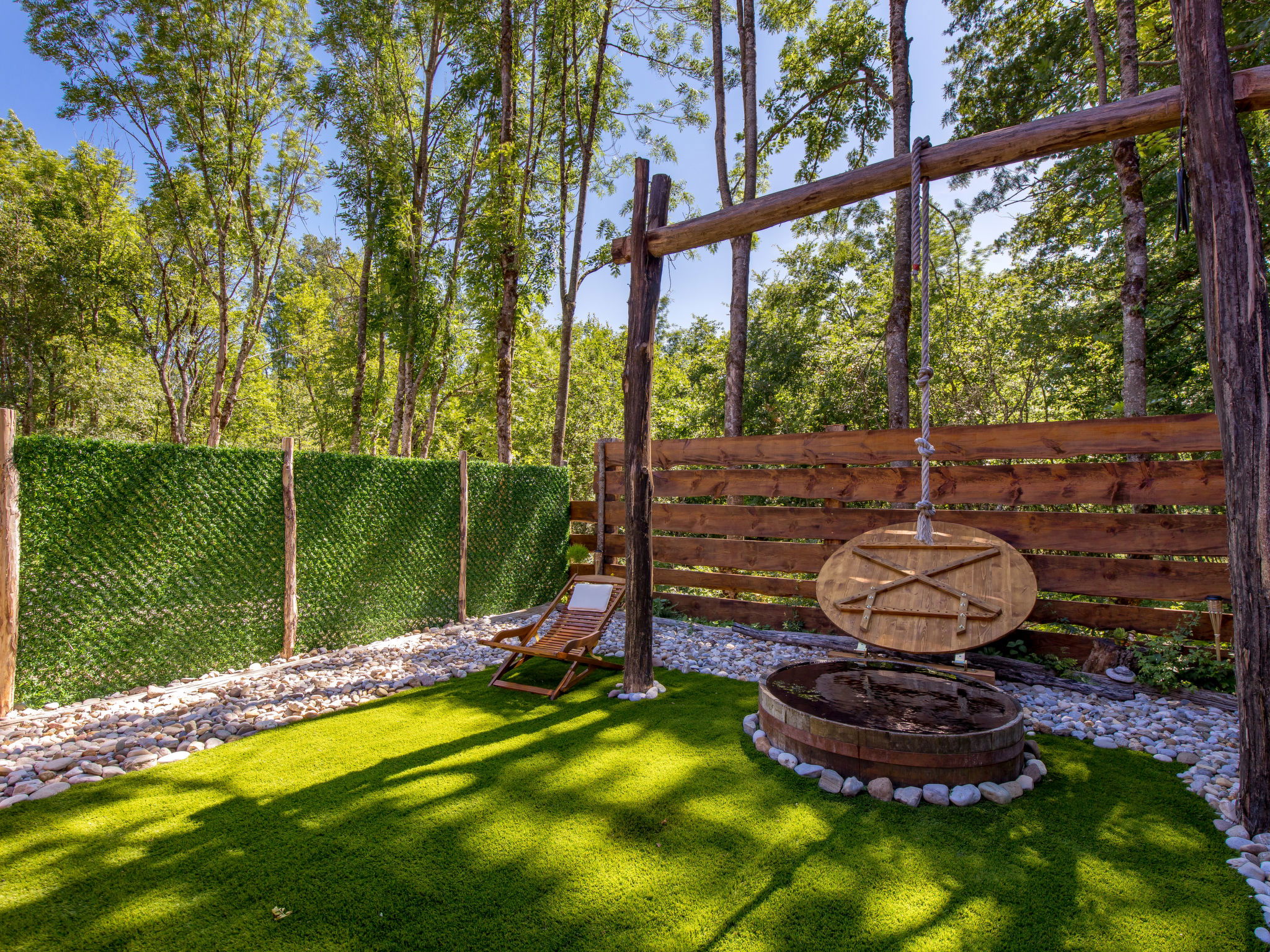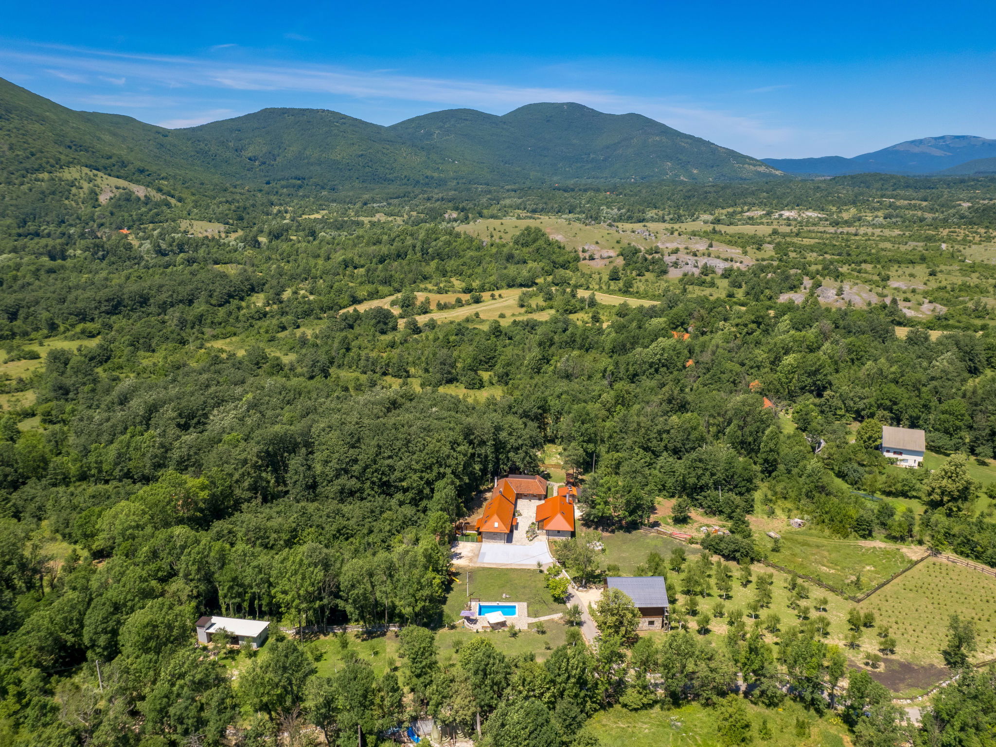 The wellness area on the ground floor consists of a steam and bio Finnish sauna, a heated hot tub for 6 people, warm benches, a cold barrel and two showers. Large, comfortable country house "Relax Lika", 3 storeys, detached in 2022, surrounded by trees and fields. In the hamlet Tomingaj 6 km from the centre of Gračac, in a secluded position, 45 km from the sea, 12 km from the lake, 45 km from the beach, in the countryside, in the woods. Private: natural state property 2'000 m2, well-kept garden with wildlife garden and trees, swimming pool round, heated (32 m2, depth 150 cm, seasonal availability: 01.May. - 01.Oct.) with internal staircase, shutter cover and salt-electrolysis pool-cleaning system. Outdoor shower, badminton, garden furniture, barbecue, children's playground (slide). In the house: internet access, WiFi, spa area, central heating system, air conditioning, washing machine. Parking (for 5 cars) at the house on the premises. Shop 6 km, restaurant 5 km, bus stop 5 km, railway station 6 km, pebble beach "Rovanjska" 45 km, lake Ričica 12 km. Nearby attractions: Cerovačke Špilje 10 km, Jezero Ričice 12 km. Please note: car recommended. Groups of teenagers on request only. The owner lives on the same property. Animals in the neighbourhood. Motorway 50 km from the property. Railway line 6 km from the property. Airfield 70 km from the property.