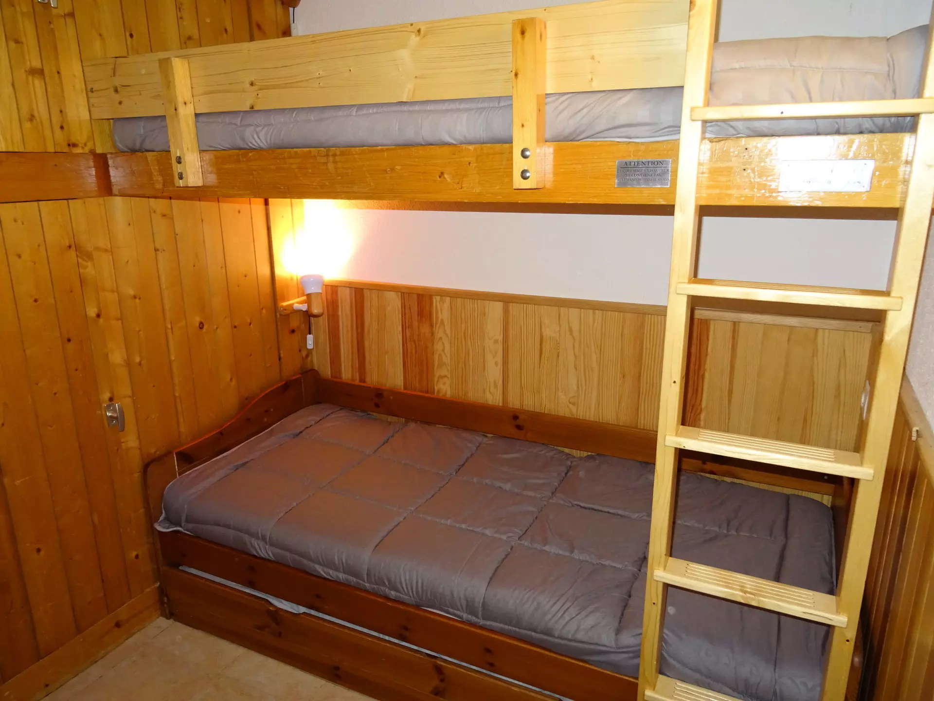 A mountain corner with a set of bunk beds and a pull-out bed.