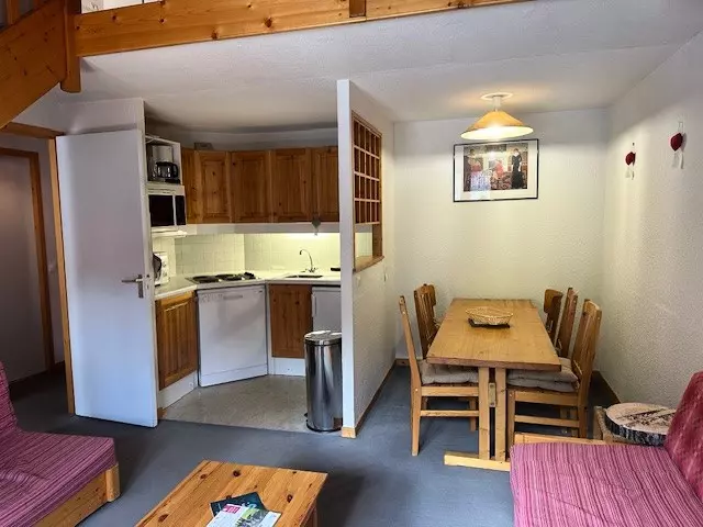 This magnificent 3-room duplex for 8 people with a view of the Montchavin cable car and the mountains consists of a fully equipped kitchen (electric hob, microwave, oven, coffee maker, toaster, dishwasher, washing machine), a bathroom with bathtub and separate WC.