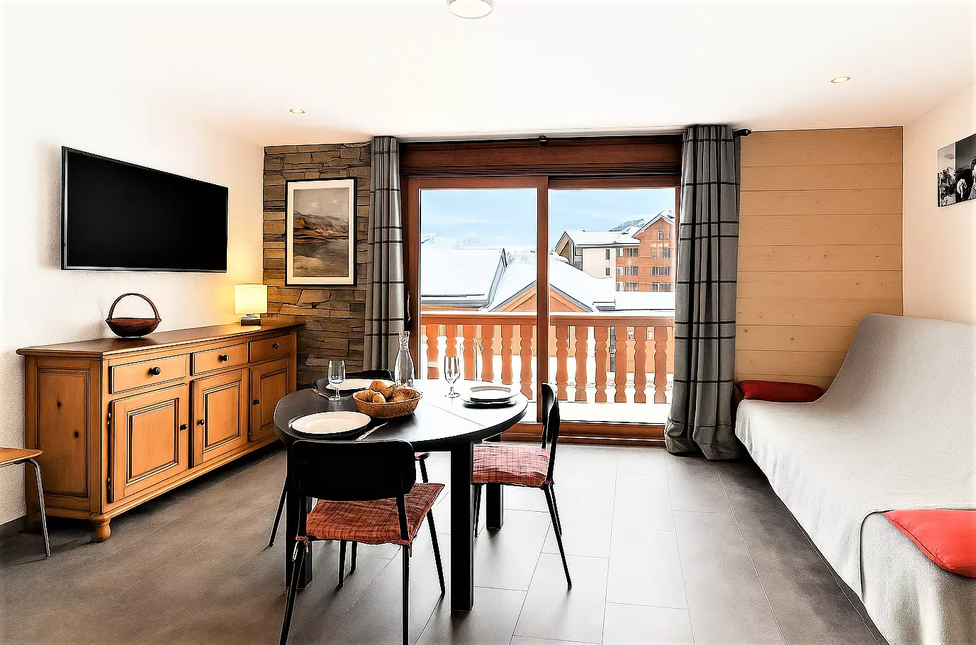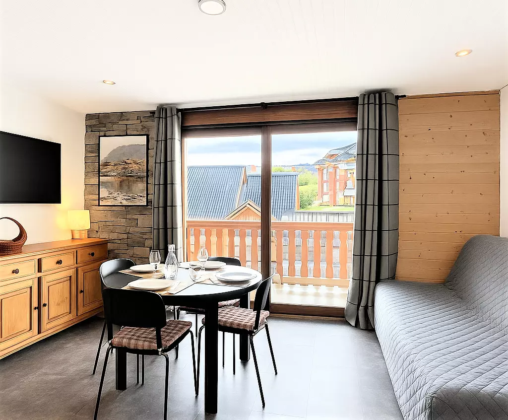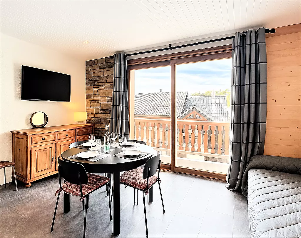 • A living room with a folding bed for 2 people, a fixed sofa, a flat-screen television and a dining area for 4 guests.