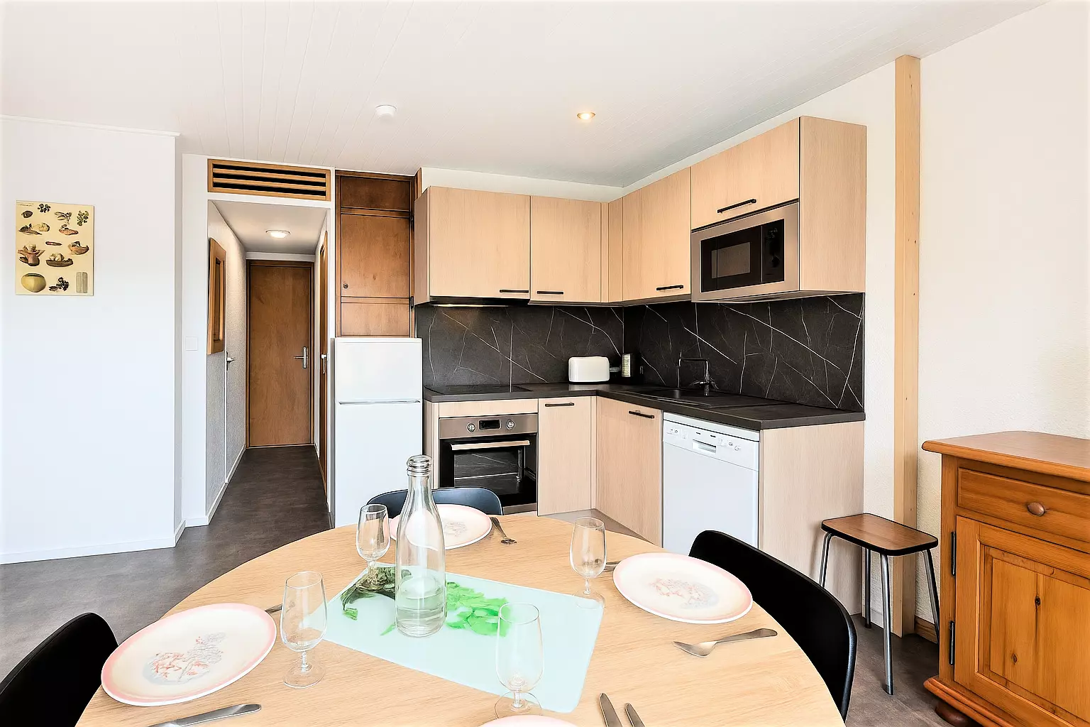 • A fully equipped open kitchen: ceramic hob, traditional oven, microwave, refrigerator, dishwasher, electric coffee pod machine, kettle, toaster, etc.