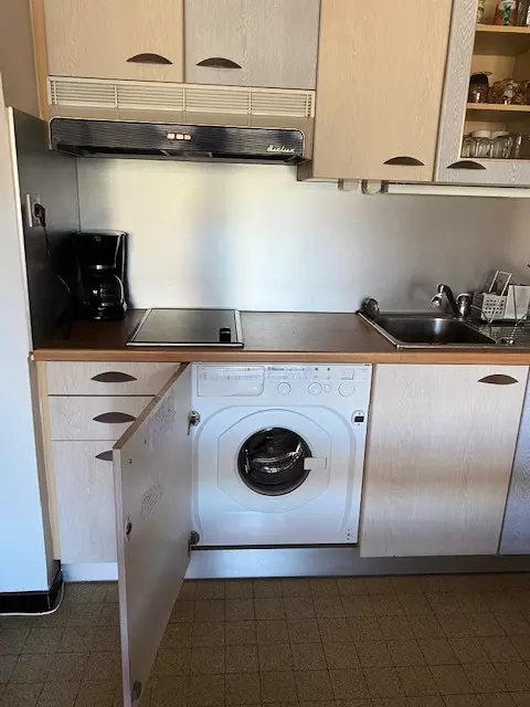 Kitchen equipped with 2 ceramic hobs, microwave, electric coffee maker, toaster, washing machine.