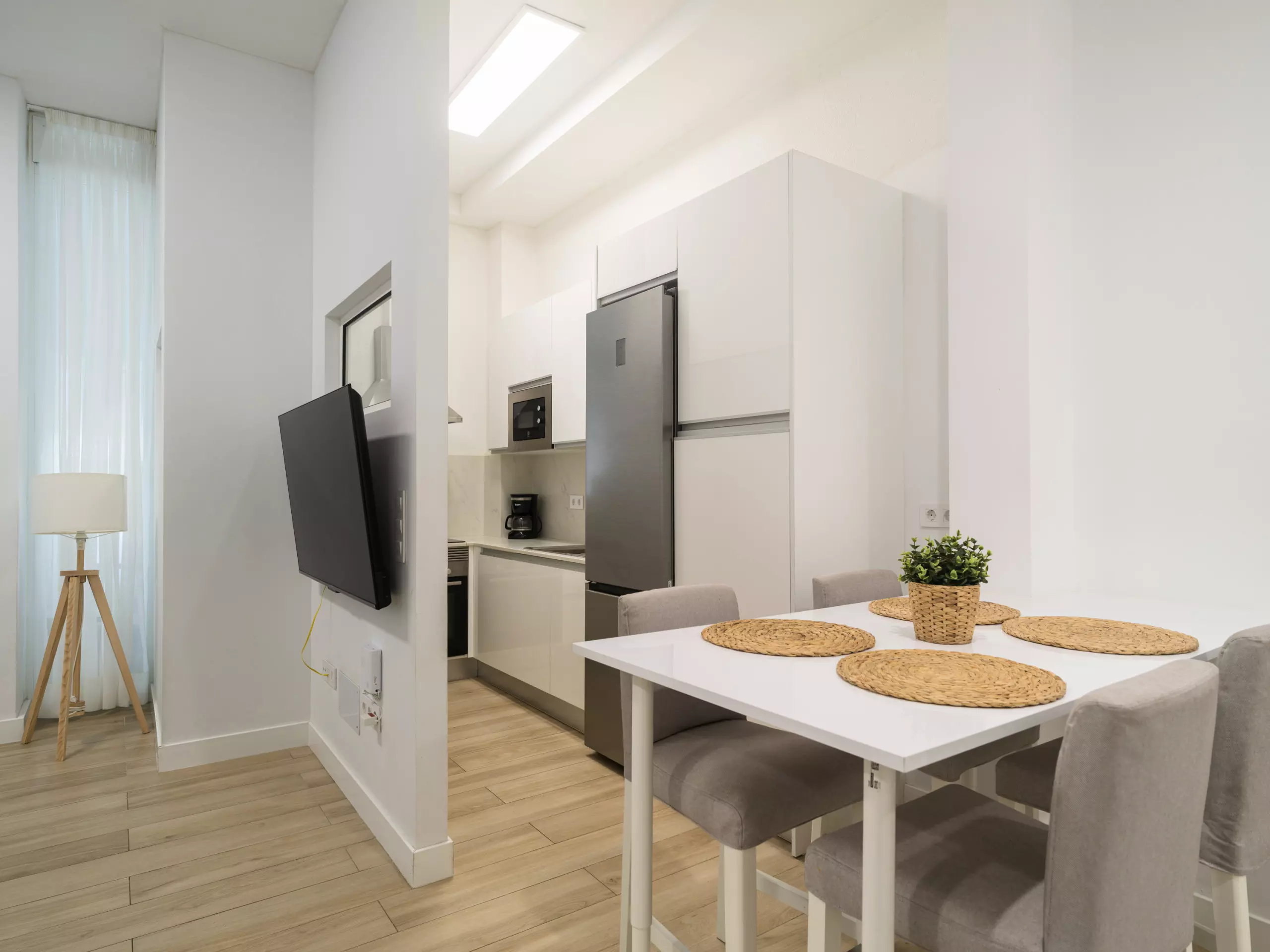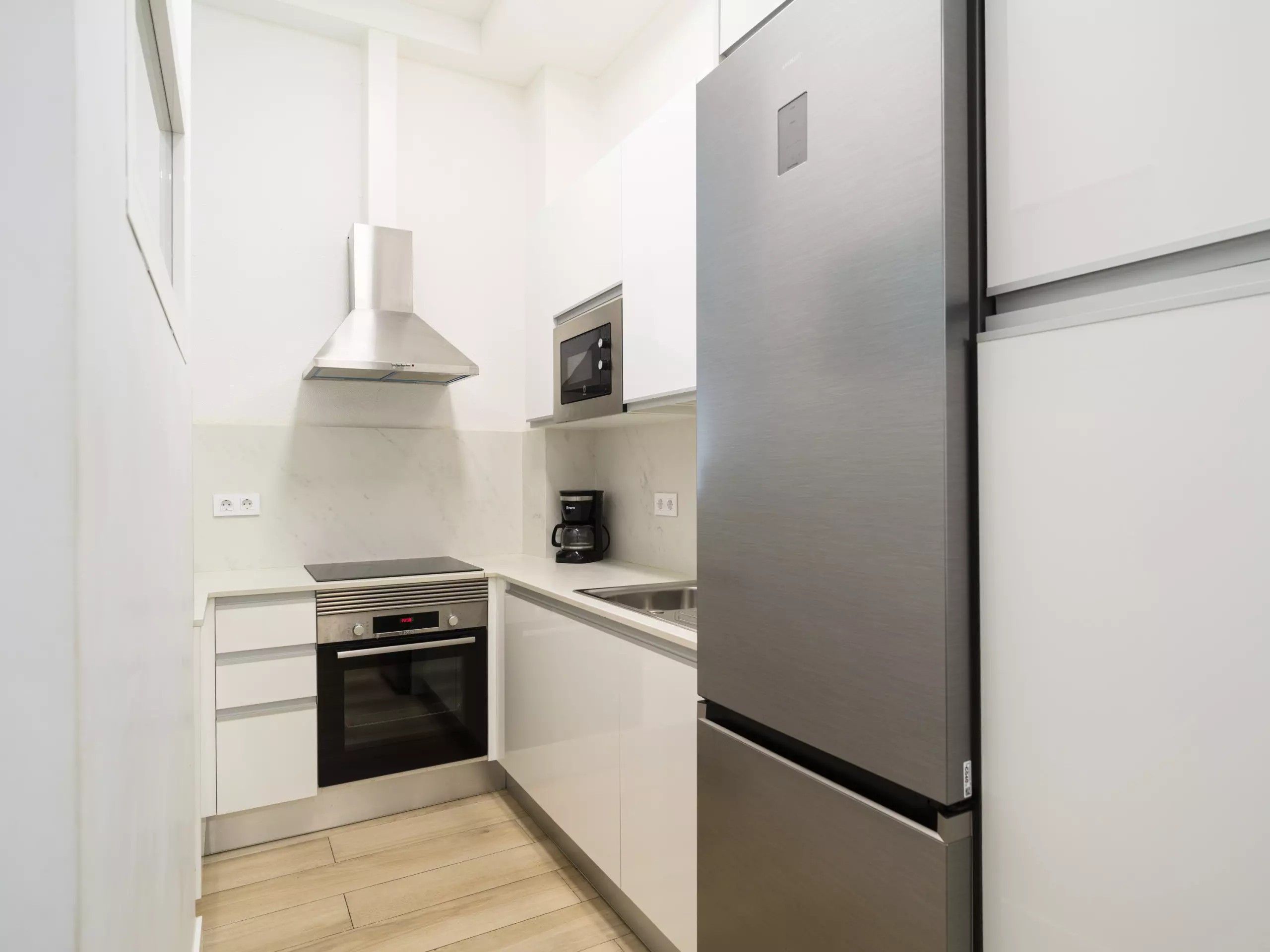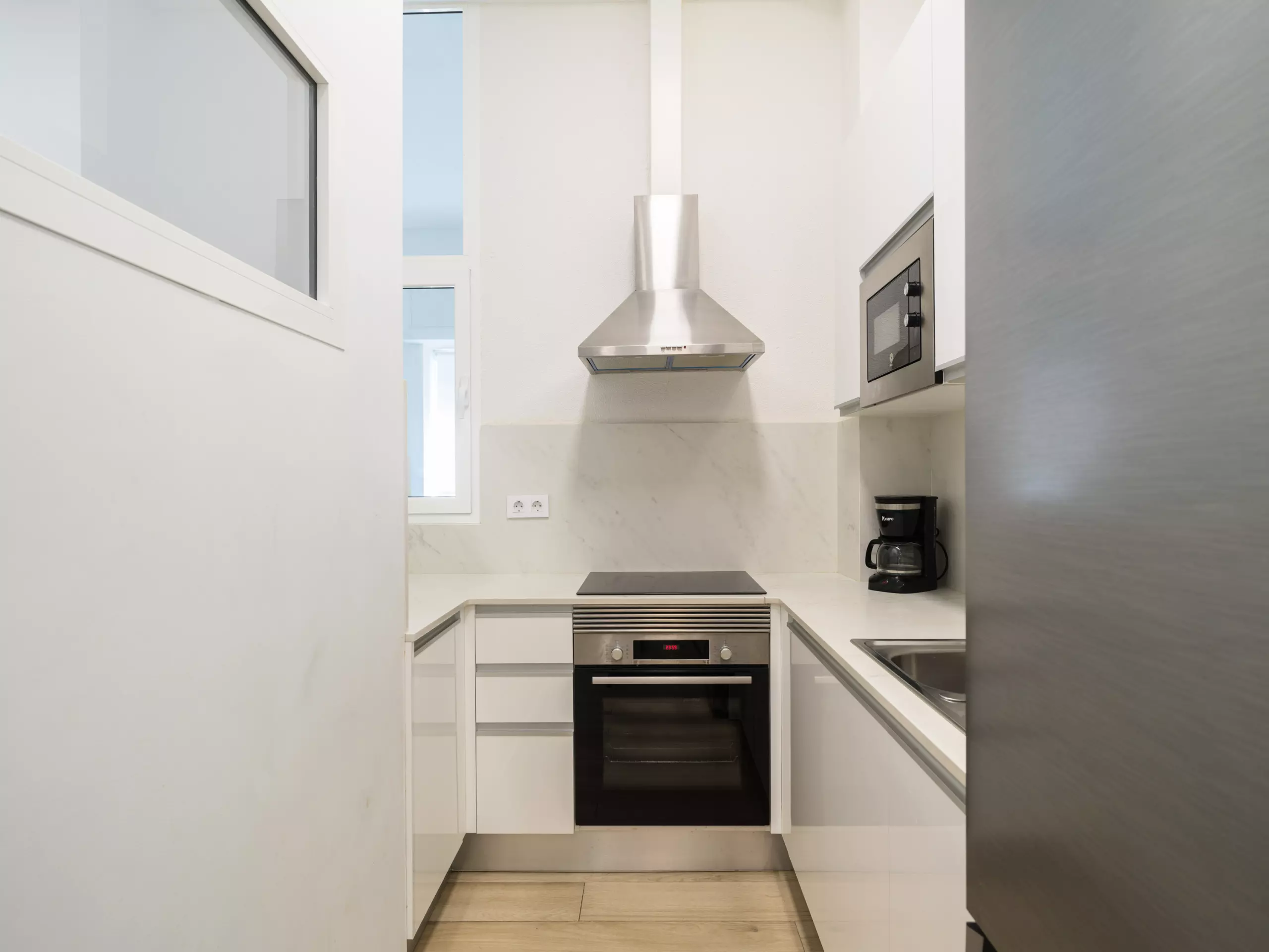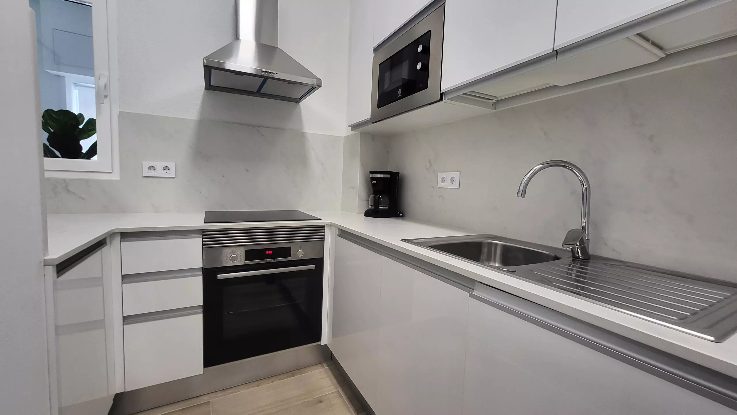 The independent kitchen is fully equipped with the latest generation of appliances, including an induction hob, refrigerator, freezer, washing machine, oven, microwave, coffee maker, toaster, kettle, juicer, and a complete set of dishes and kitchen utensils. This allows guests to prepare meals and enjoy gastronomic moments in the apartment.