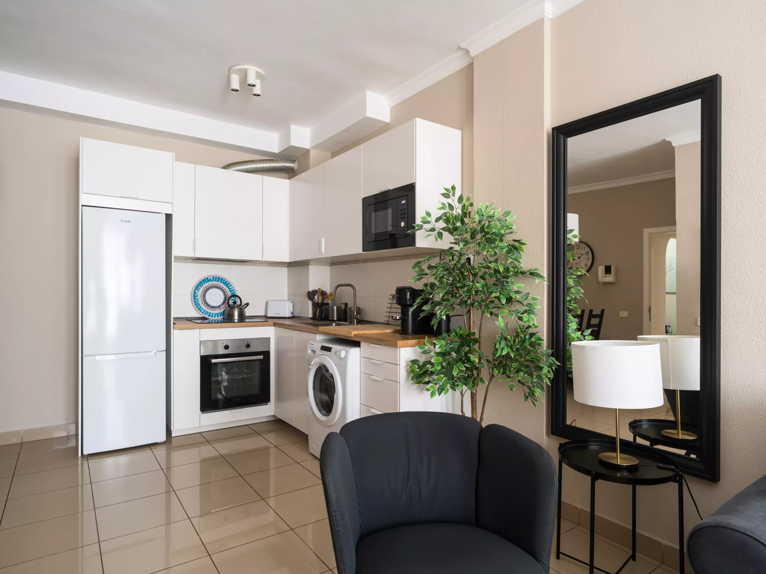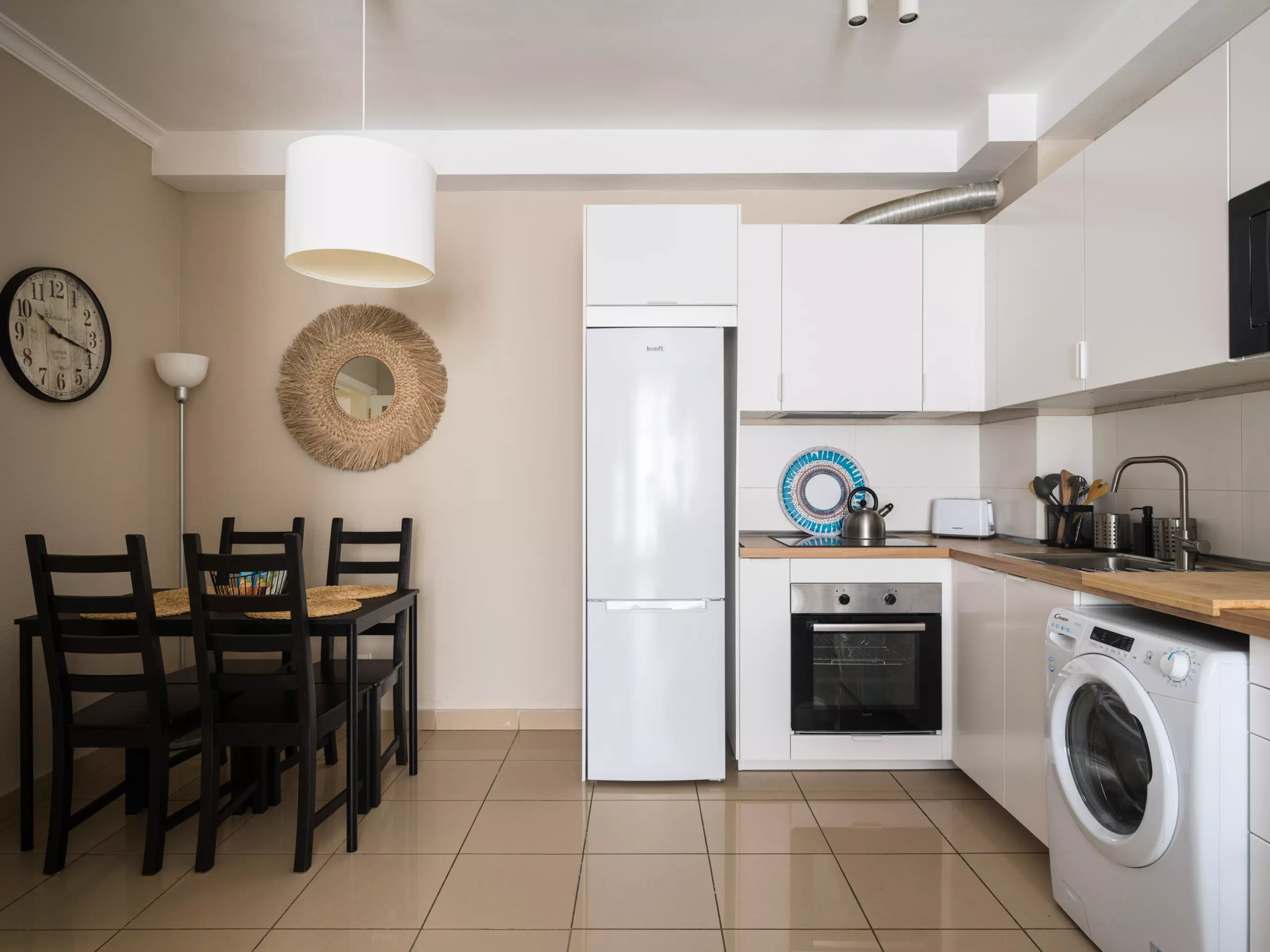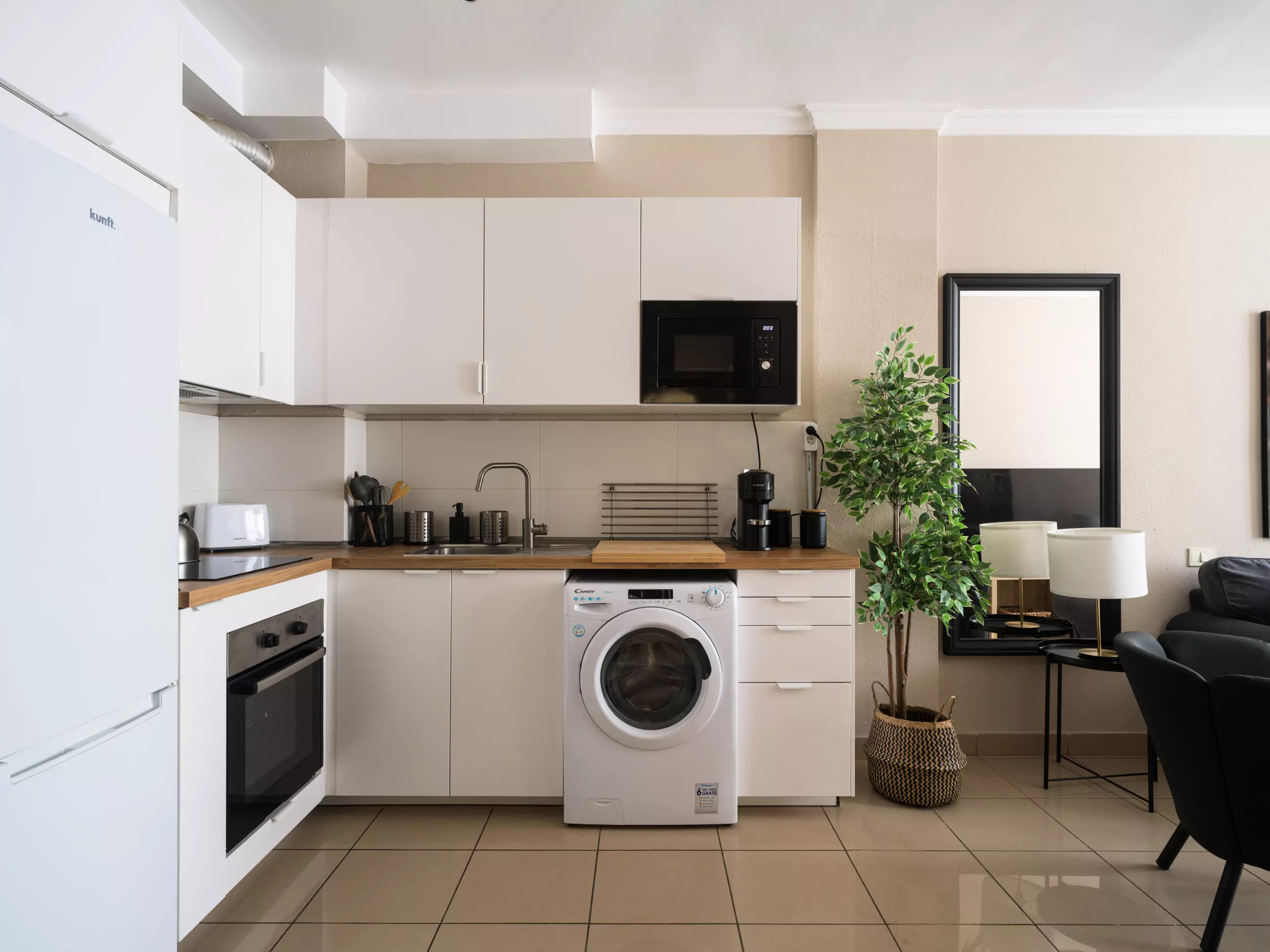 The open-plan kitchen is fully equipped with modern appliances, including a refrigerator, freezer, washing machine, oven, and a full range of kitchen equipment. Perfect for preparing delicious meals and enjoying gourmet moments with family or friends.