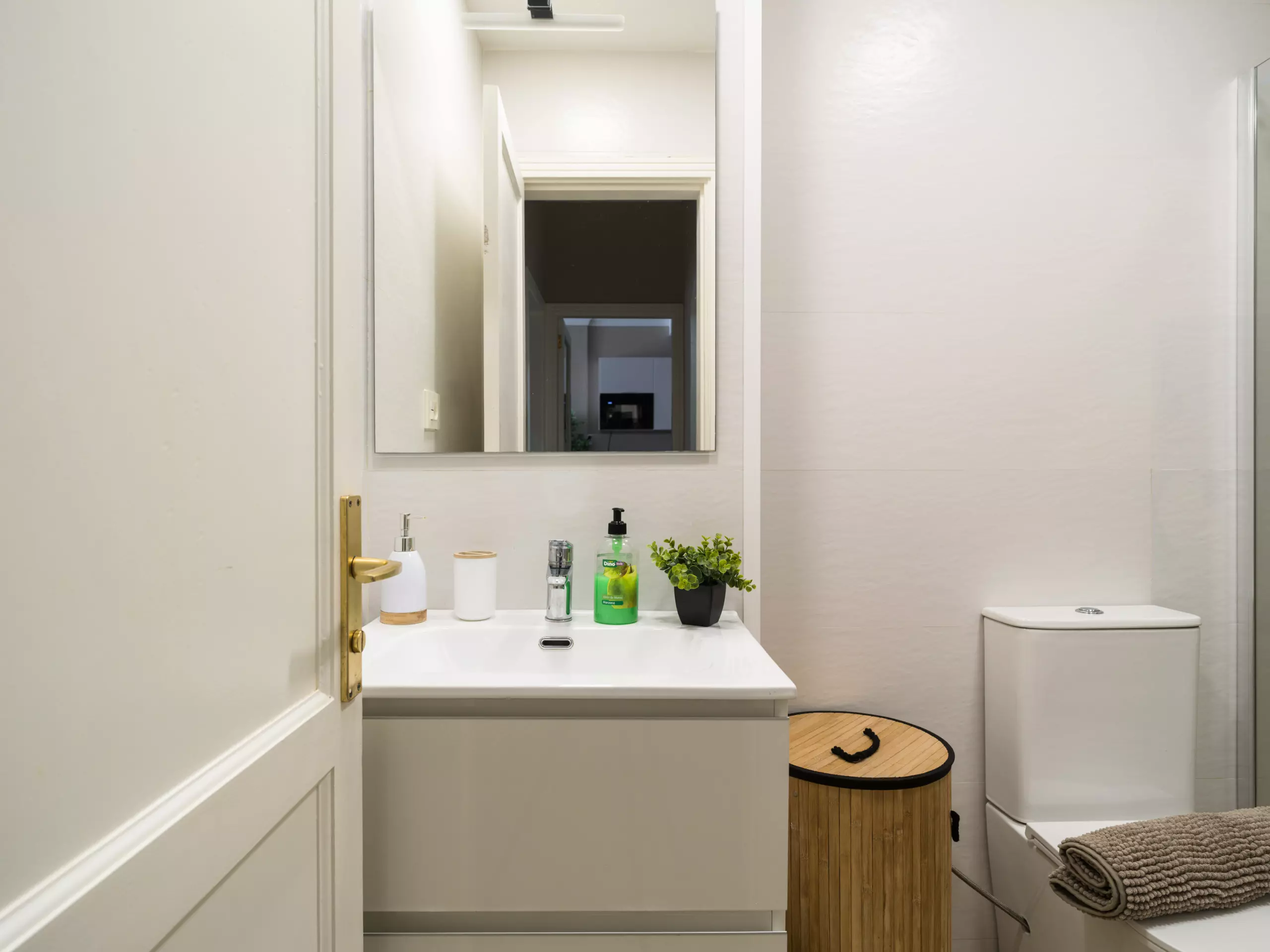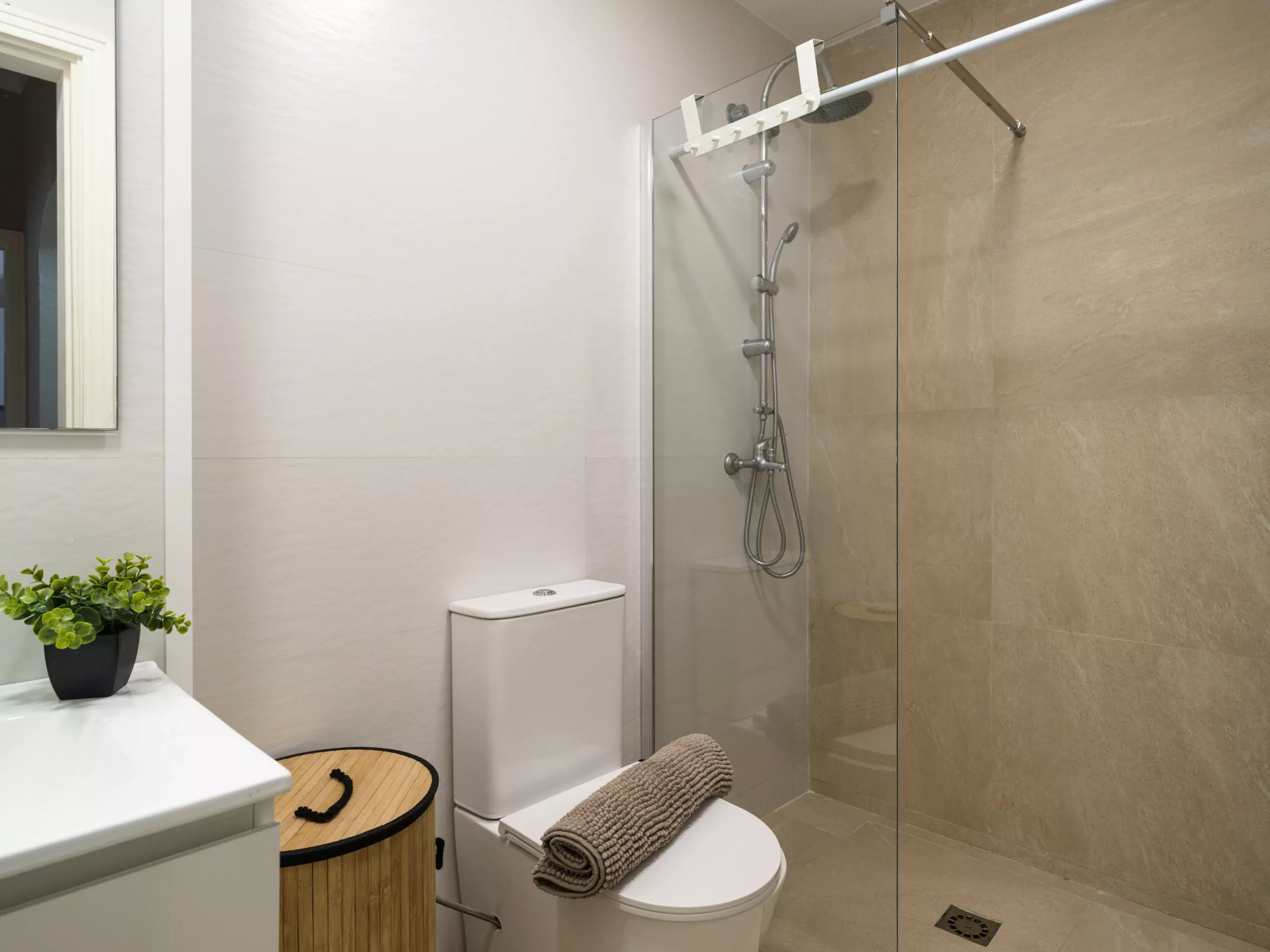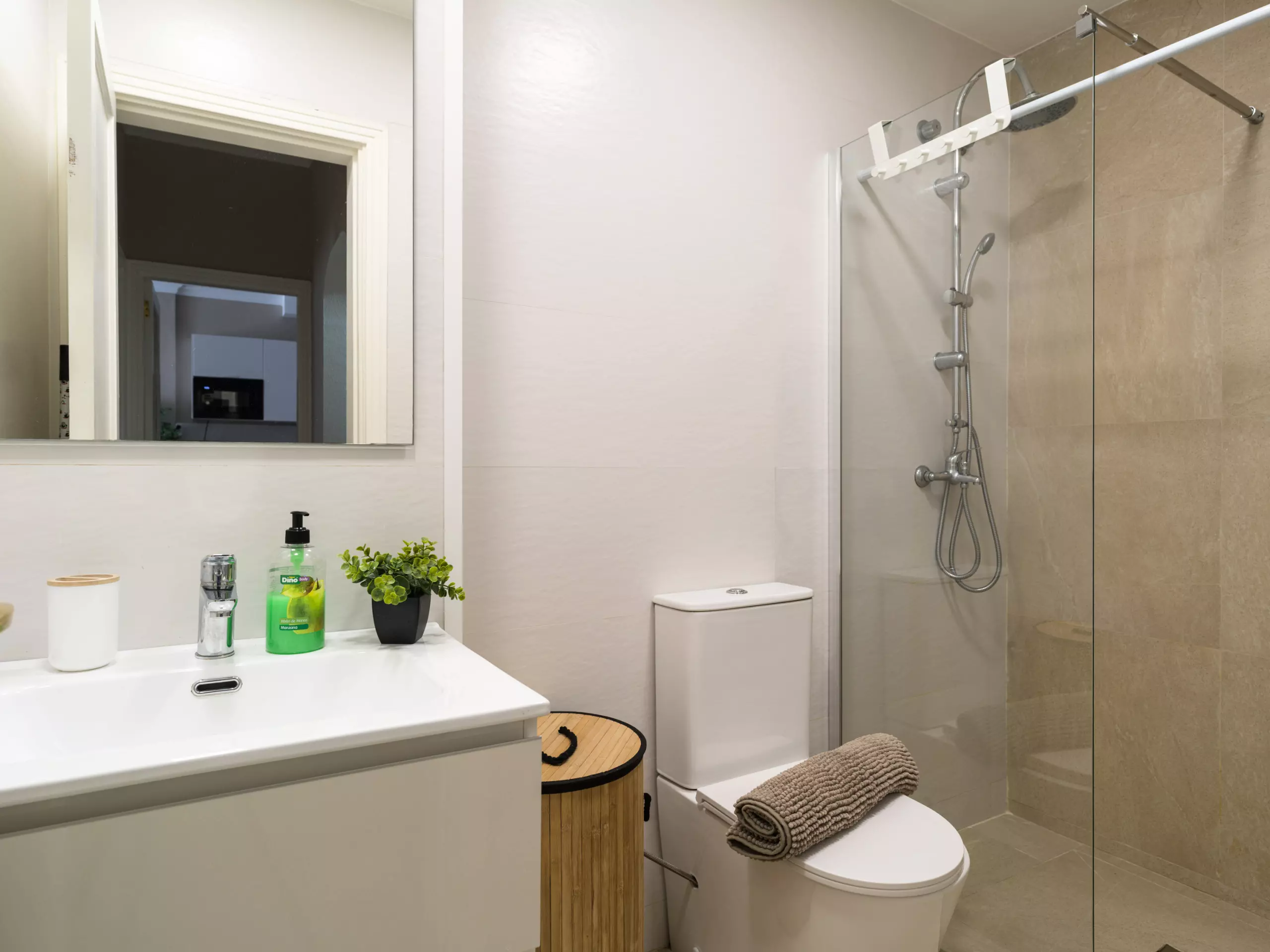 The bathroom with shower is designed to meet all needs, offering comfort and functionality. Additionally, the apartment includes amenities such as Wi-Fi, air conditioning, an iron, and a Smart TV to make your stay more enjoyable.