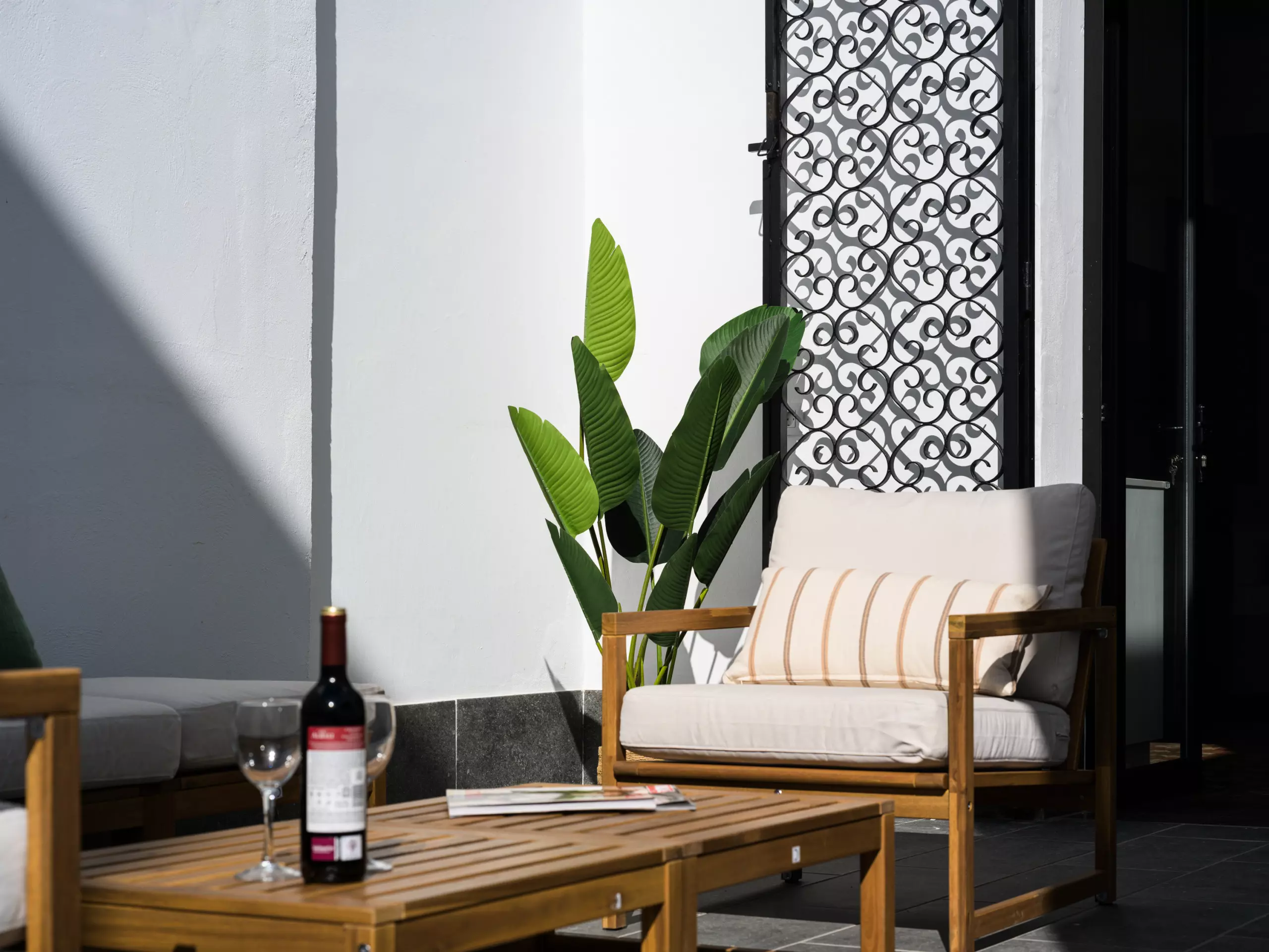 One of the most special corners is its large terrace of approximately 40 m², equipped with comfortable armchairs and areas of shade and sun. A perfect space for reading, sunbathing, enjoying a quiet conversation, or simply relaxing outdoors in complete privacy.