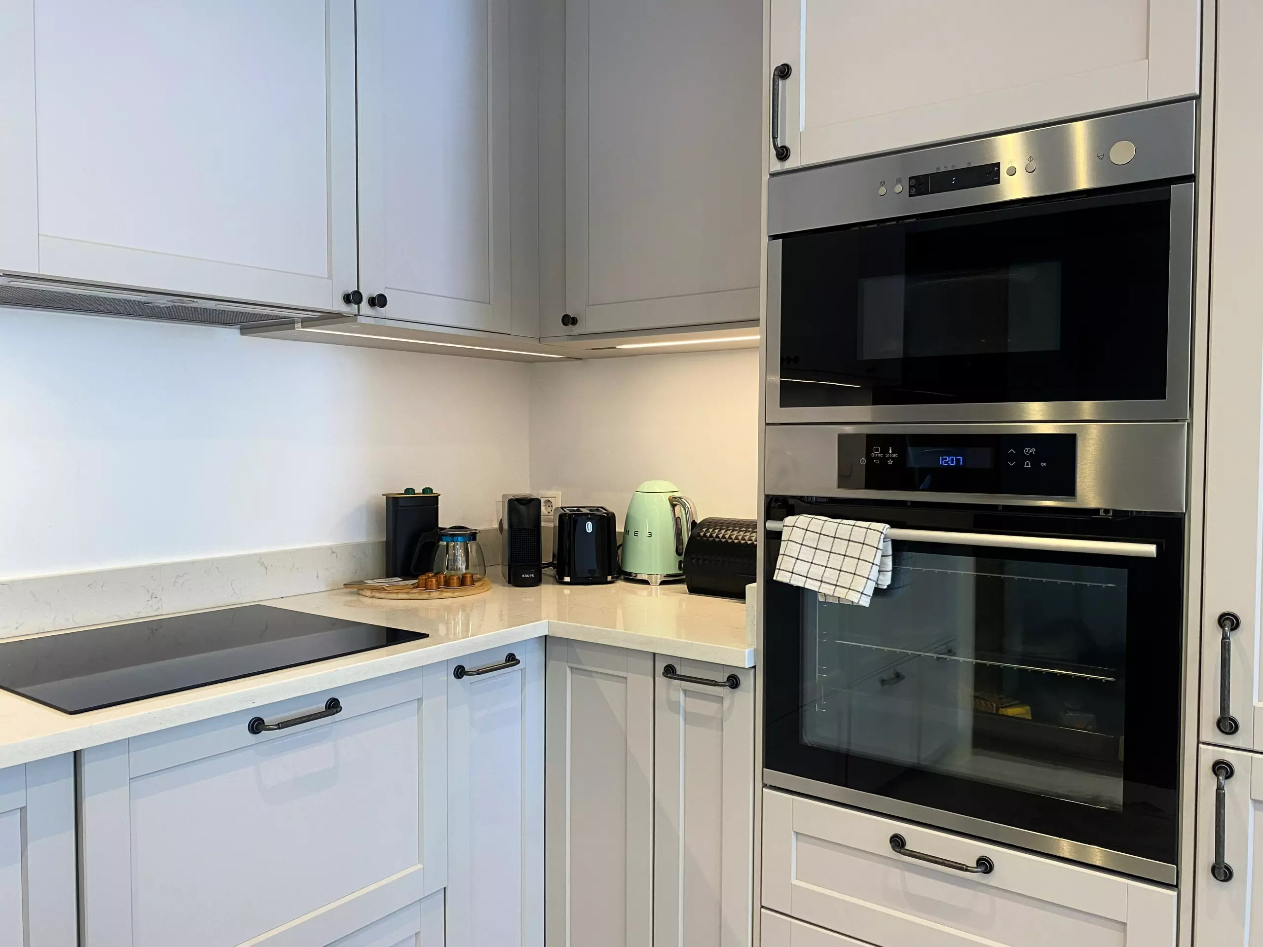 A fully equipped kitchen with dishwasher, oven, microwave, refrigerator and washing machine