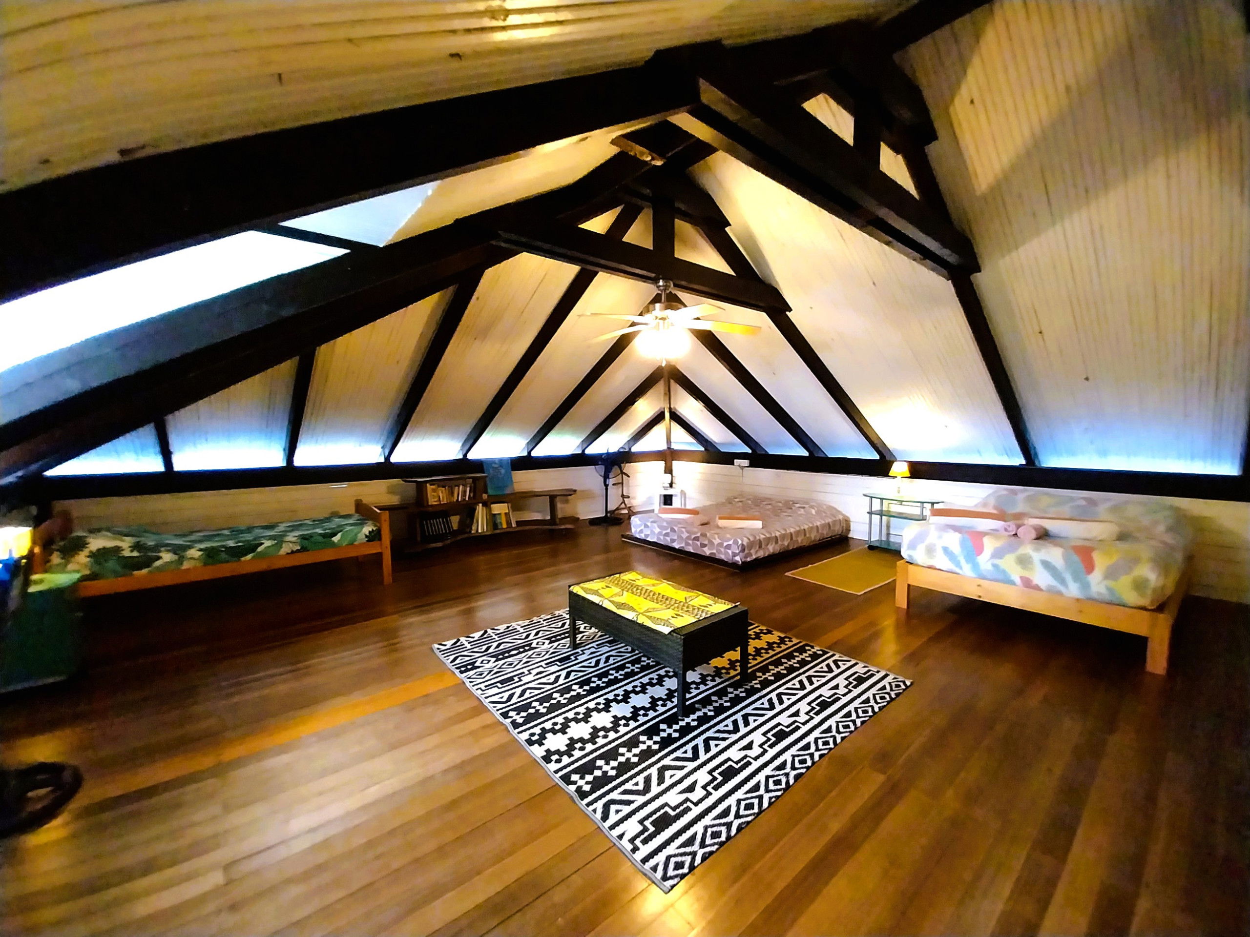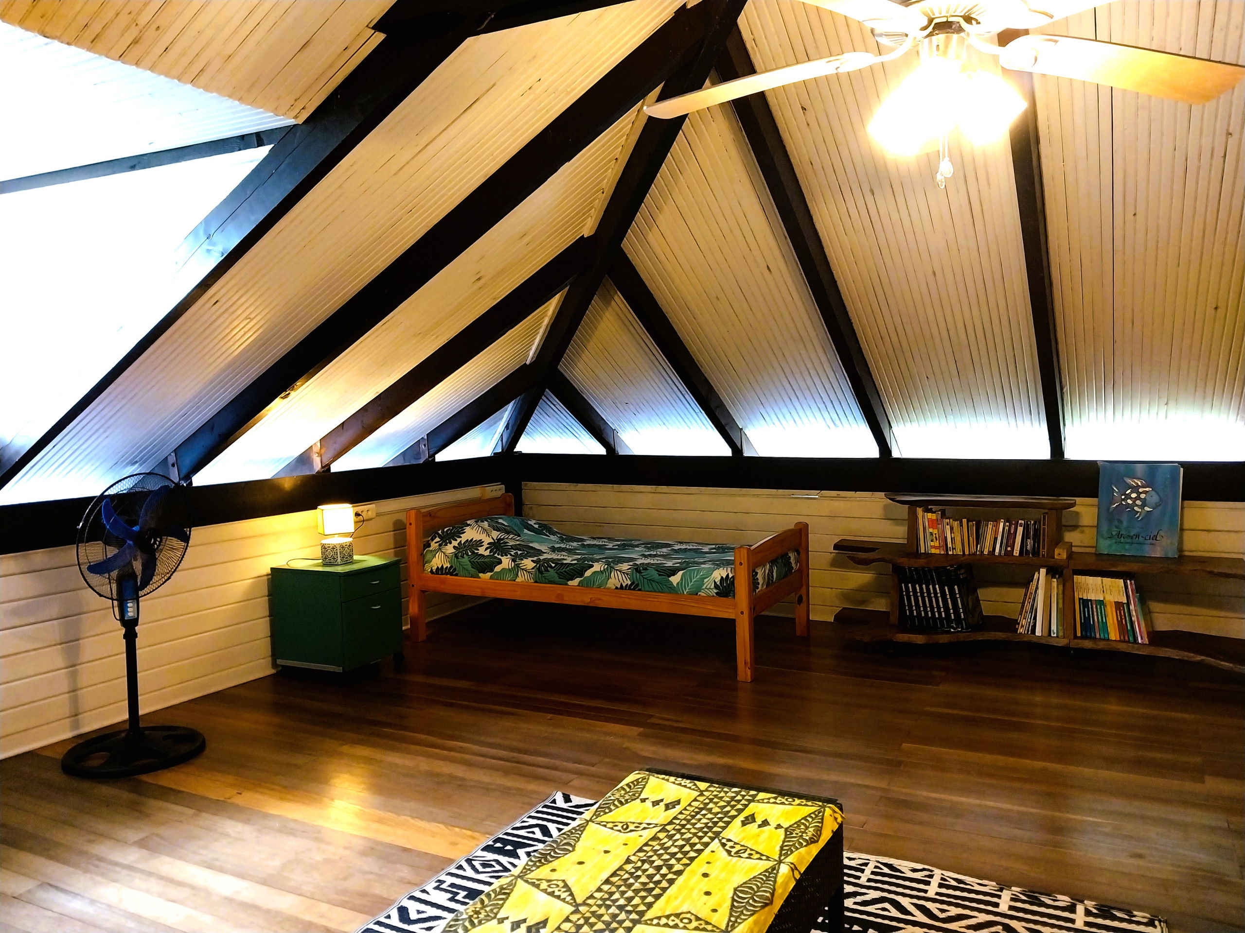 Finally, on the upper floor, a large mezzanine fitted with 2 double beds and 1 single bed, equipped with 2 fans, offers a friendly and airy space, perfect for children or a group of friends.