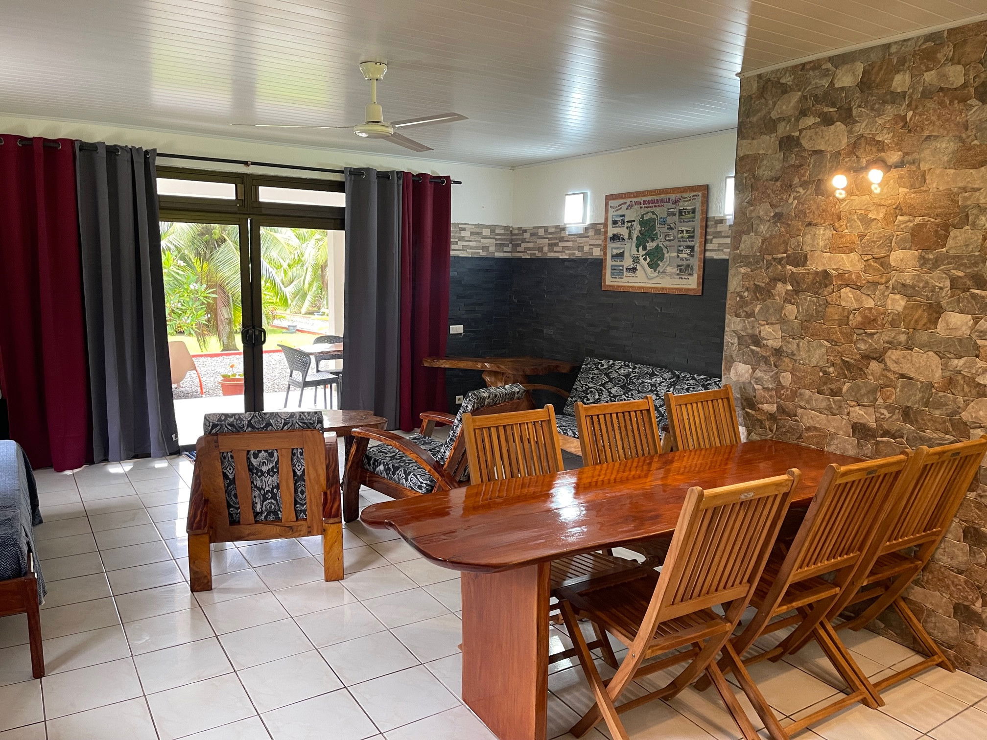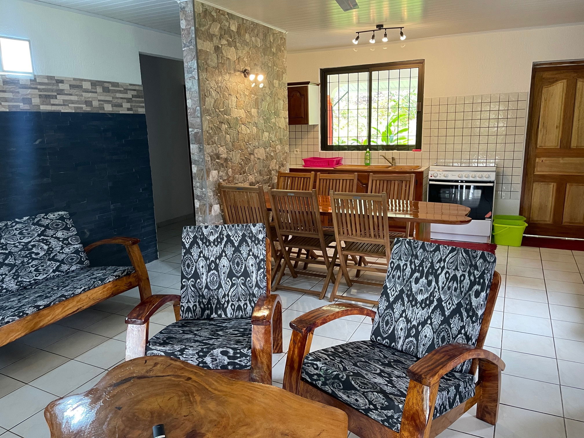 Your favourite spot will be the terrace where you can relax, have your meals and prepare your barbecues... The villa also benefits from a very large wooded garden which offers an ideal playground for children. At the back of the property there is the Maroe river, a place charged with "Mana" and a noni plantation.