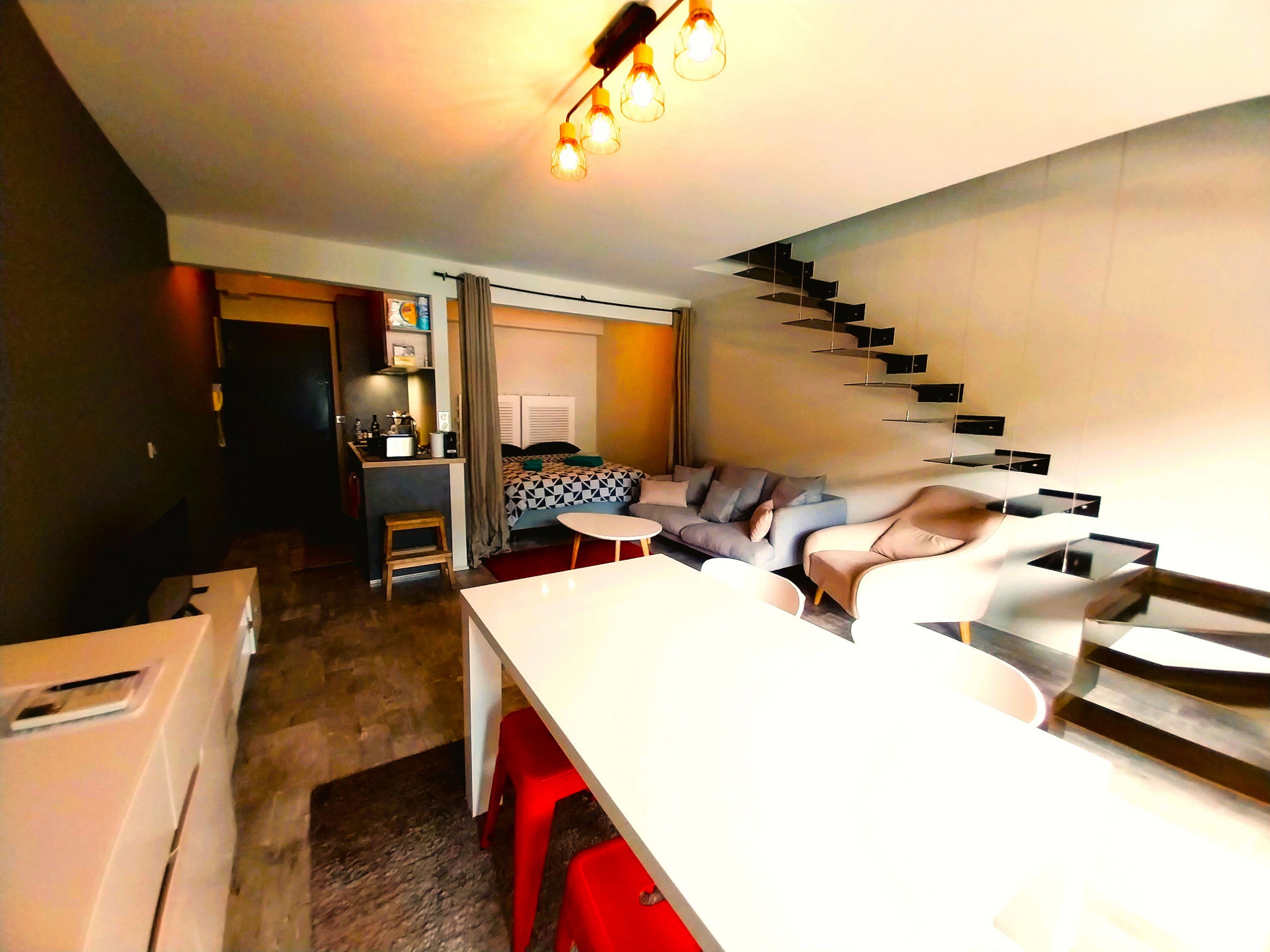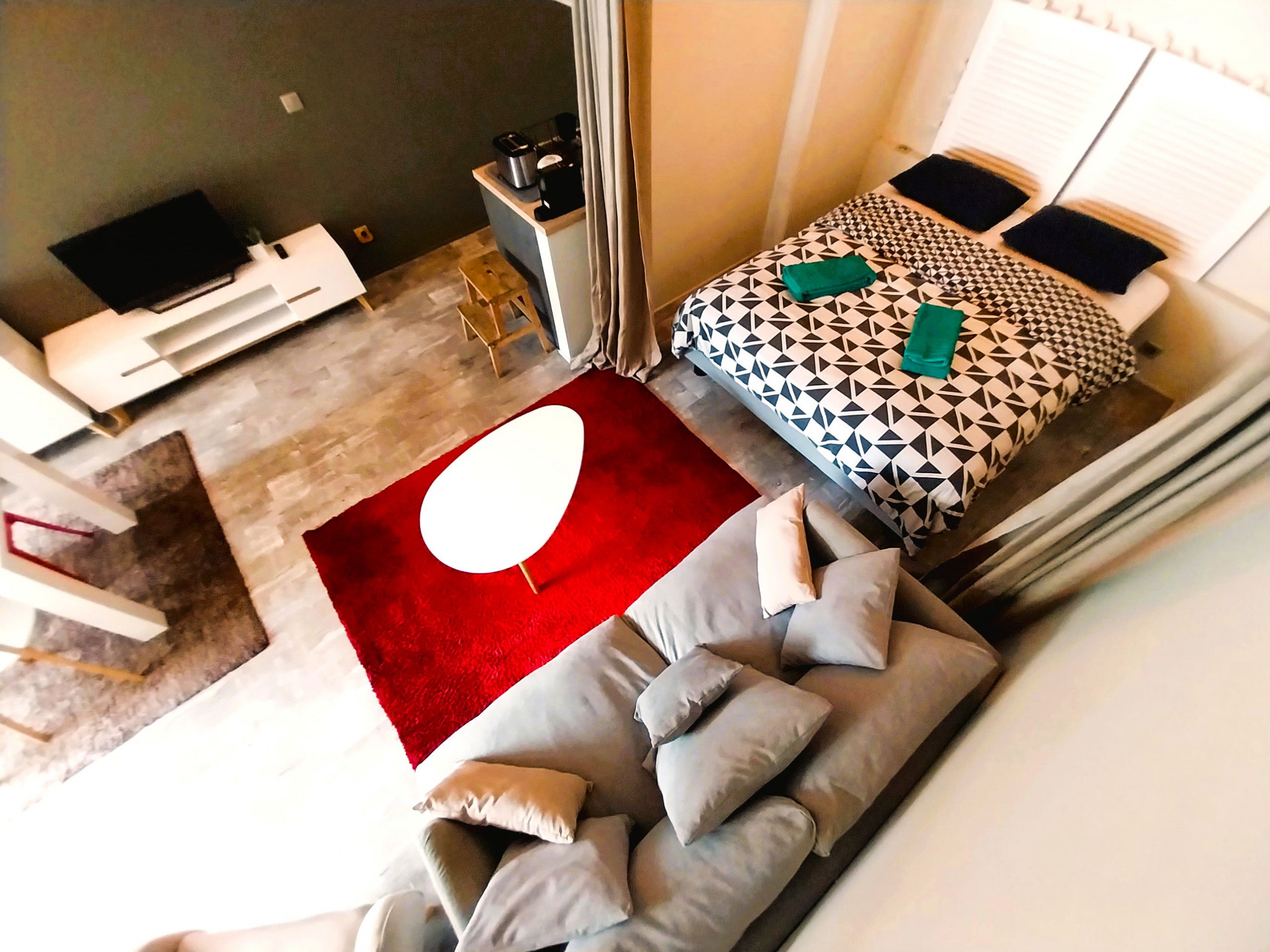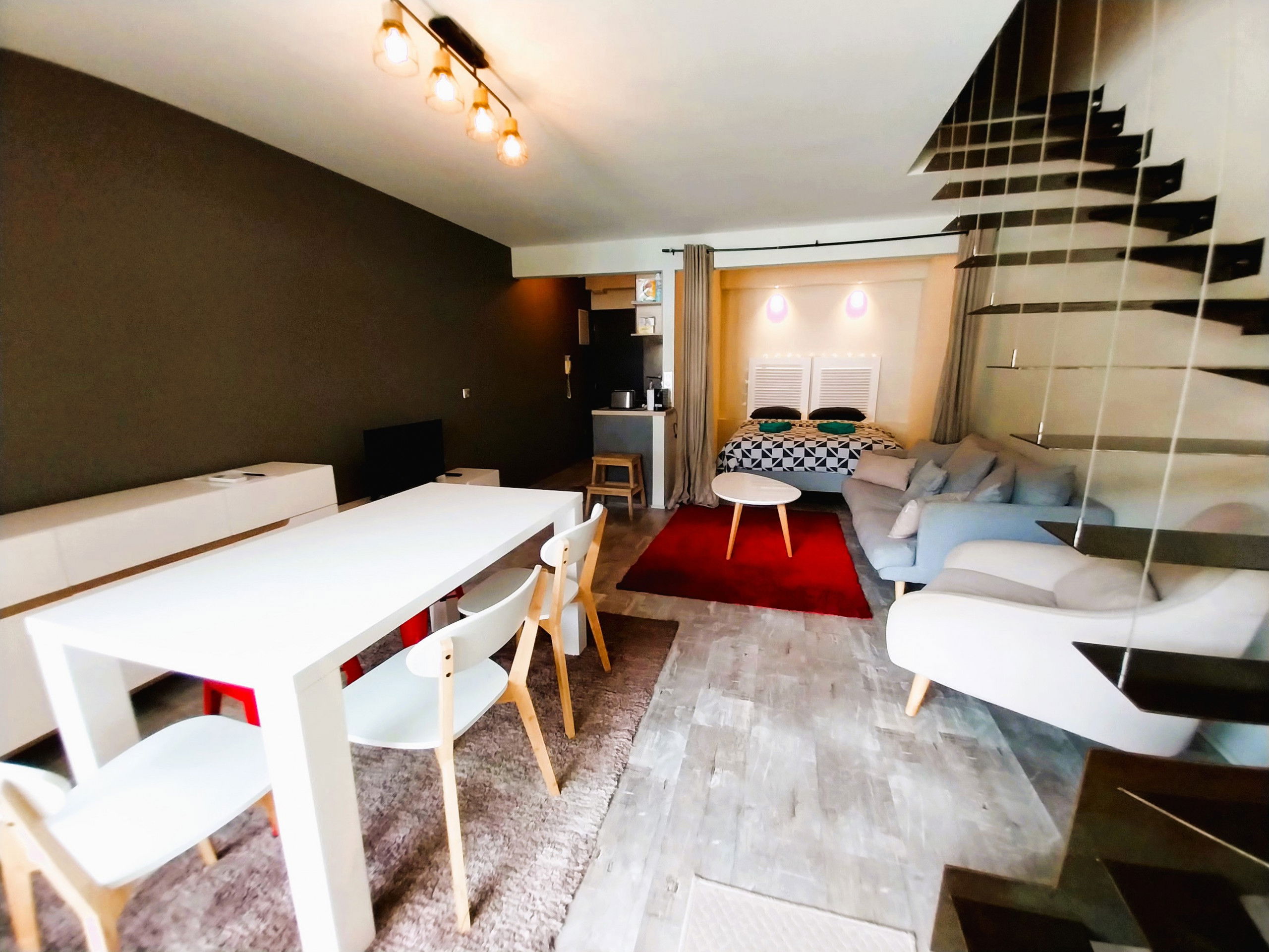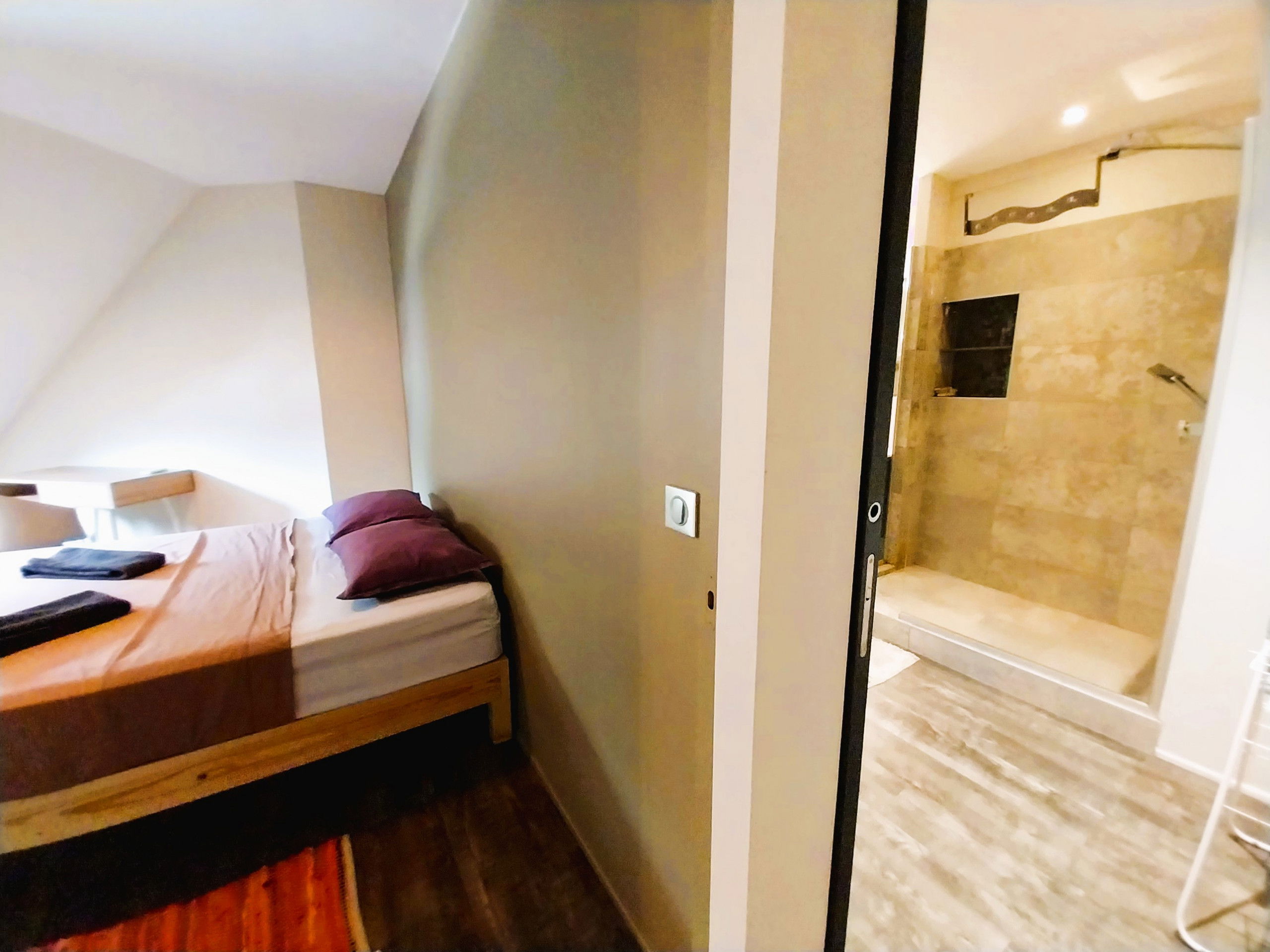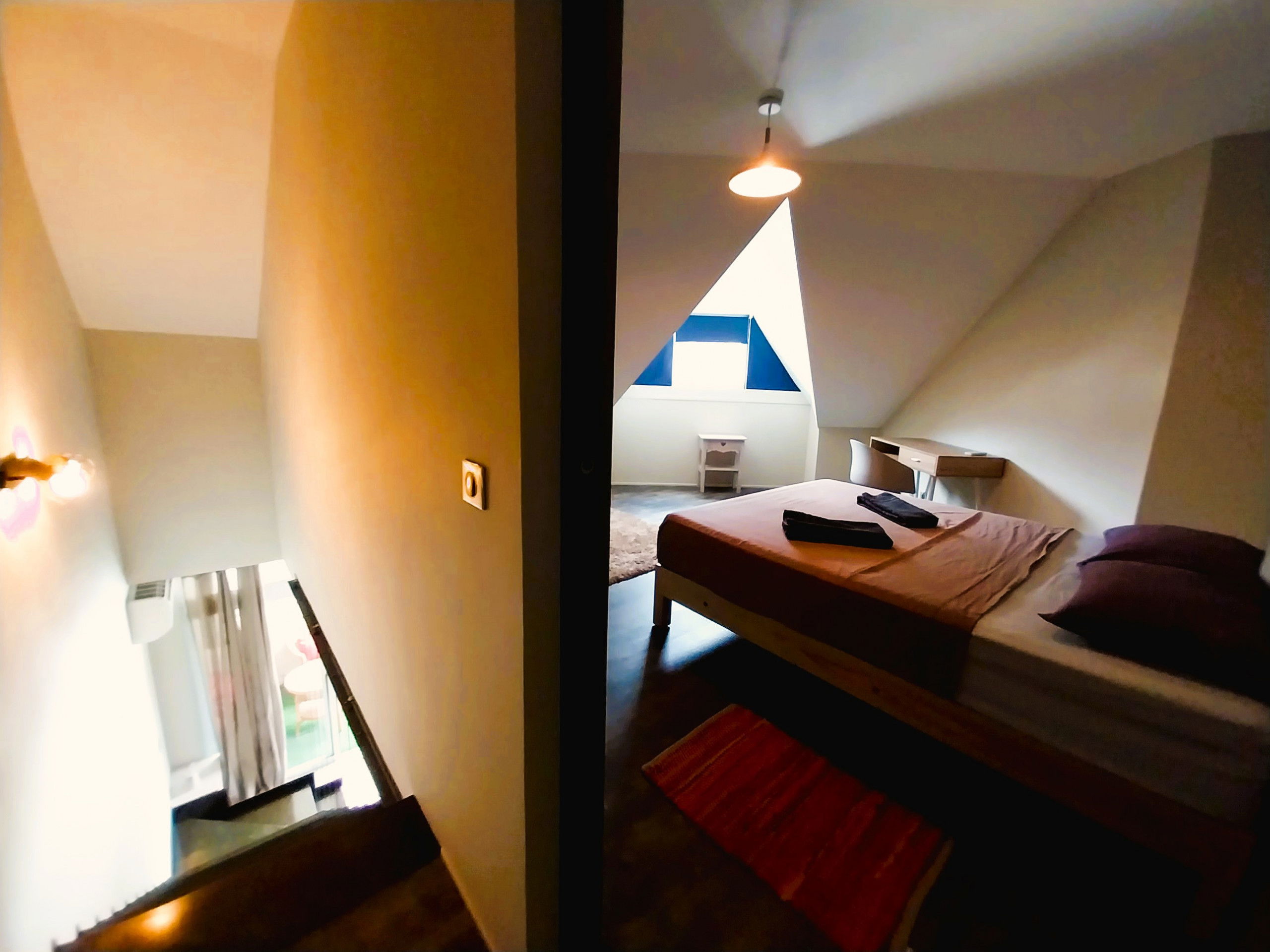 The flat is spacious, bright, functional and resolutely modern, offering all the comforts you need. It can easily accommodate up to four people. On the level, an intimate alcove offers a private sleeping area for two people with a Queen Size bed. The master bedroom is upstairs. Spacious and cosy, it has a queen-size bed and a study area. In the crevice at the back of the room on the left, you'll find the iron, ironing board and hoover. This is also where you'll find the bathroom, with its washbasin, washing machine, WC and large Italian-style shower in natural stone.