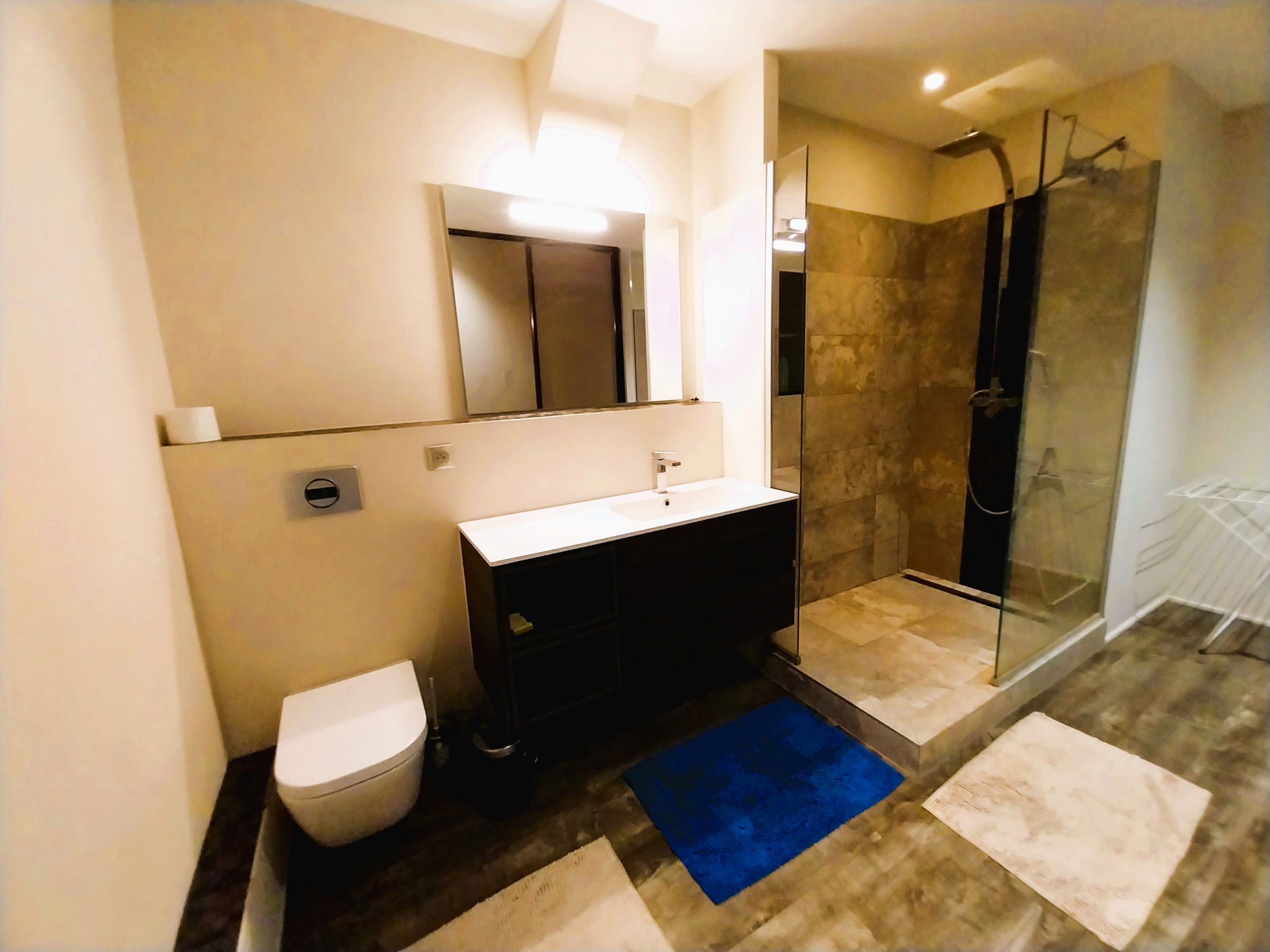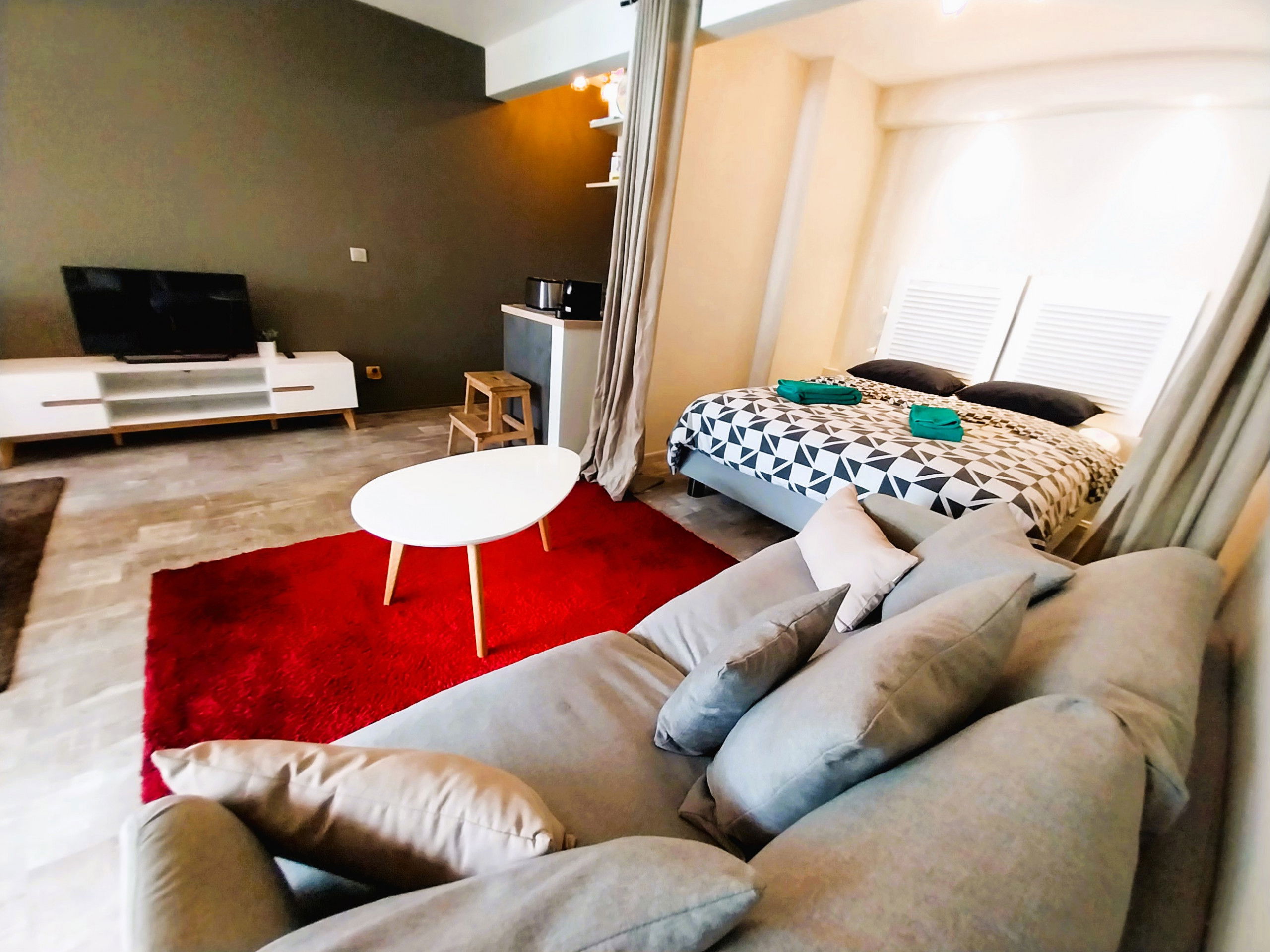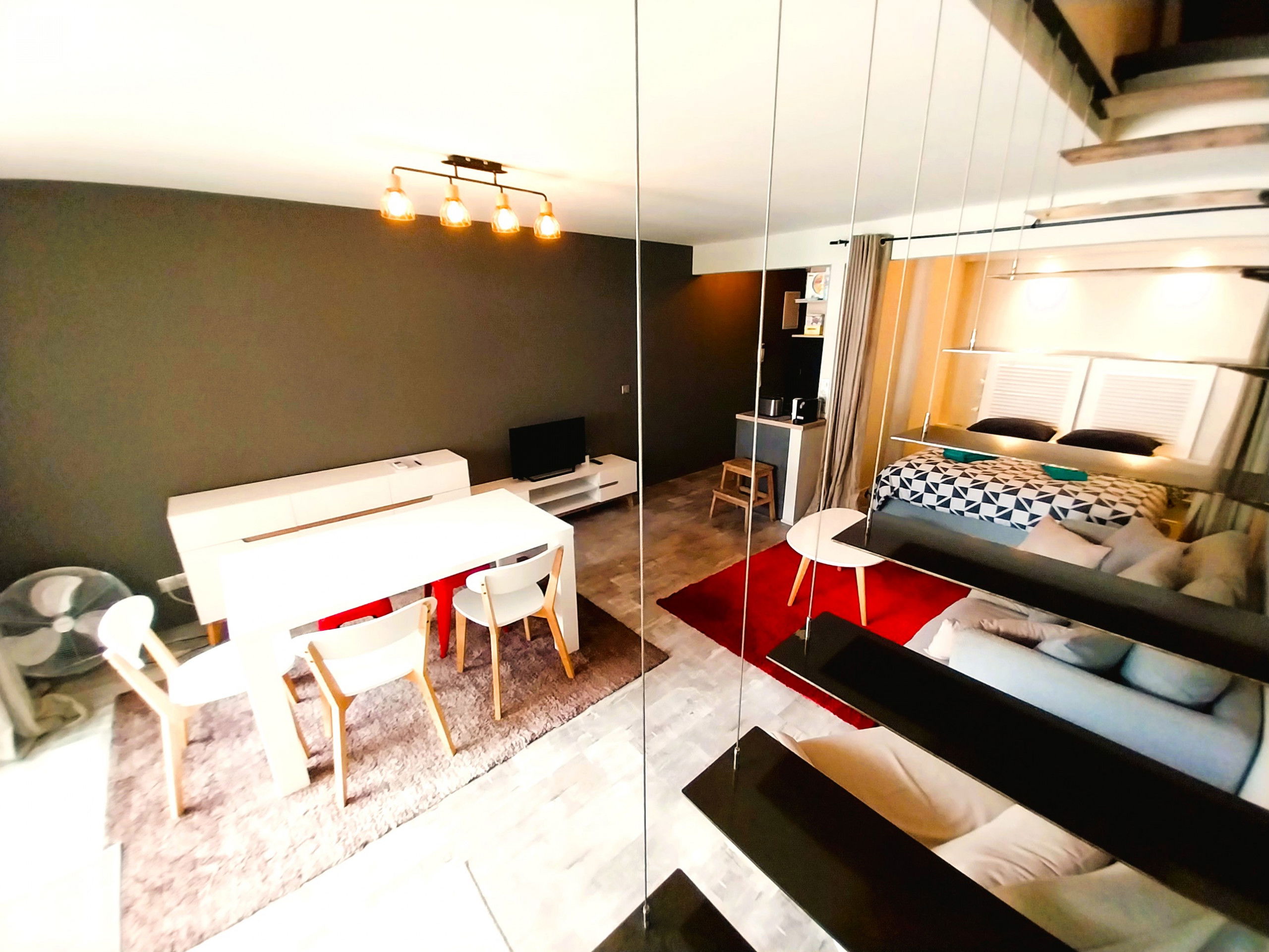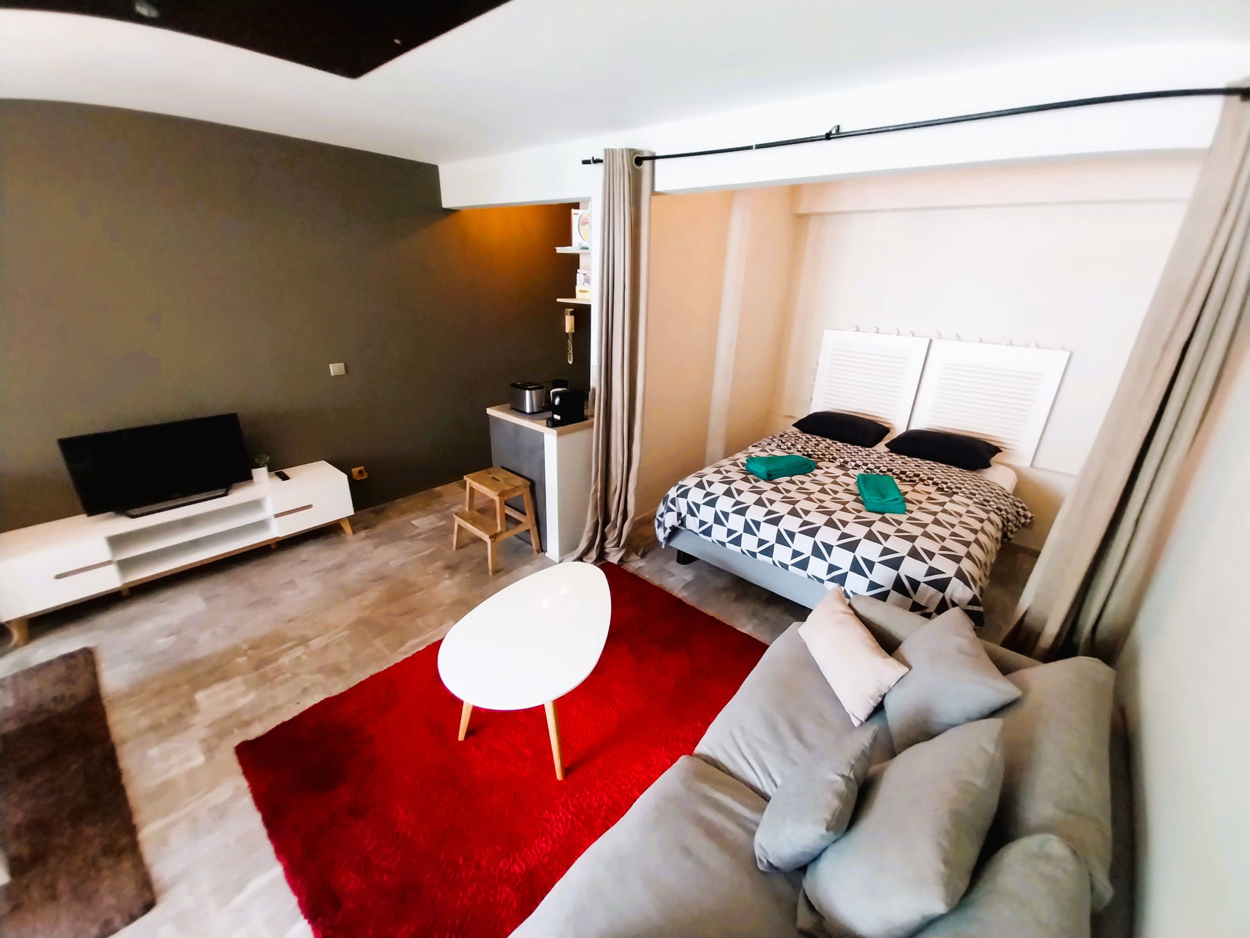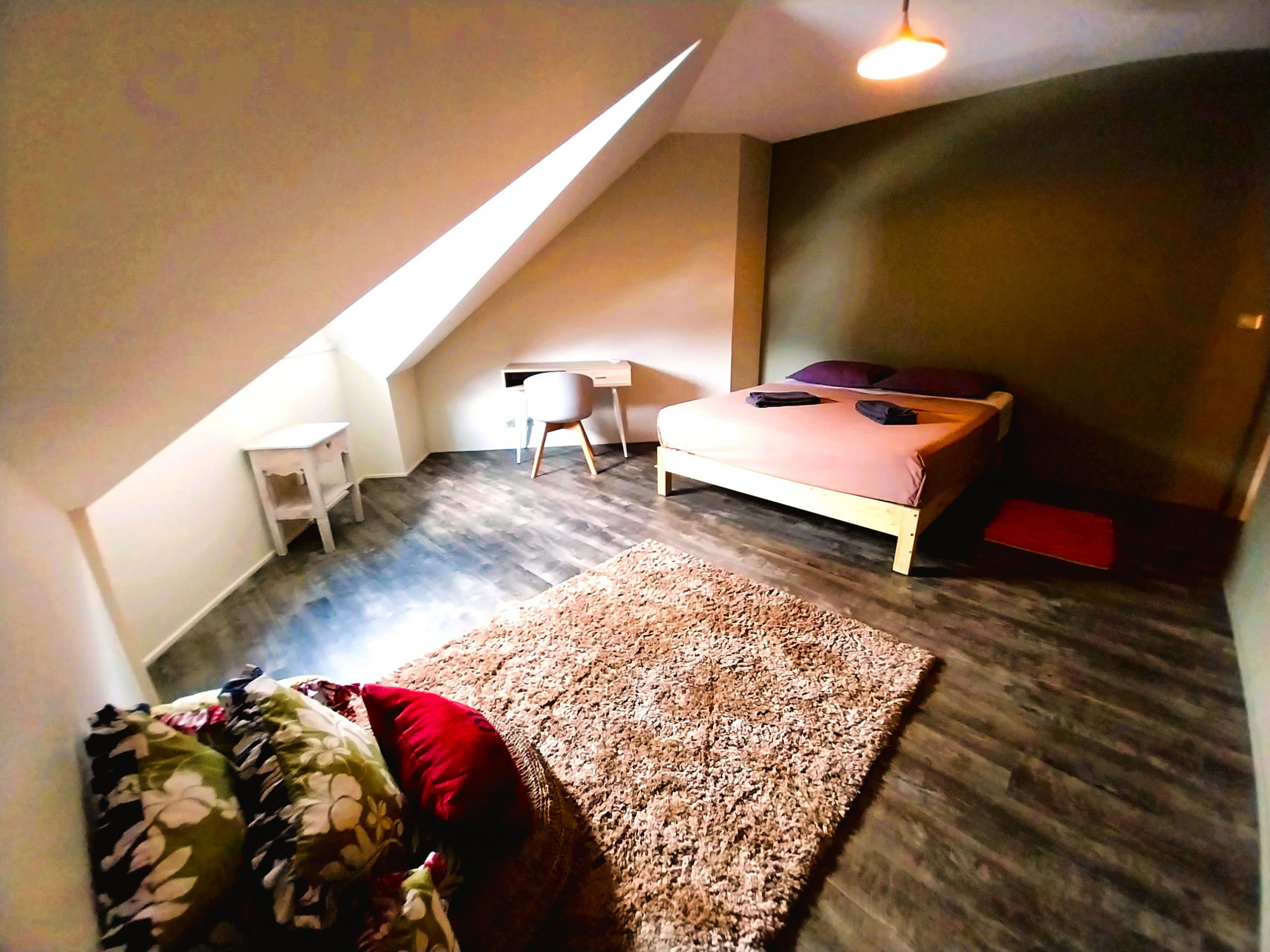 The flat is spacious, bright, functional and resolutely modern, offering all the comforts you need. It can easily accommodate up to four people. On the level, an intimate alcove offers a private sleeping area for two people with a Queen Size bed. The master bedroom is upstairs. Spacious and cosy, it has a queen-size bed and a study area. In the crevice at the back of the room on the left, you'll find the iron, ironing board and hoover. This is also where you'll find the bathroom, with its washbasin, washing machine, WC and large Italian-style shower in natural stone.