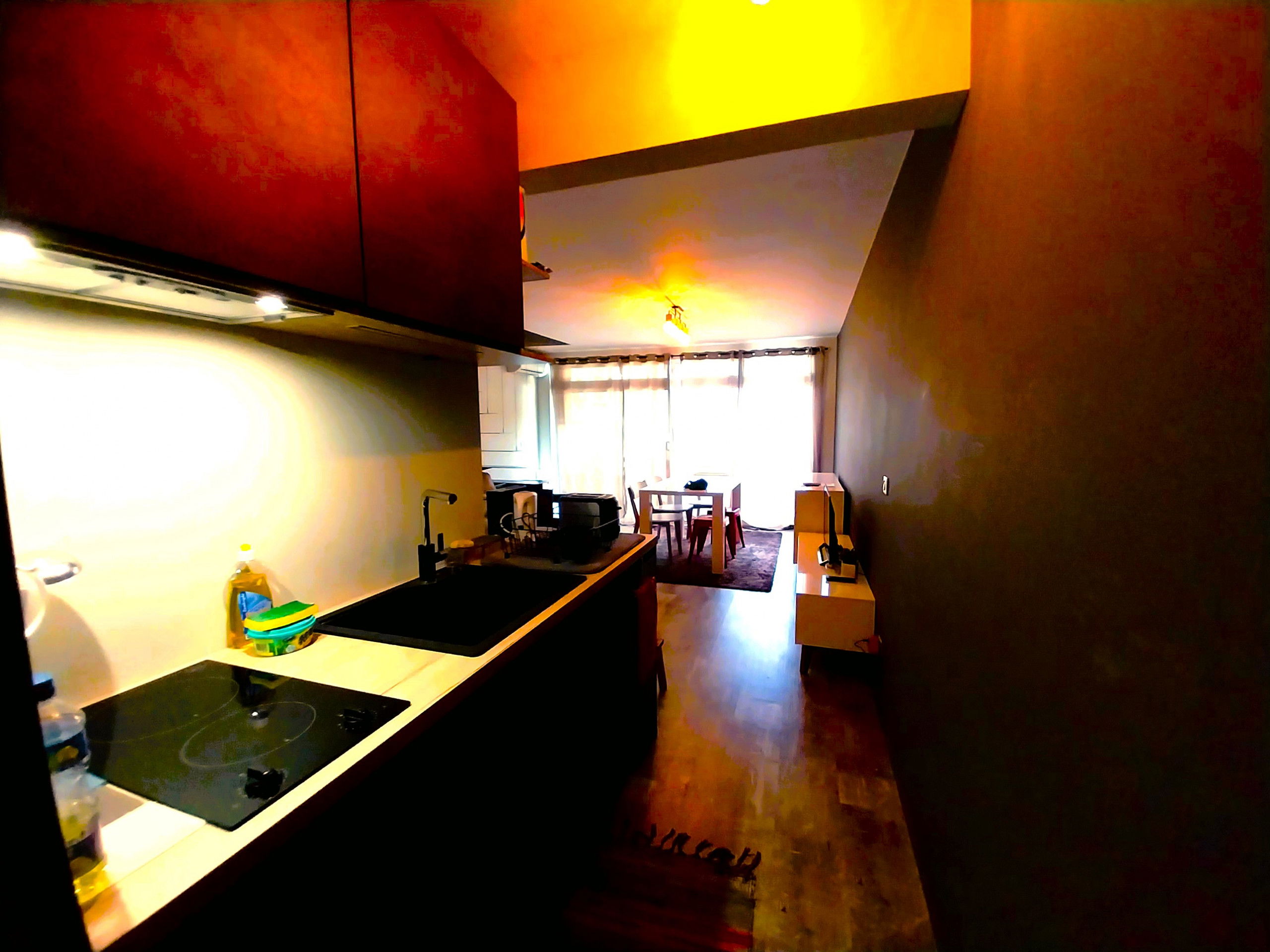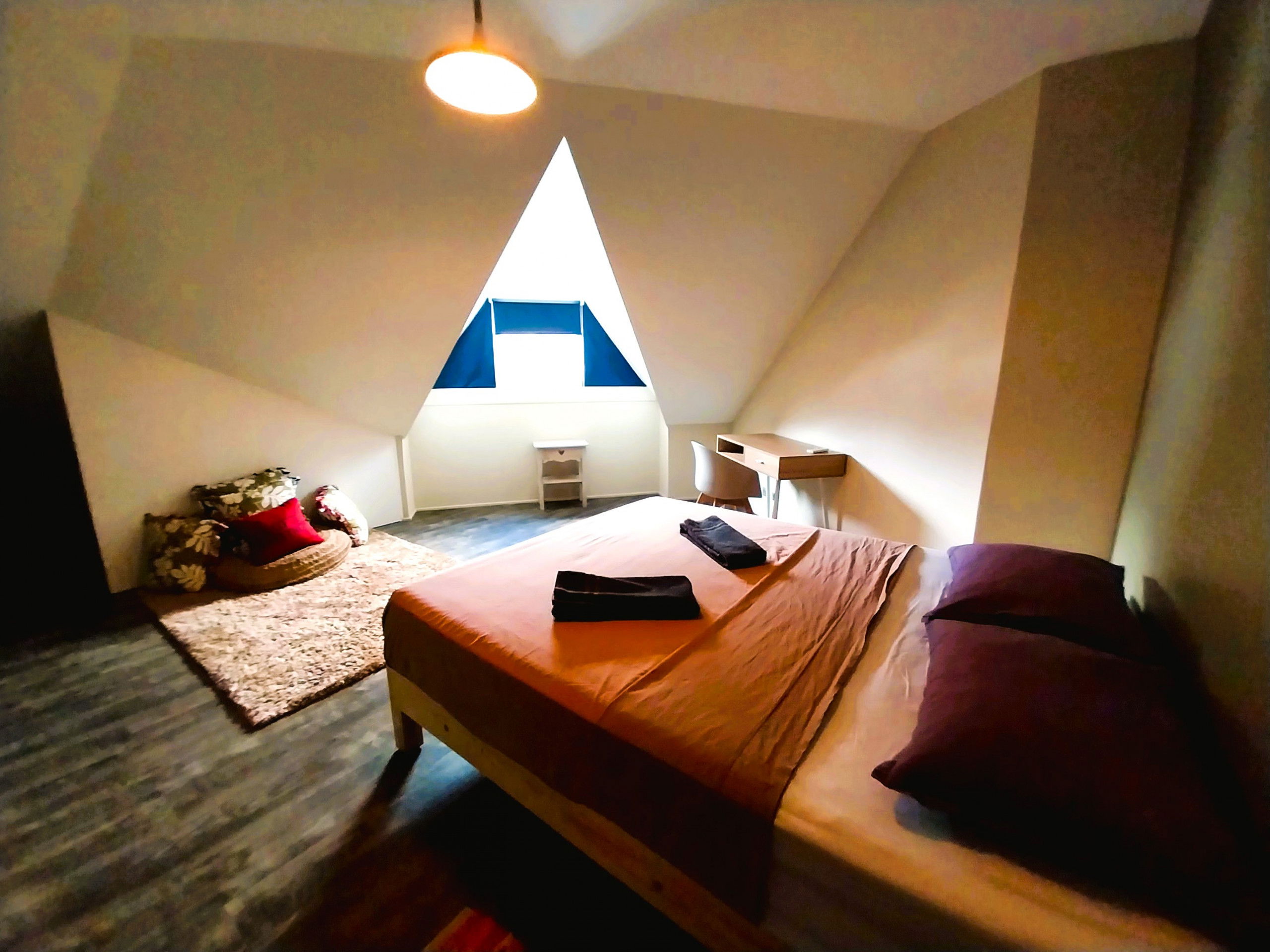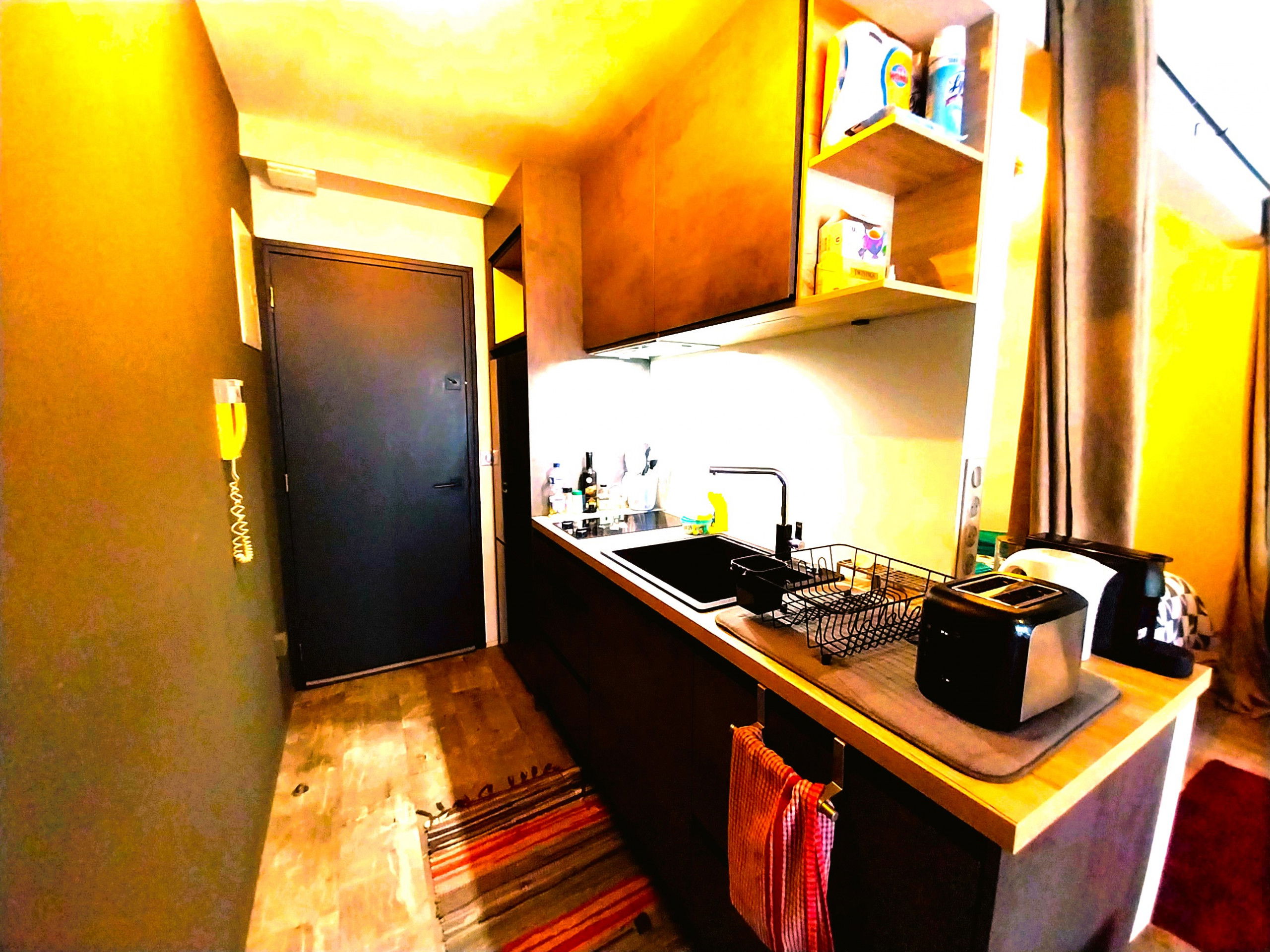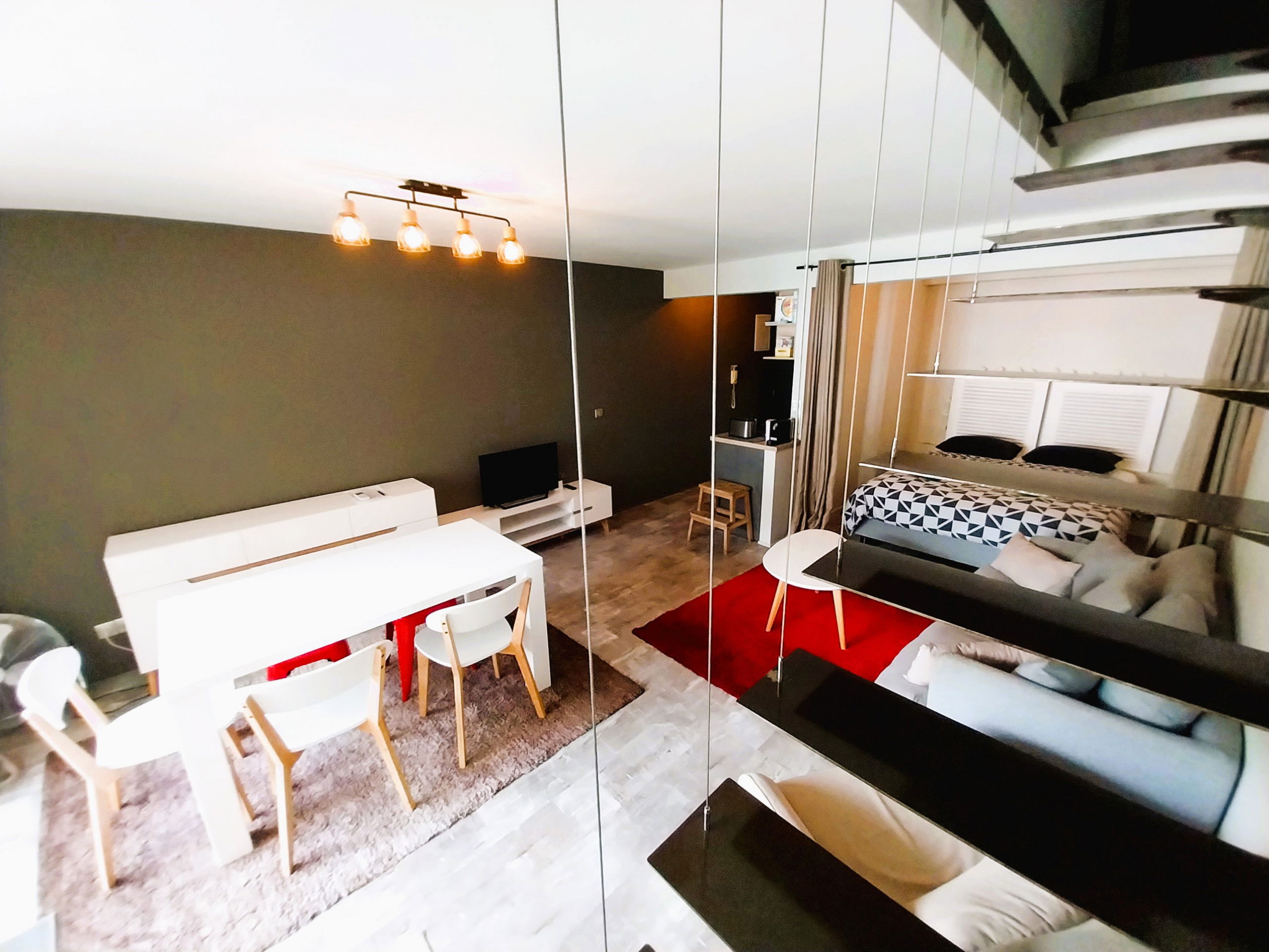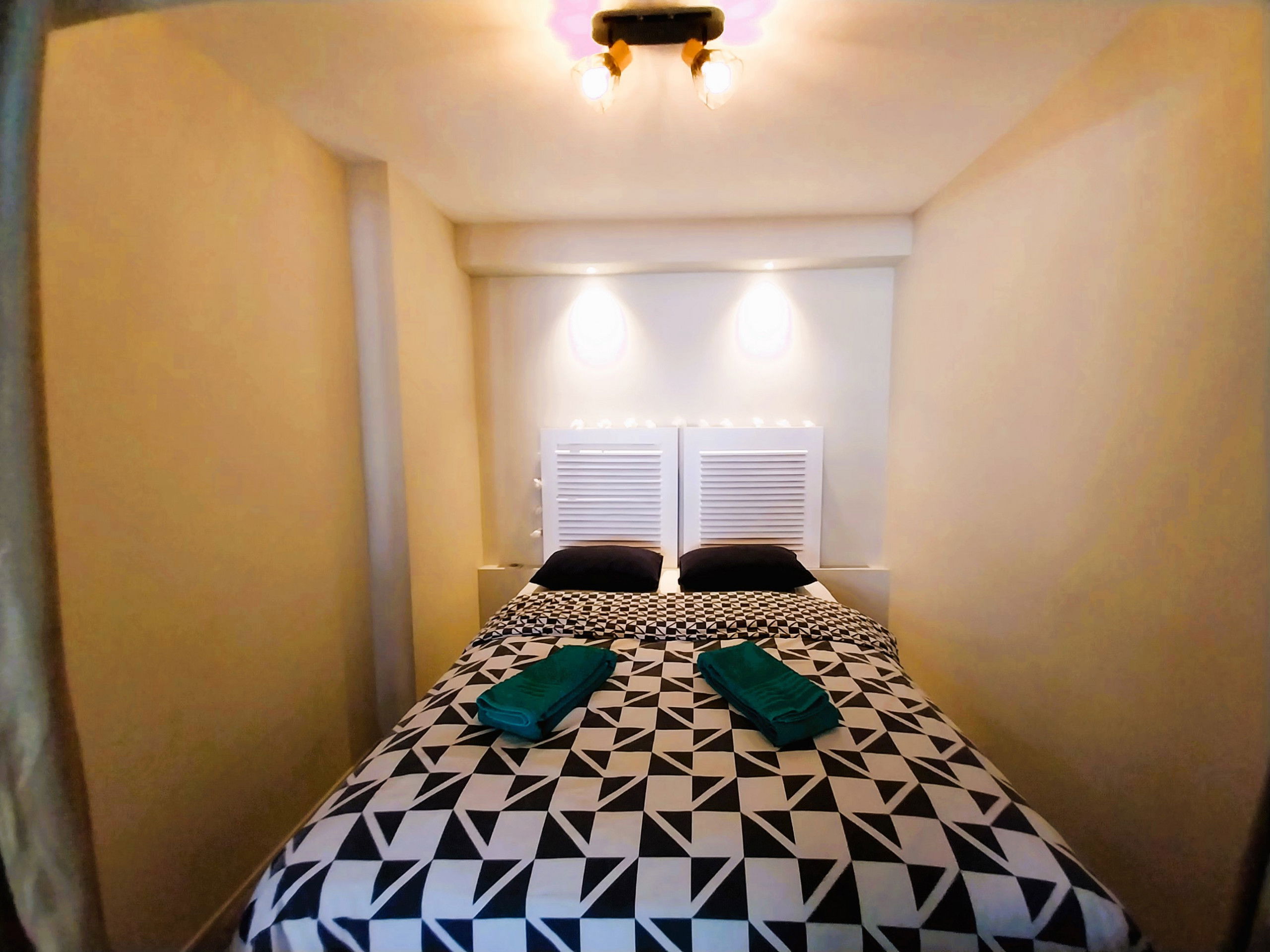 The flat is spacious, bright, functional and resolutely modern, offering all the comforts you need. It can easily accommodate up to four people. On the level, an intimate alcove offers a private sleeping area for two people with a Queen Size bed. The master bedroom is upstairs. Spacious and cosy, it has a queen-size bed and a study area. In the crevice at the back of the room on the left, you'll find the iron, ironing board and hoover. This is also where you'll find the bathroom, with its washbasin, washing machine, WC and large Italian-style shower in natural stone.