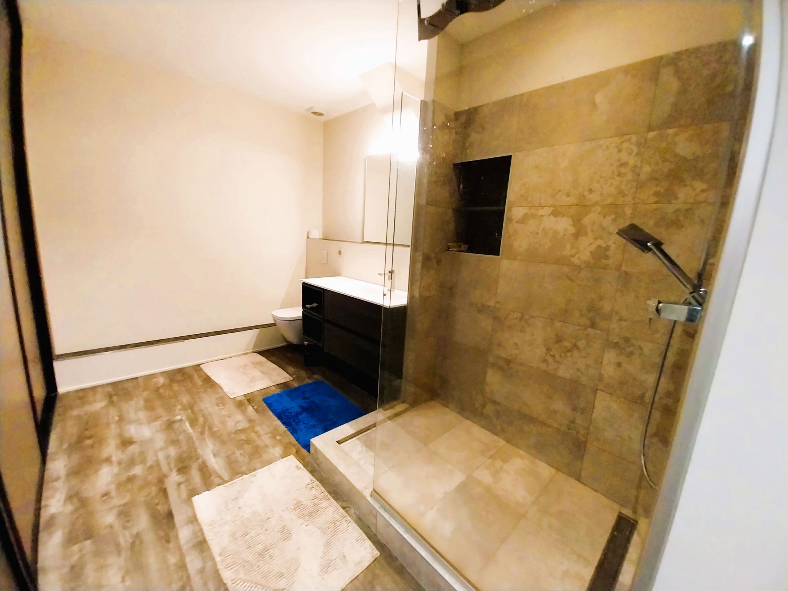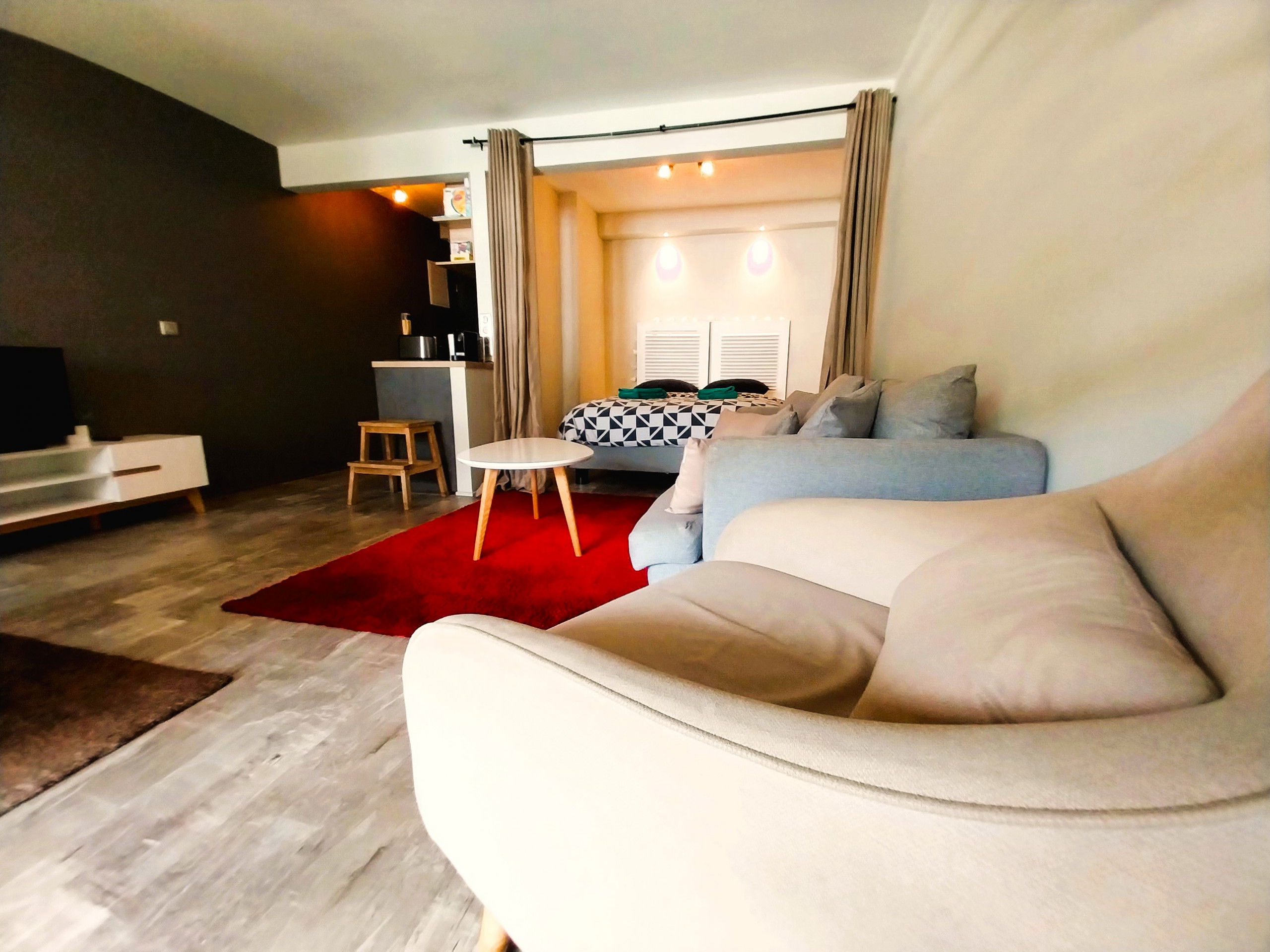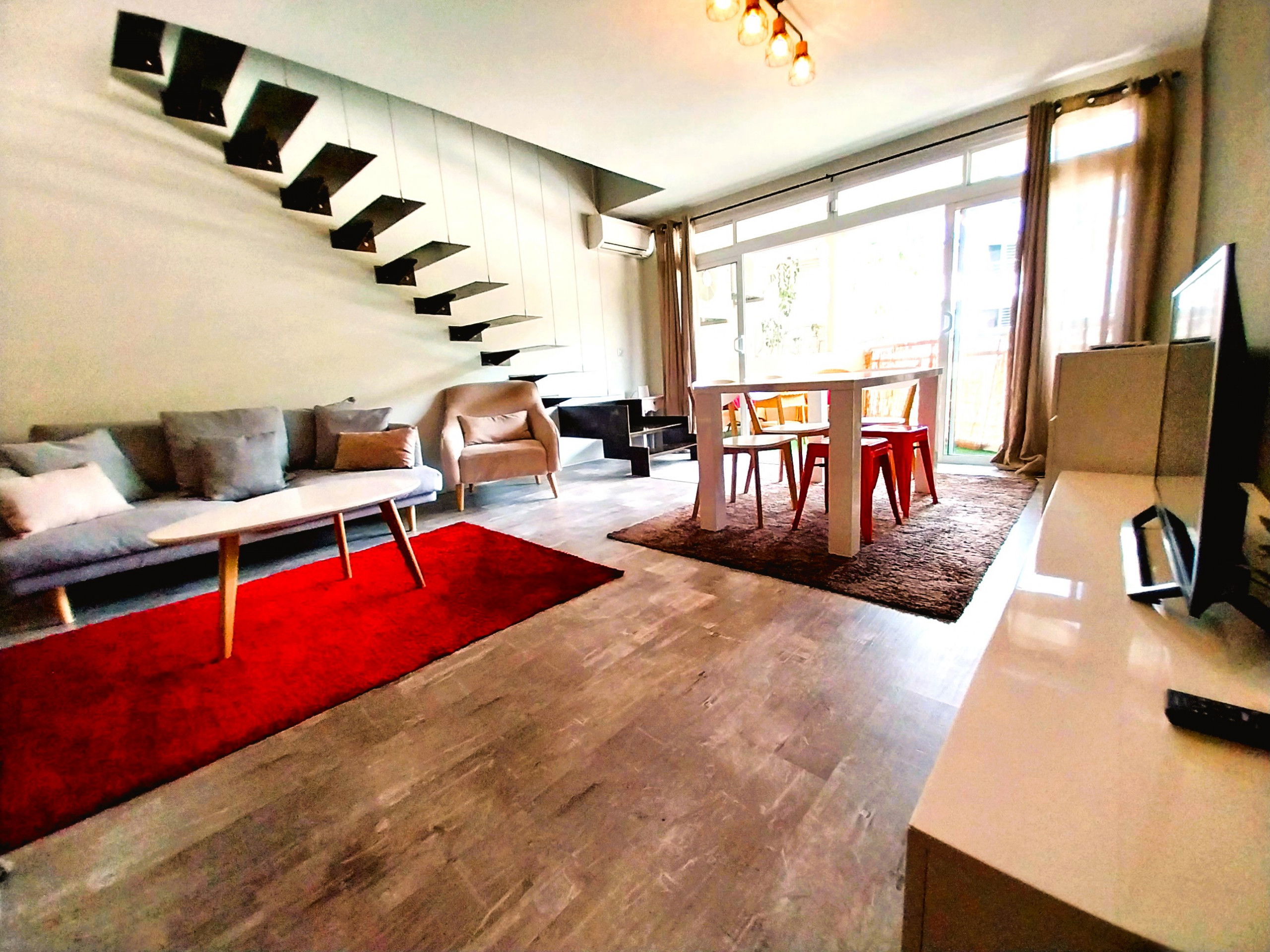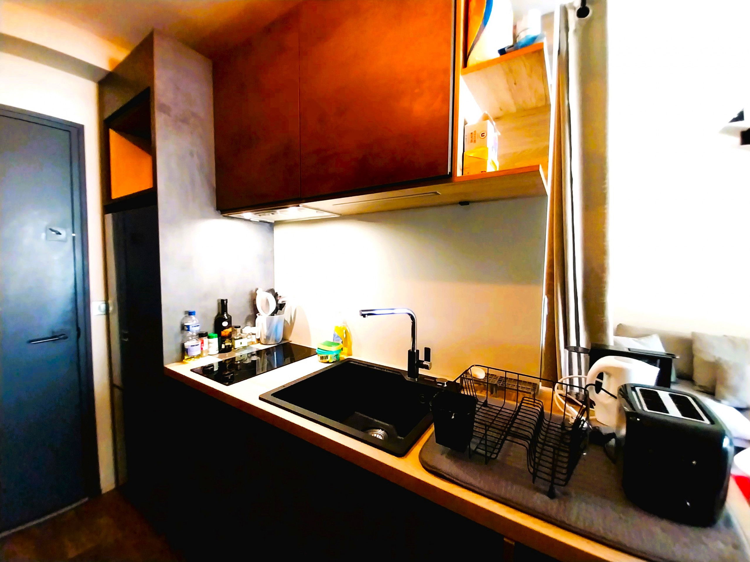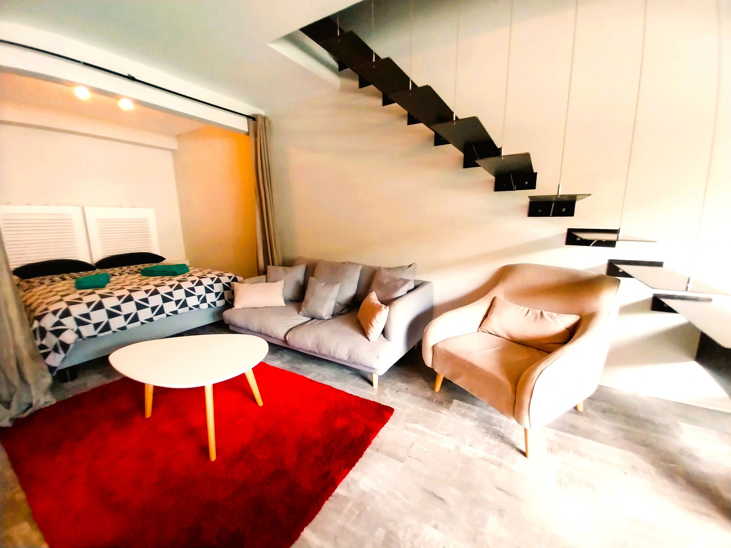 The flat is spacious, bright, functional and resolutely modern, offering all the comforts you need. It can easily accommodate up to four people. On the level, an intimate alcove offers a private sleeping area for two people with a Queen Size bed. The master bedroom is upstairs. Spacious and cosy, it has a queen-size bed and a study area. In the crevice at the back of the room on the left, you'll find the iron, ironing board and hoover. This is also where you'll find the bathroom, with its washbasin, washing machine, WC and large Italian-style shower in natural stone.