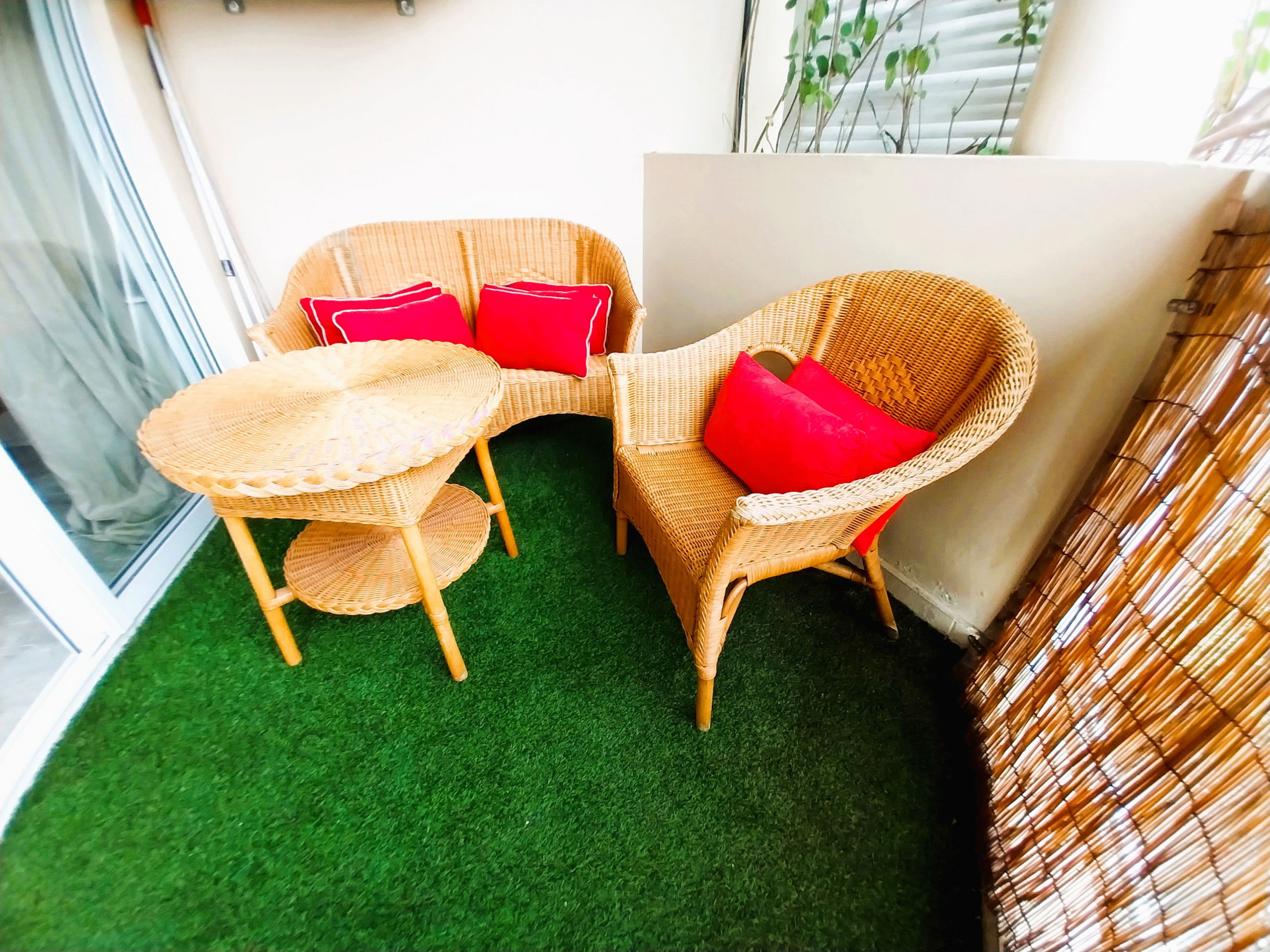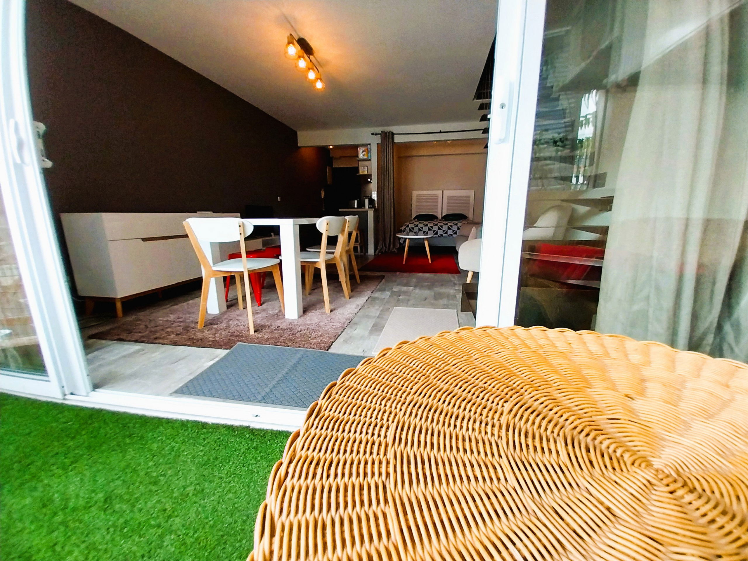 The living area is spacious, with a modern, elegant and uncluttered layout. It has a lounge area with television, sofa and armchair, and a dining area with table and chairs, providing everything you need for convivial moments. A splendid suspended wrought-iron staircase adds a special touch of charm to this accommodation. The balcony, equipped with a rattan lounge, will be appreciated for enjoying your morning coffee, your aperitifs at the end of the day or even your meals al fresco.