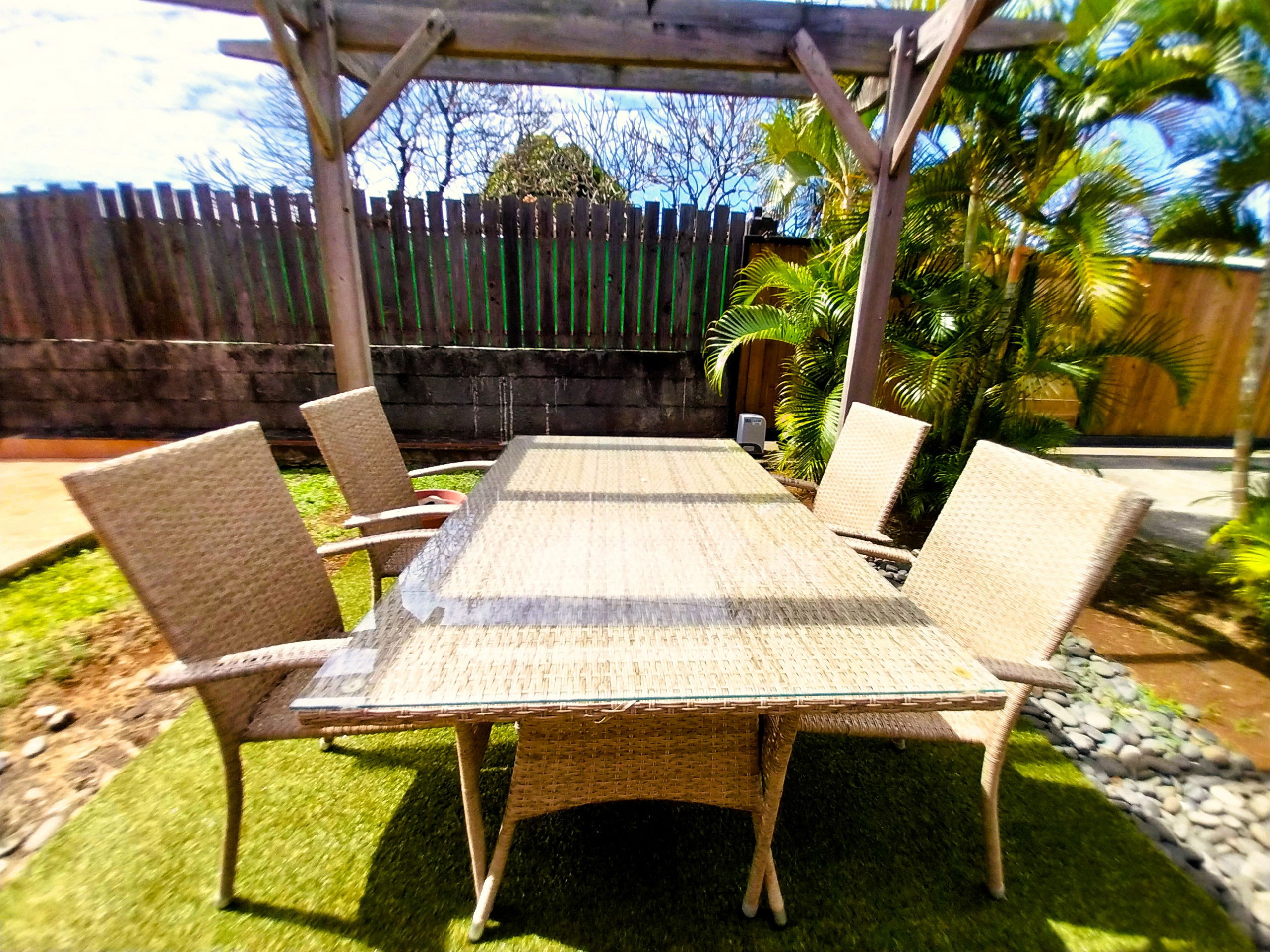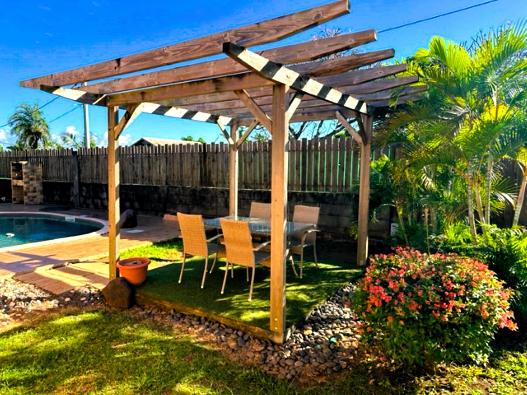 The highlight of Lihei Pool House is its large garden, carefully laid out around the pool. You can soak up the sun on the sun loungers while watching the children play in the water. To escape the tropical sun, the covered terrace offers two separate areas. Relax in the small lounge for aperitifs or quiet moments, then take advantage of the dining area with table and chairs to enjoy meals al fresco.