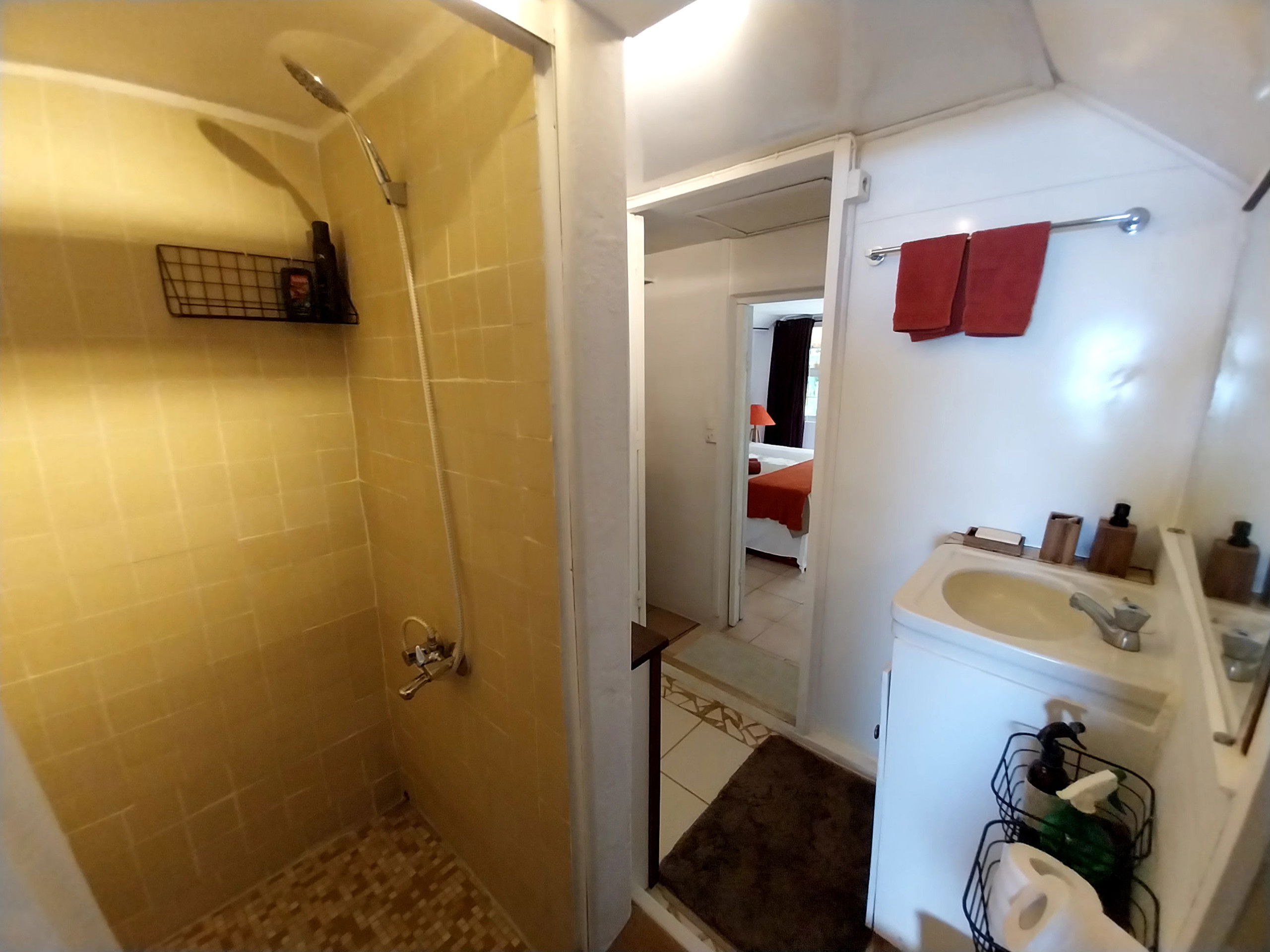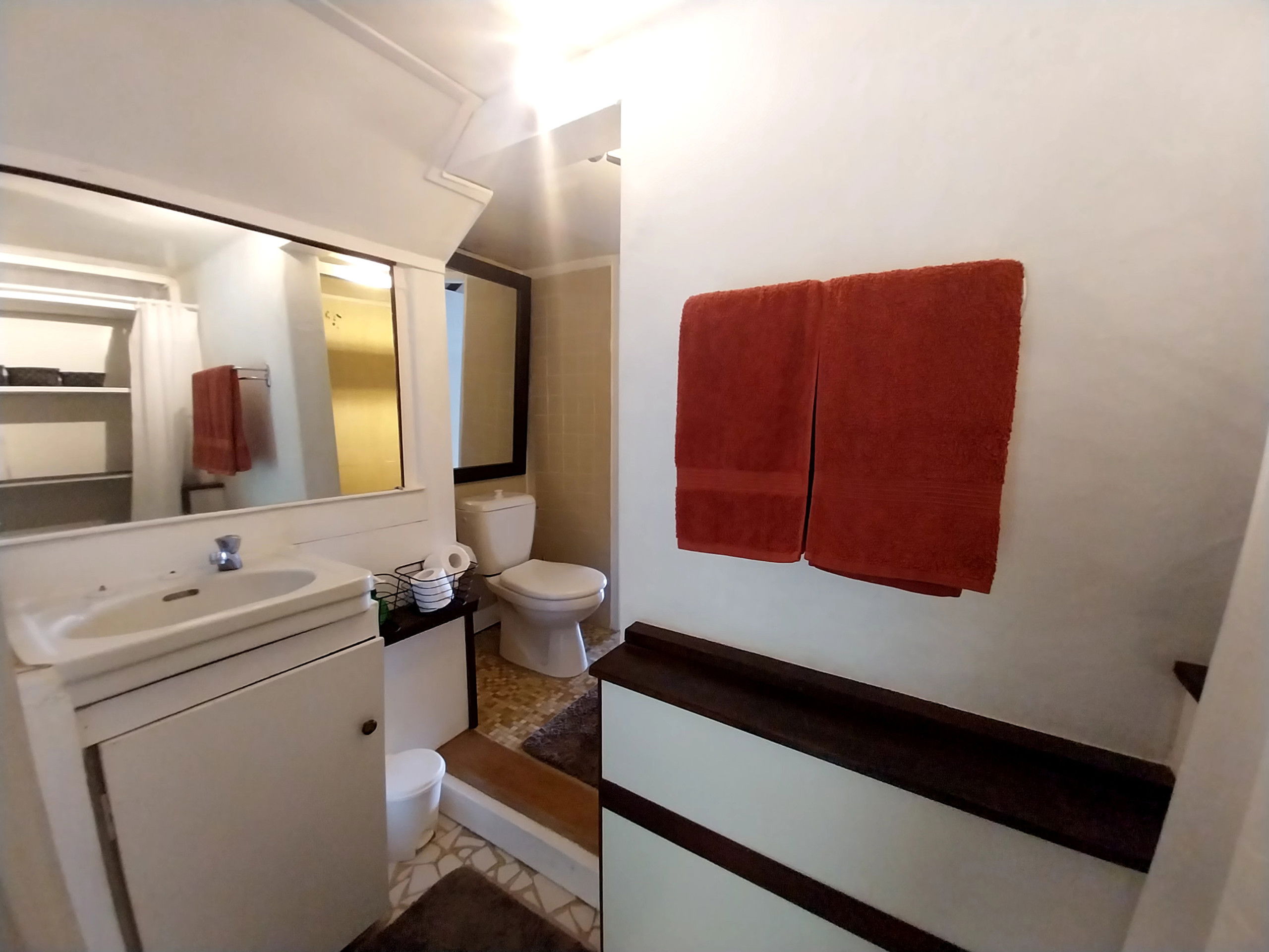 This comfortable, well-appointed home welcomes you to a tastefully decorated bedroom. Spacious and equipped with an orthopaedic queen-size bed, it also has storage space and a terrace with deckchair for your moments of relaxation. The bathroom includes a washbasin with mirror, a shower, a toilet and a laundry room with washing machine, for optimum comfort.