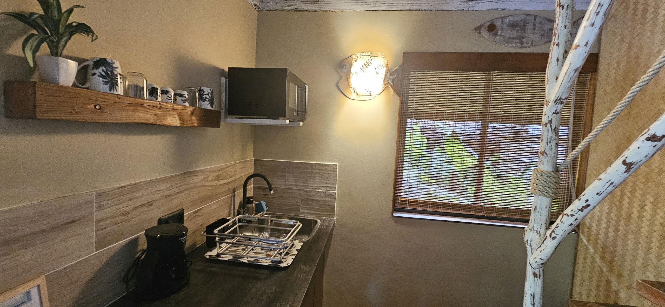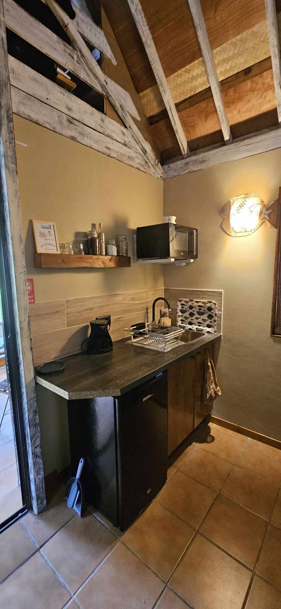 This little paradise is perfect for an unforgettable getaway under the Polynesian latitudes. In your accommodation, you will find a night area in a mezzanine with a queen-size bed, a television and air conditioning for peaceful and restorative nights. The kitchenette is fully equipped, allowing you to prepare and enjoy delicious meals at your convenience.