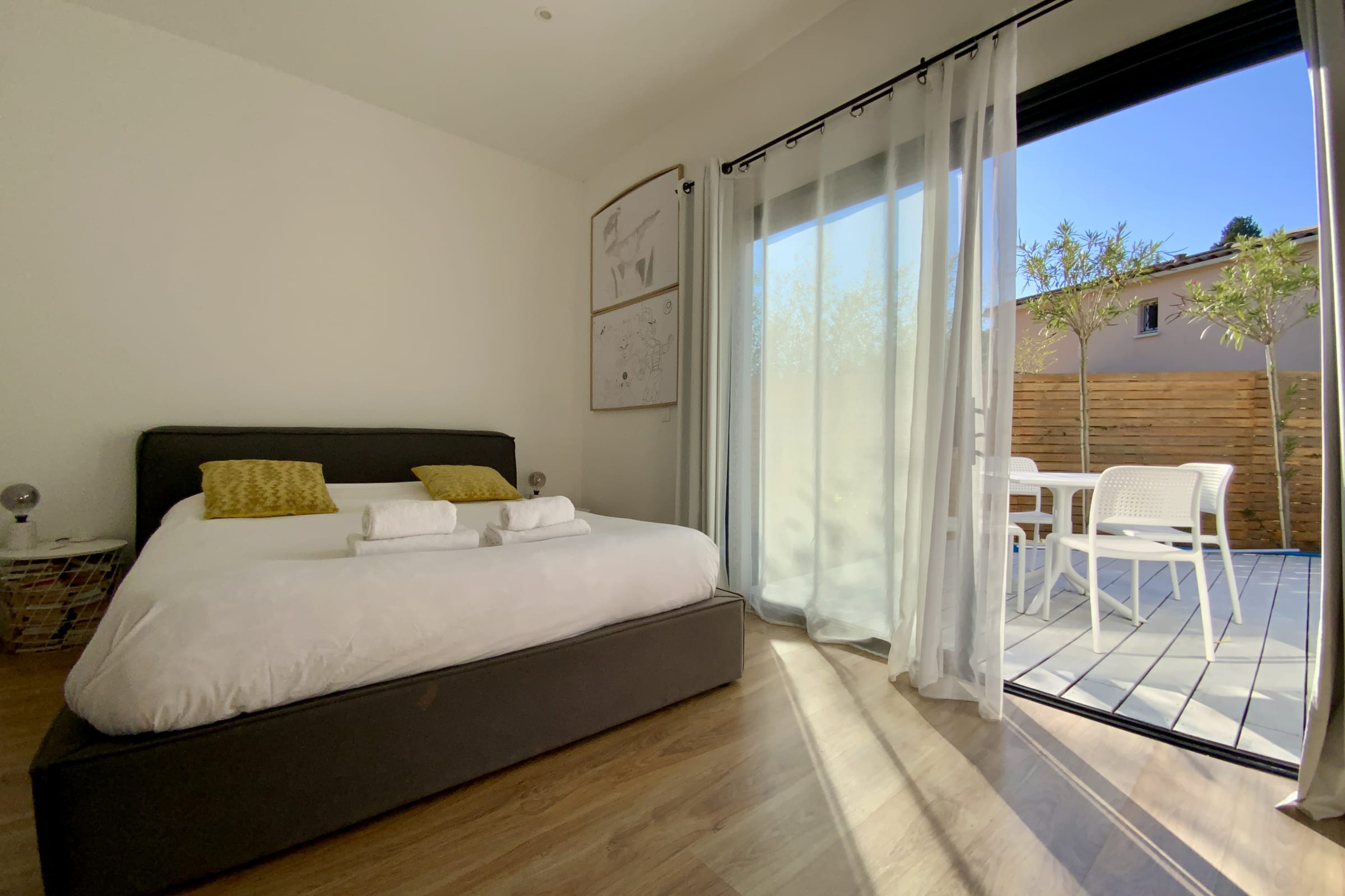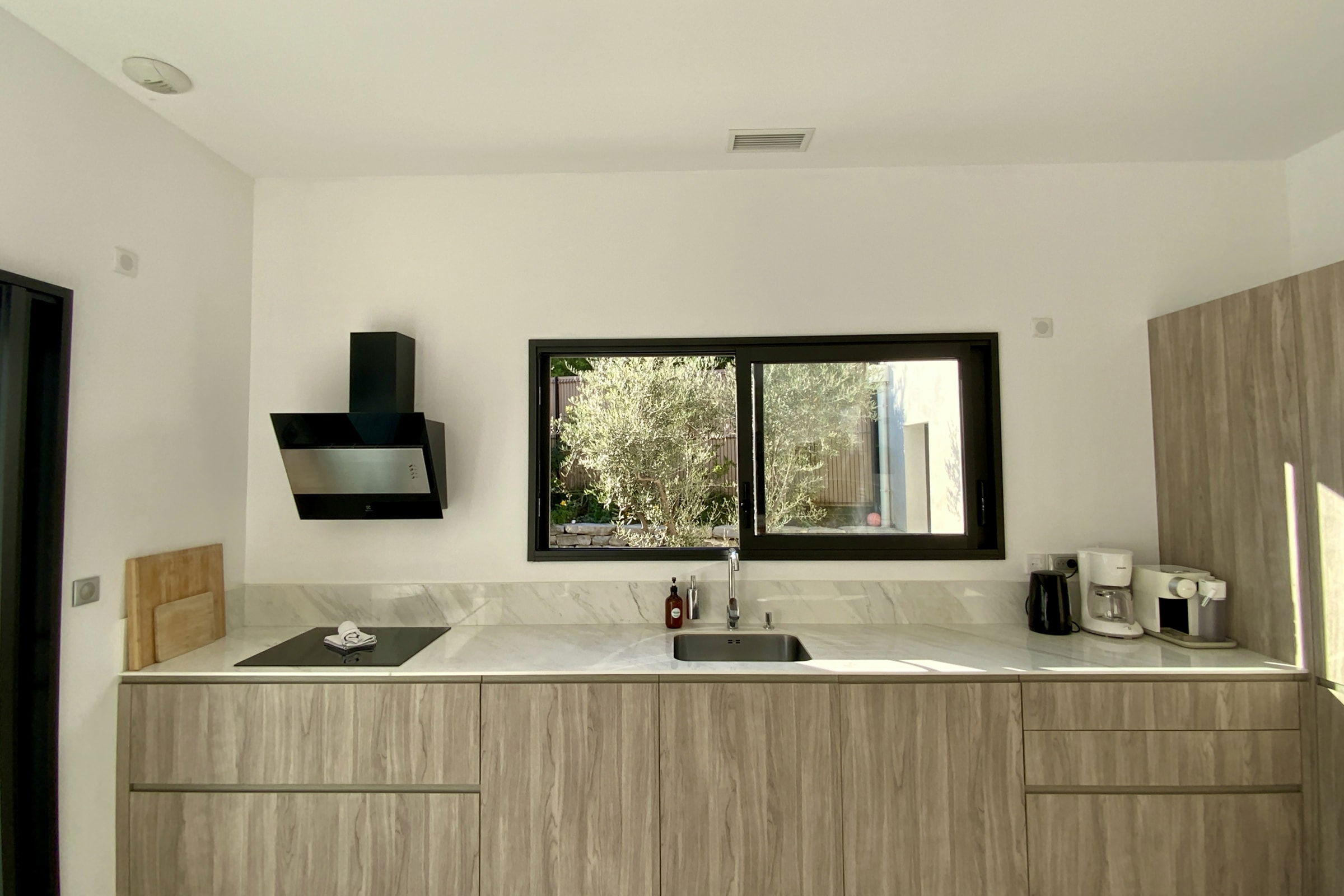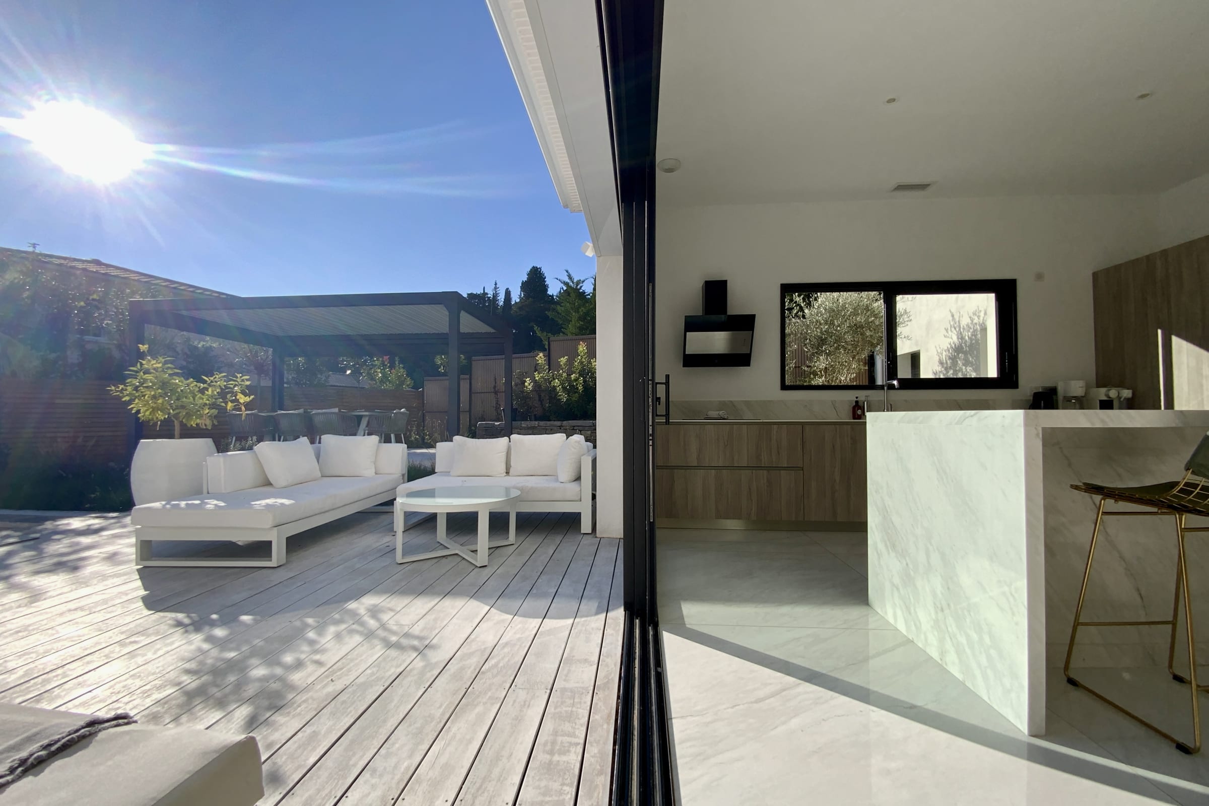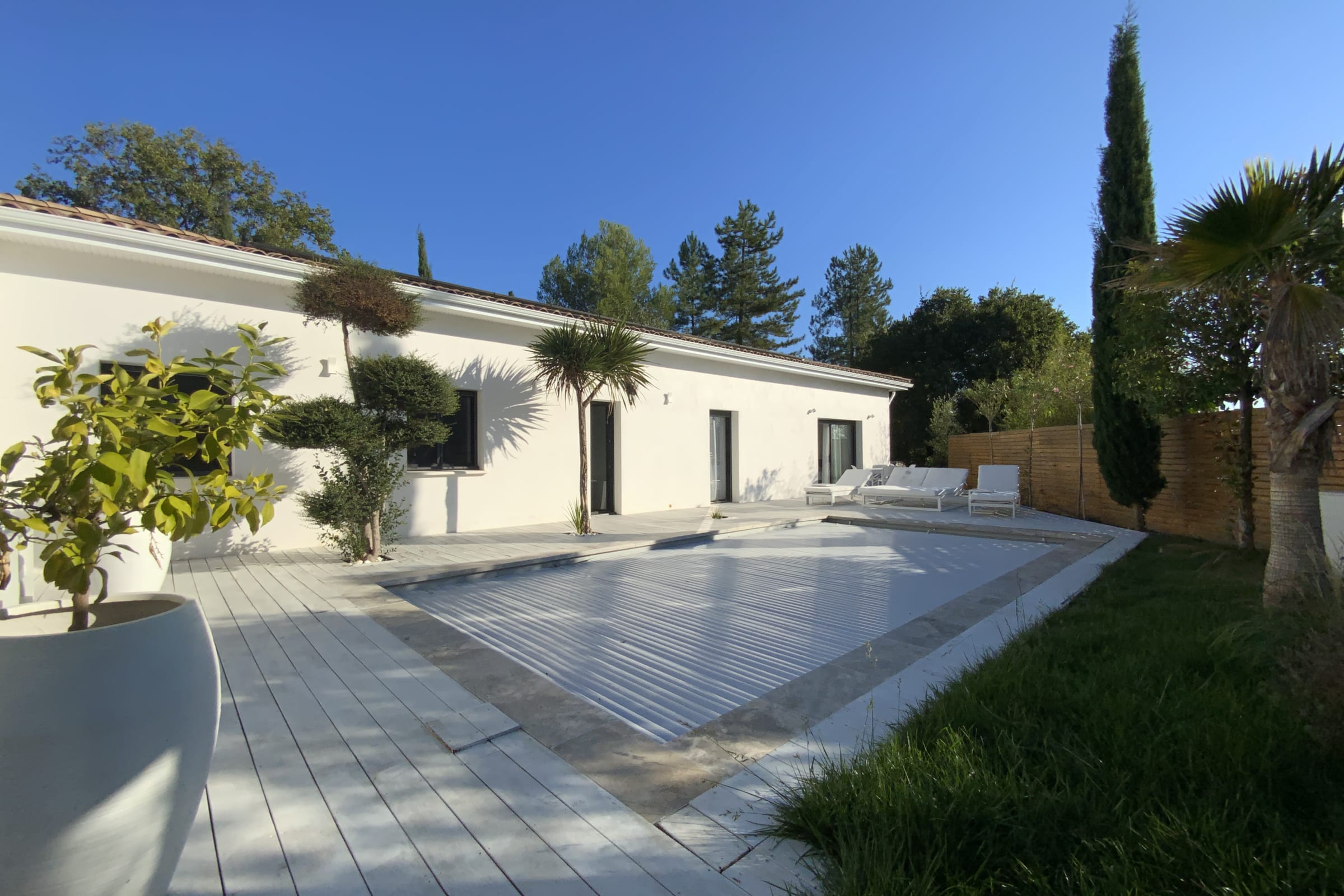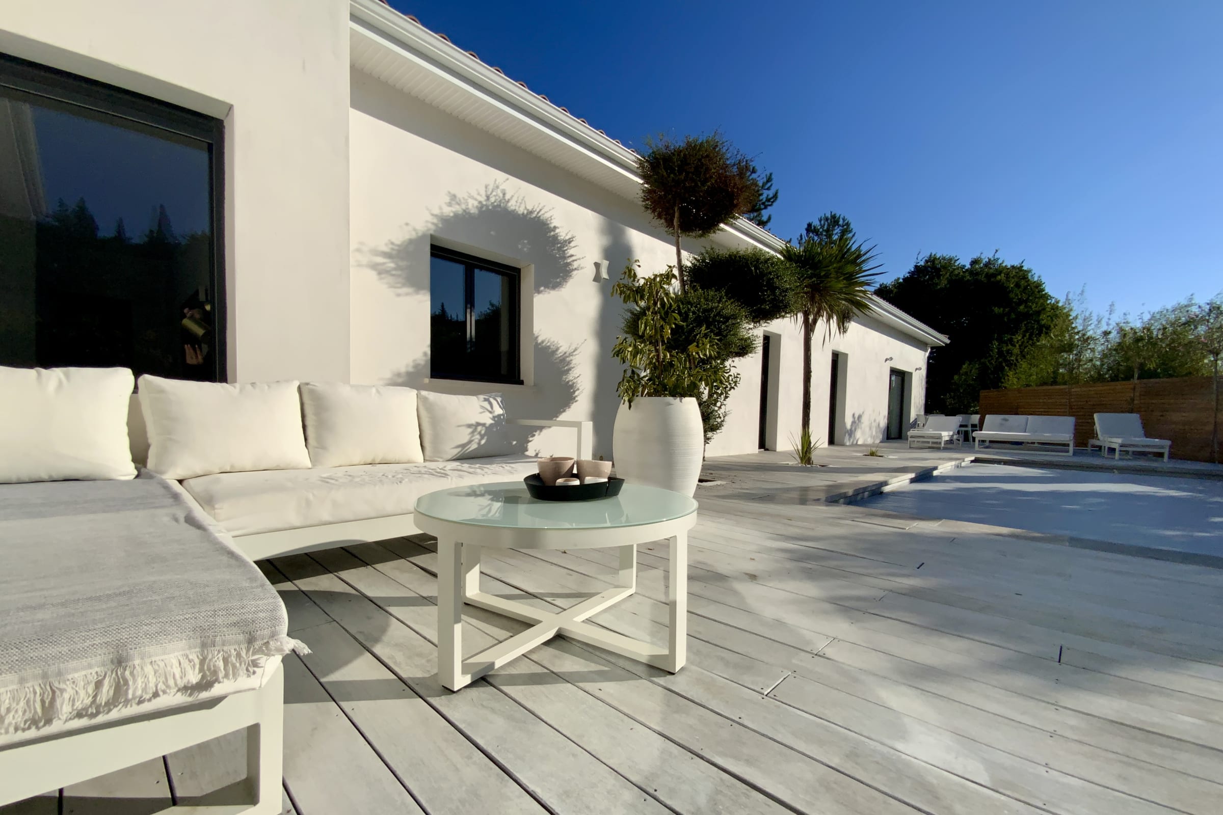 The exterior is a true place of relaxation. The large wooden terrace offers several areas to fully enjoy the southern sun: a summer lounge, poolside deck chairs, a large dining table, and a gas grill for al fresco dining. All in a quiet and intimate setting, with no overlooked views.