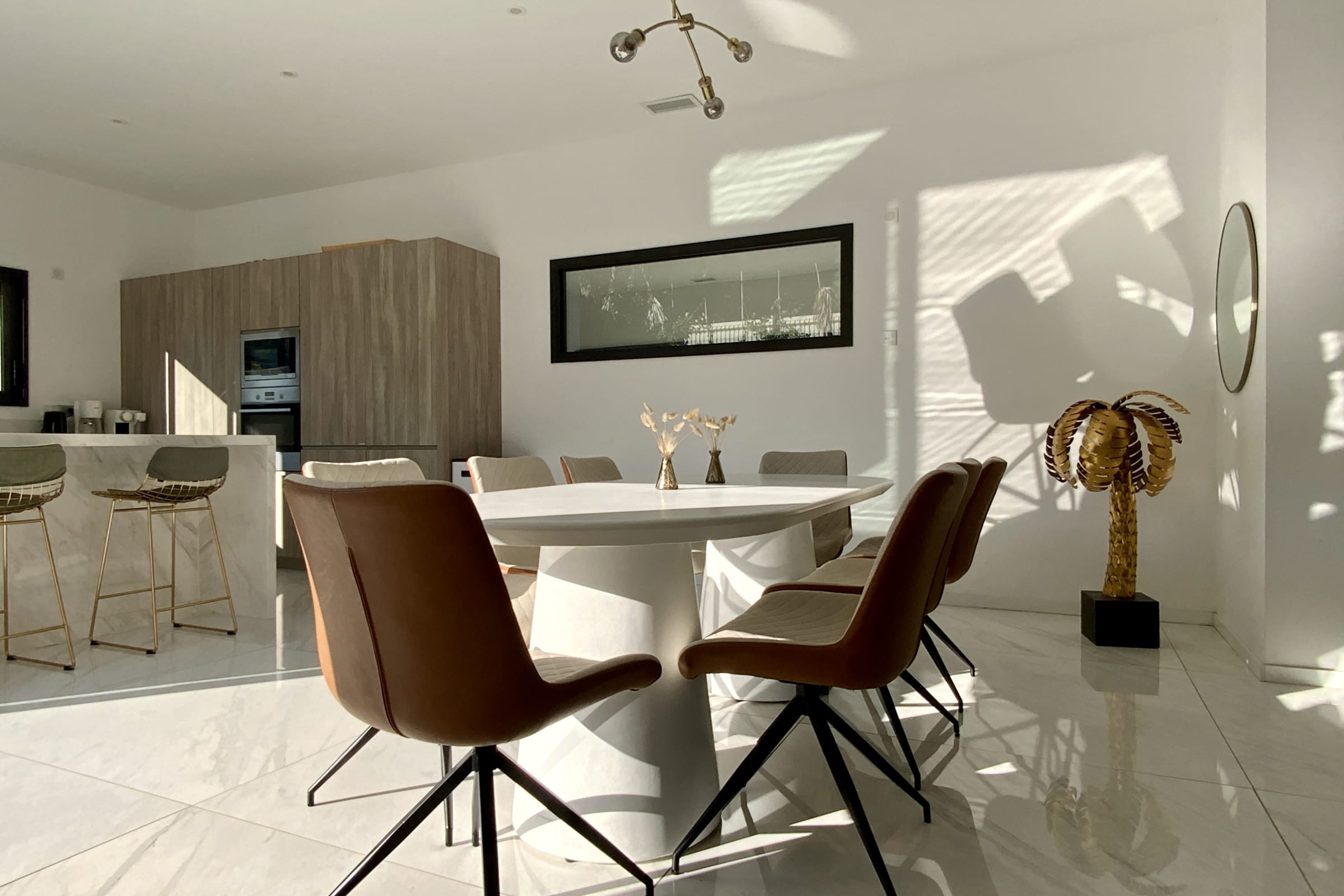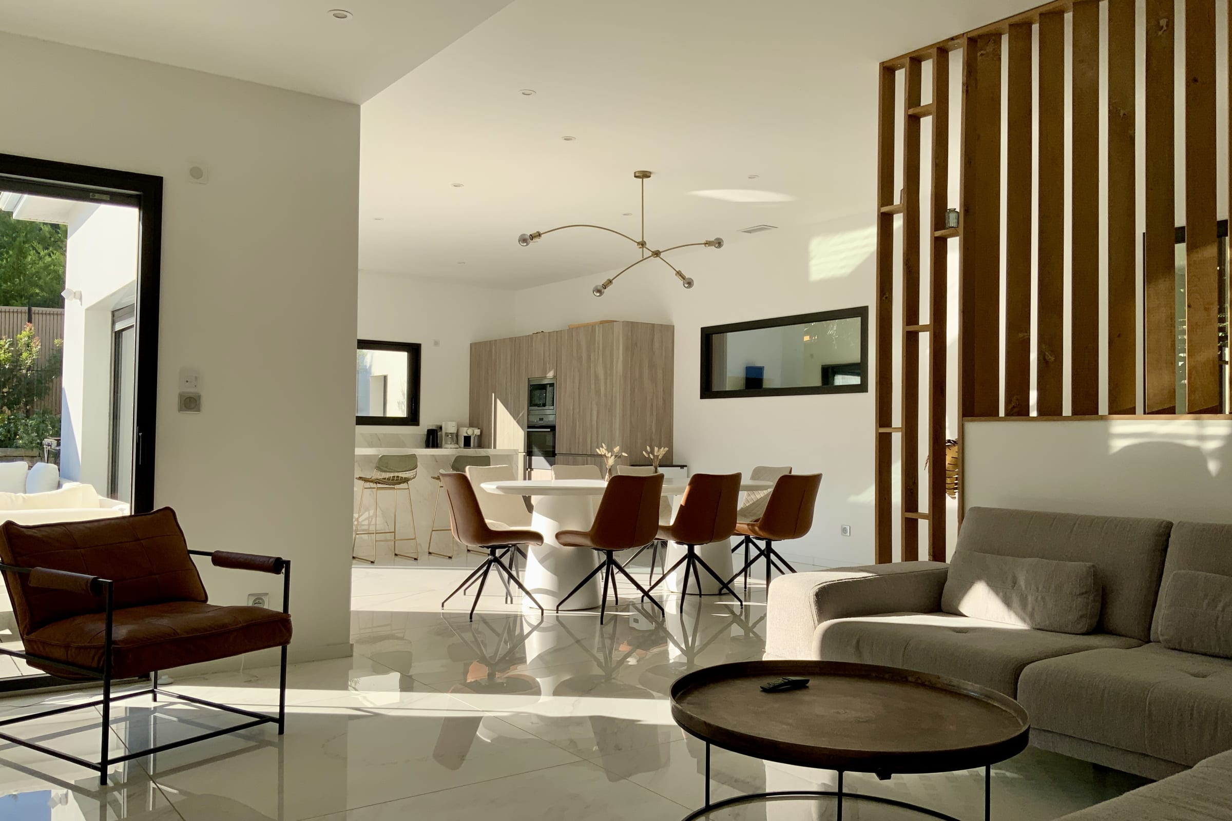 The living space is organized around a spacious living room opening onto a fully equipped modern kitchen. The decor is refined, with soft, natural tones blending perfectly with the marble-effect flooring, and the large bay windows flood the room with light throughout the day. It features a cozy dining area, a comfortable living room, and direct access to the terrace and pool.