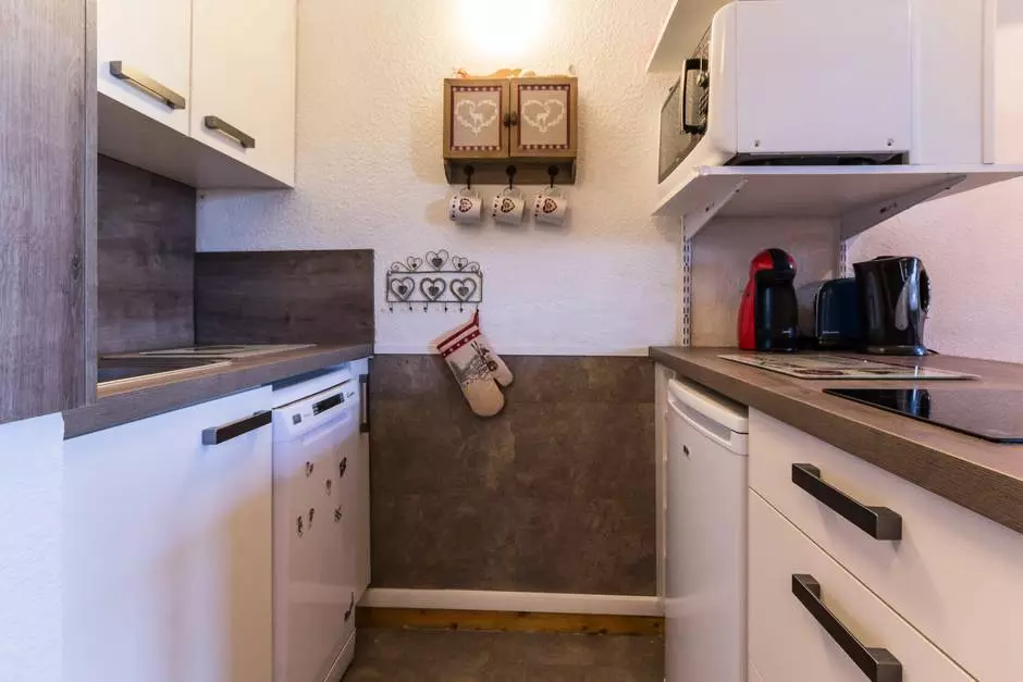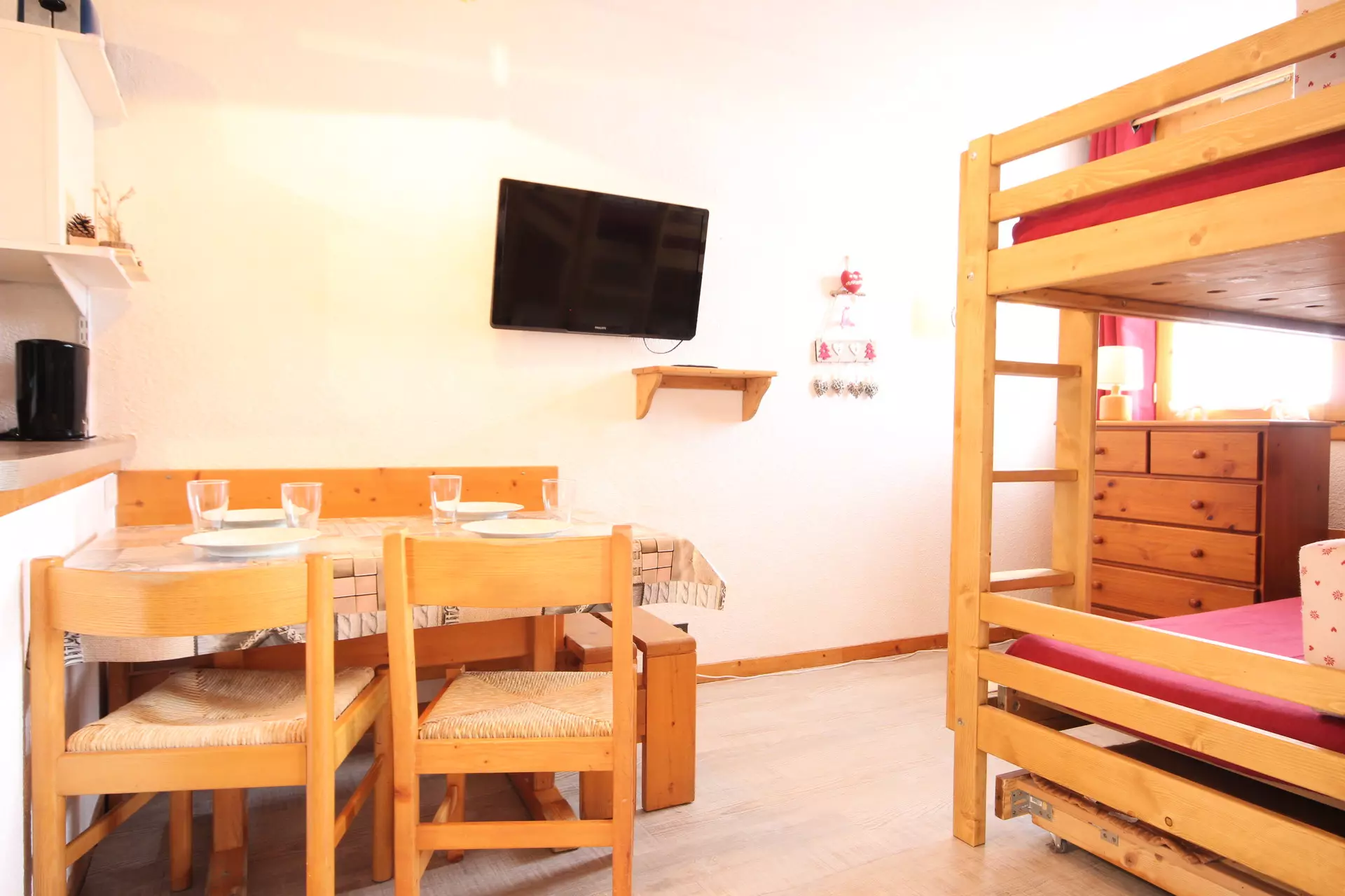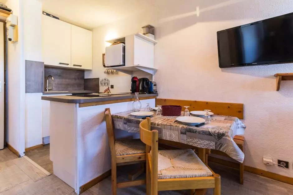 This pretty studio in the center of the resort with a beautiful view of the valley and the mountains consists of a fully equipped and renovated kitchenette (ceramic hob, oven/microwave, dishwasher, kettle, toaster, coffee maker), a bathroom with bathtub and separate toilet.