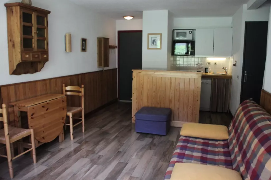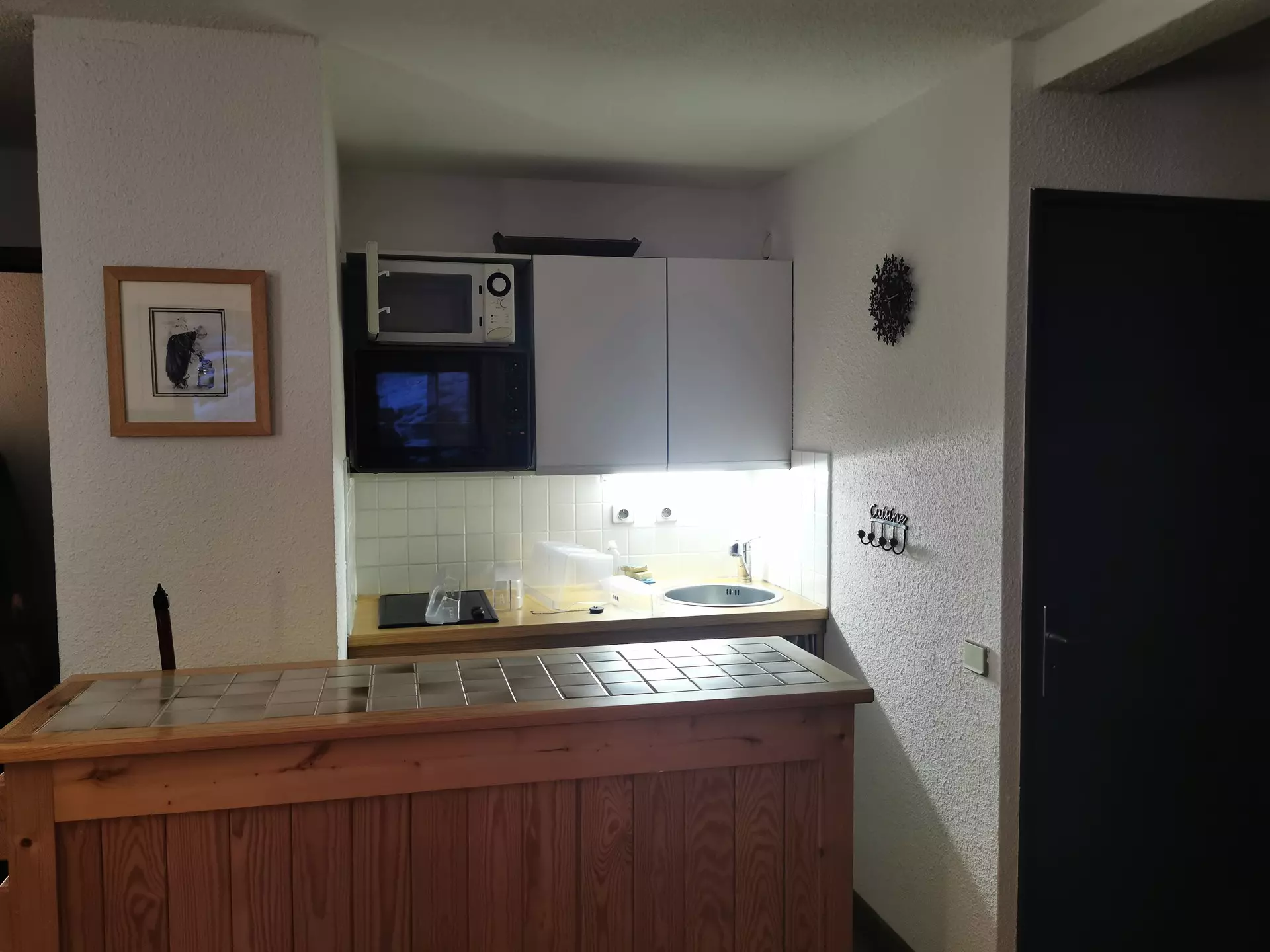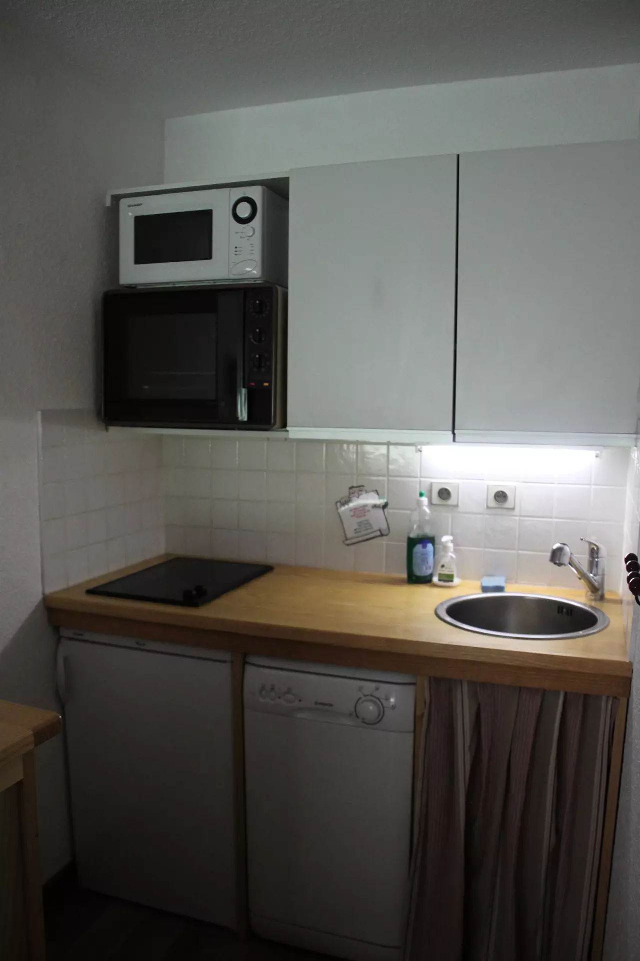 - Kitchen area: mini-oven, refrigerator, dishwasher, ceramic hob (2 burners), microwave.