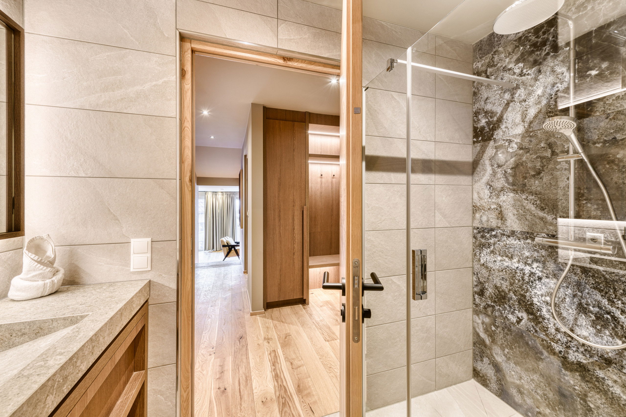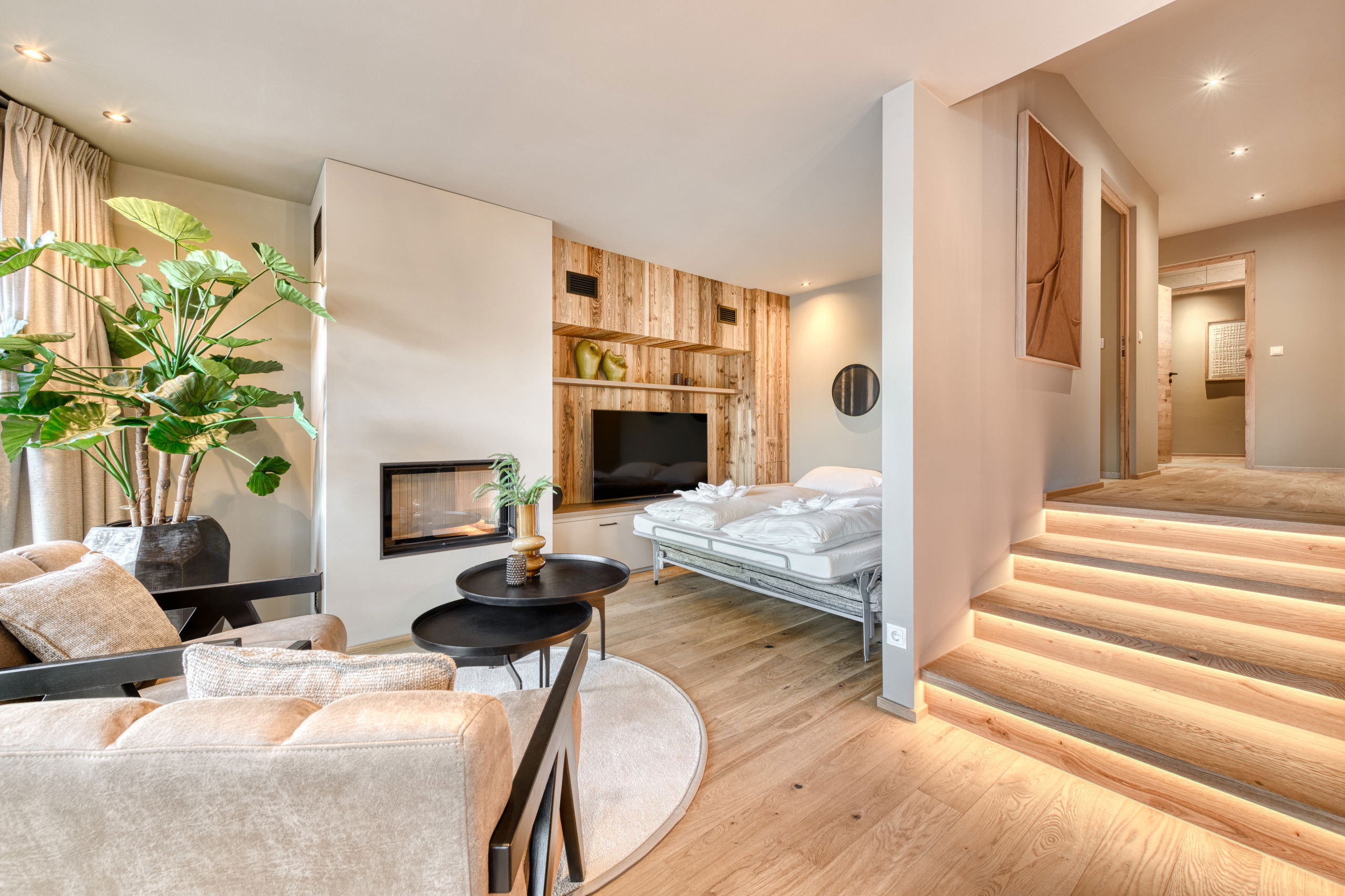 The combination of three bedrooms, fireplace, high-quality materials and wide mountain view makes the Nexus Suite Top 4 an inviting retreat for families and friends. Here you live right in the mountains – connected with their tranquillity and power.