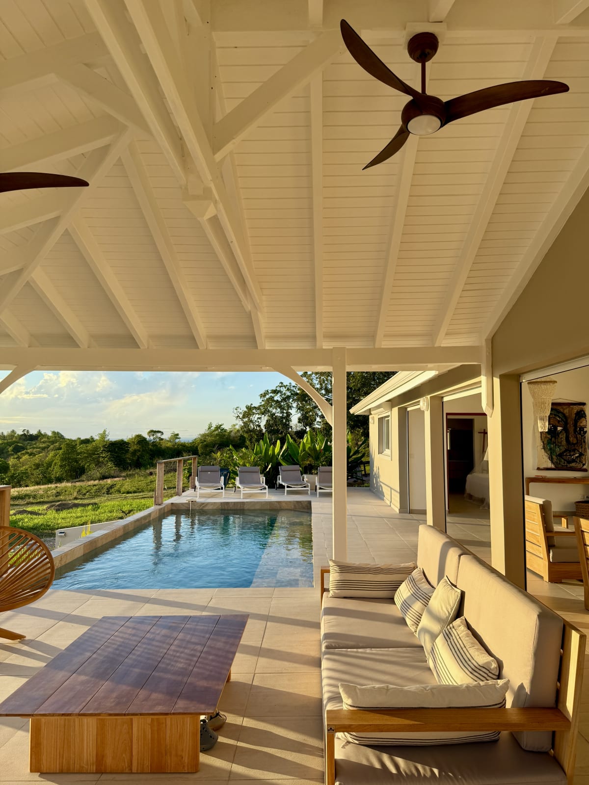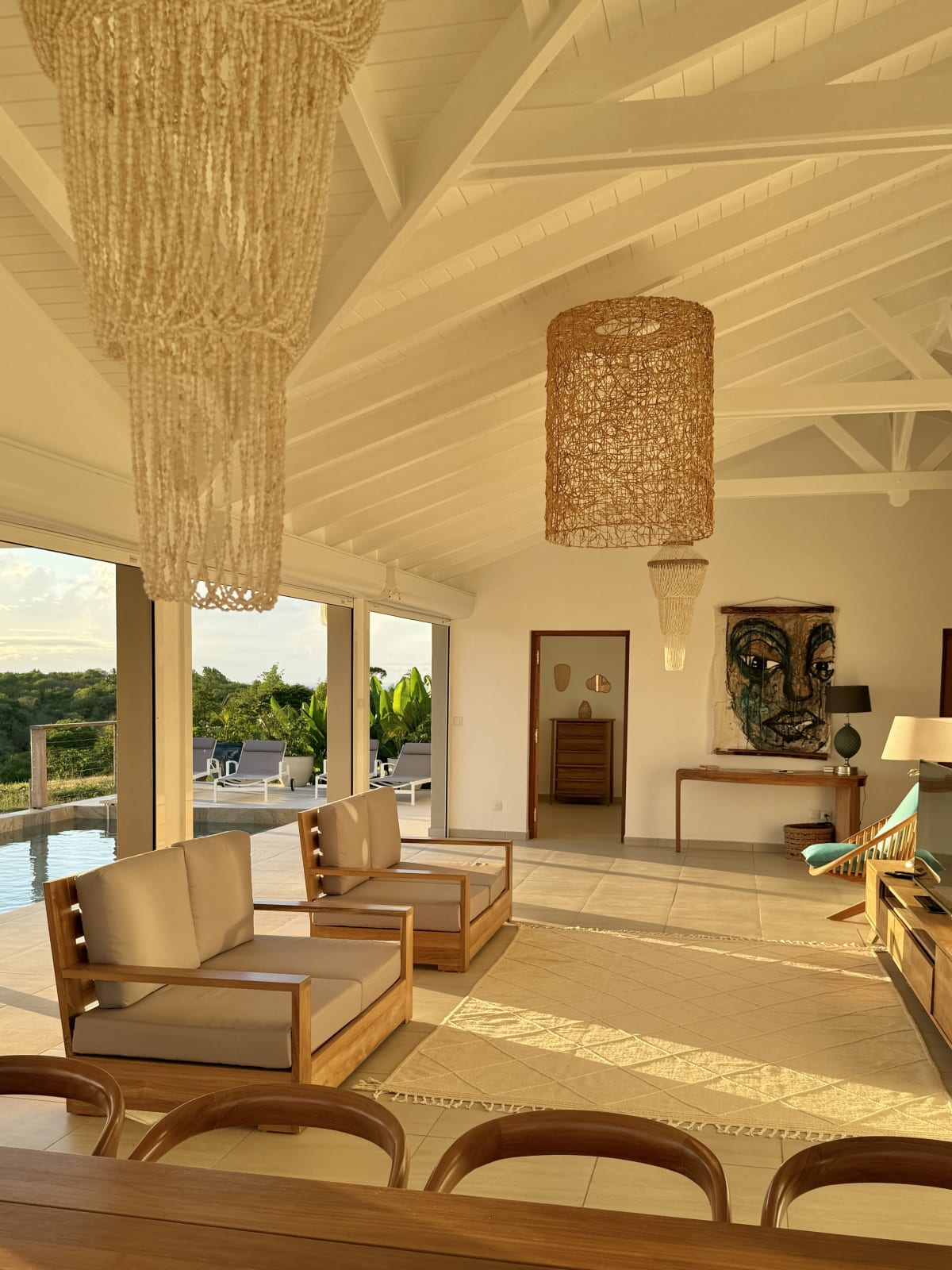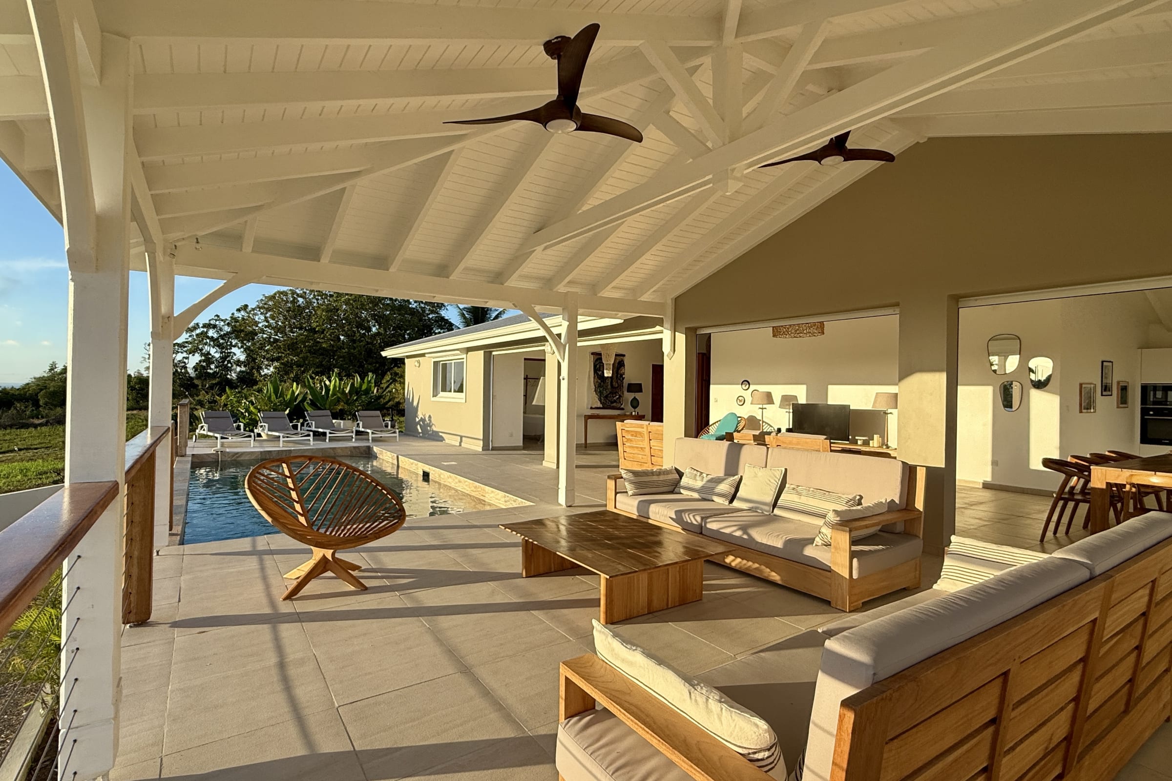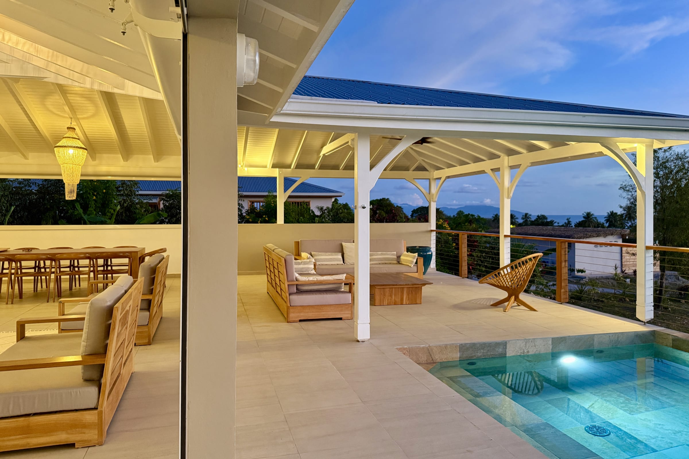 The main living area, bathed in natural light, opens onto a stunning terrace with a breathtaking coastal view. Relax by your private pool, take a dip in the turquoise water, and soak up the Caribbean sun.