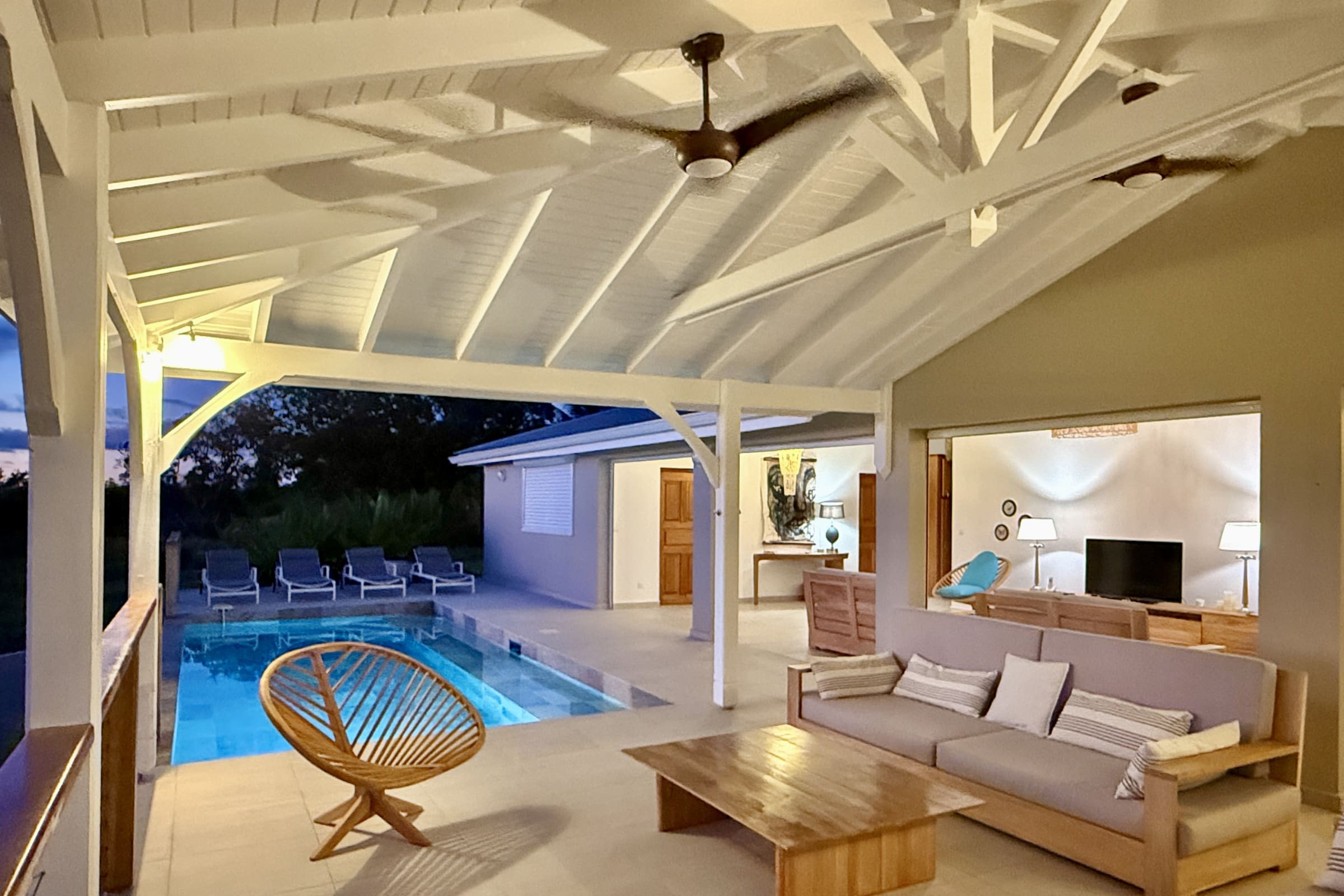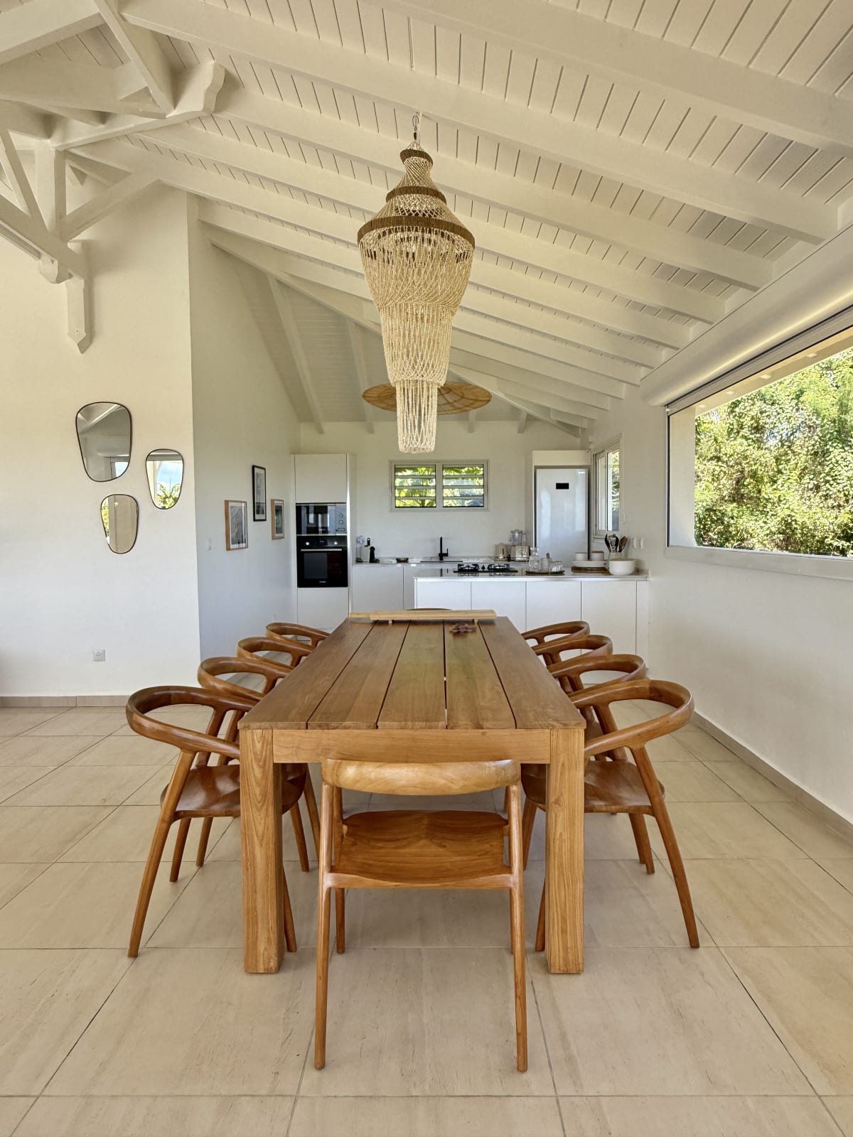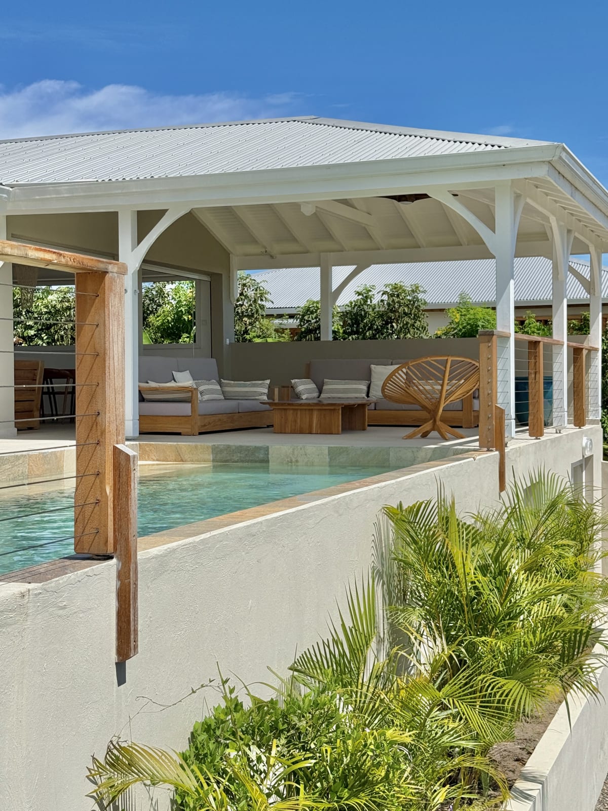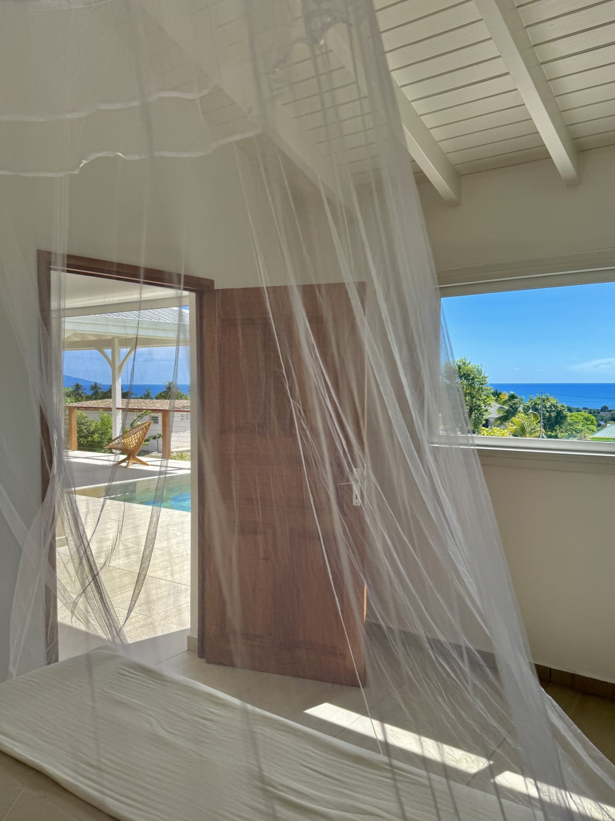 The main living area, bathed in natural light, opens onto a stunning terrace with a breathtaking coastal view. Relax by your private pool, take a dip in the turquoise water, and soak up the Caribbean sun.