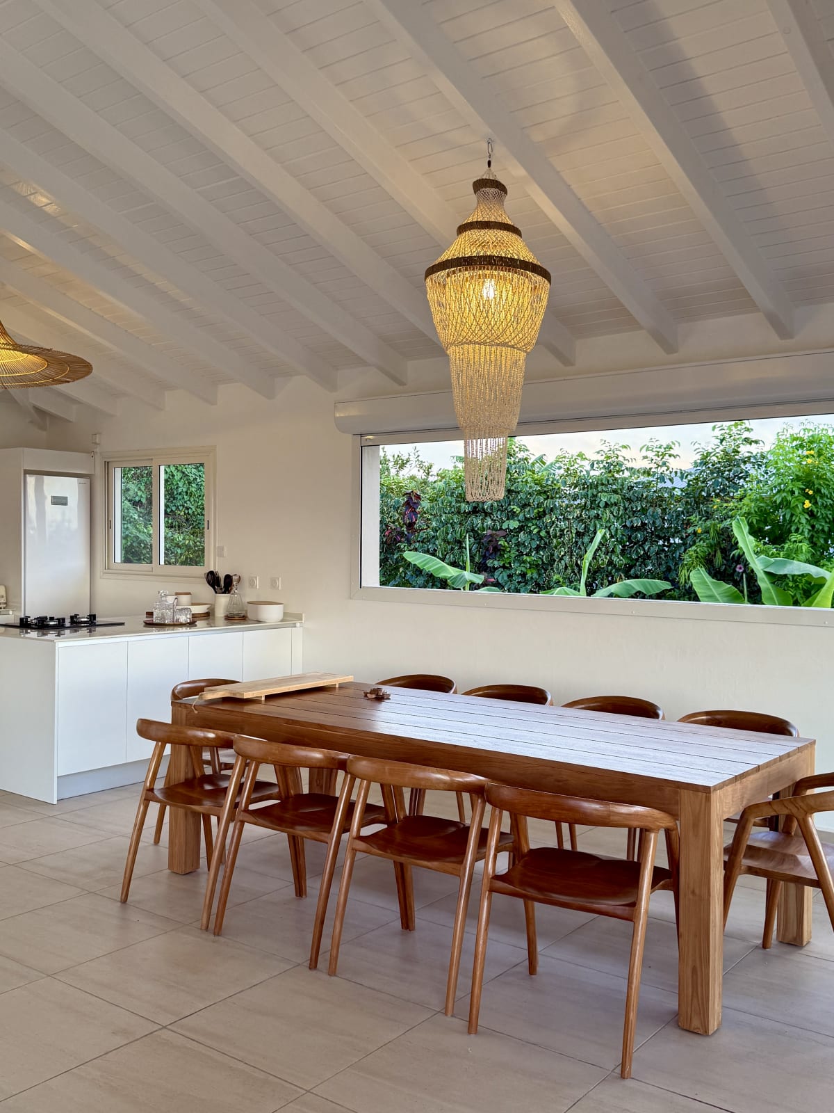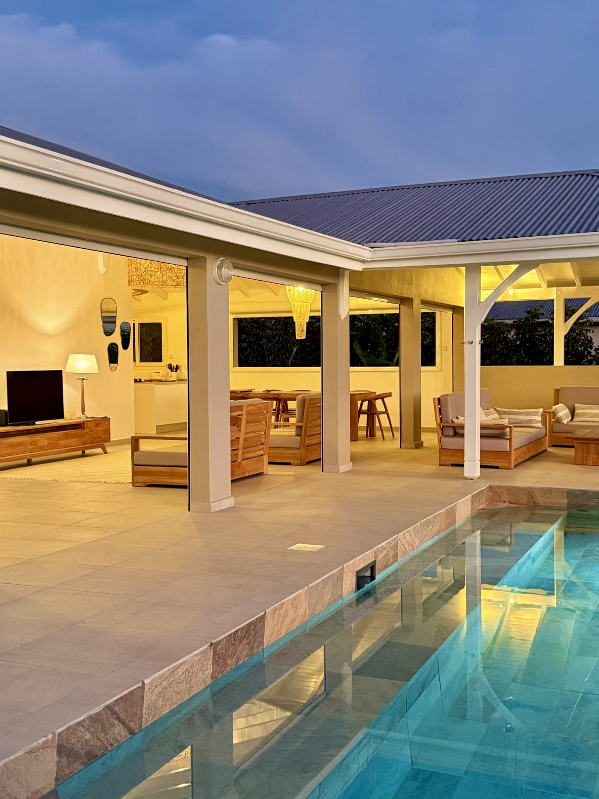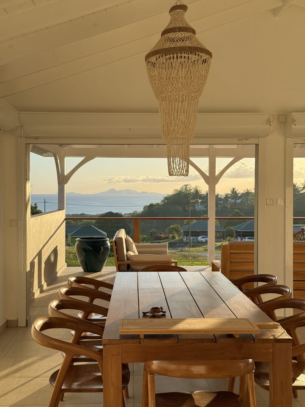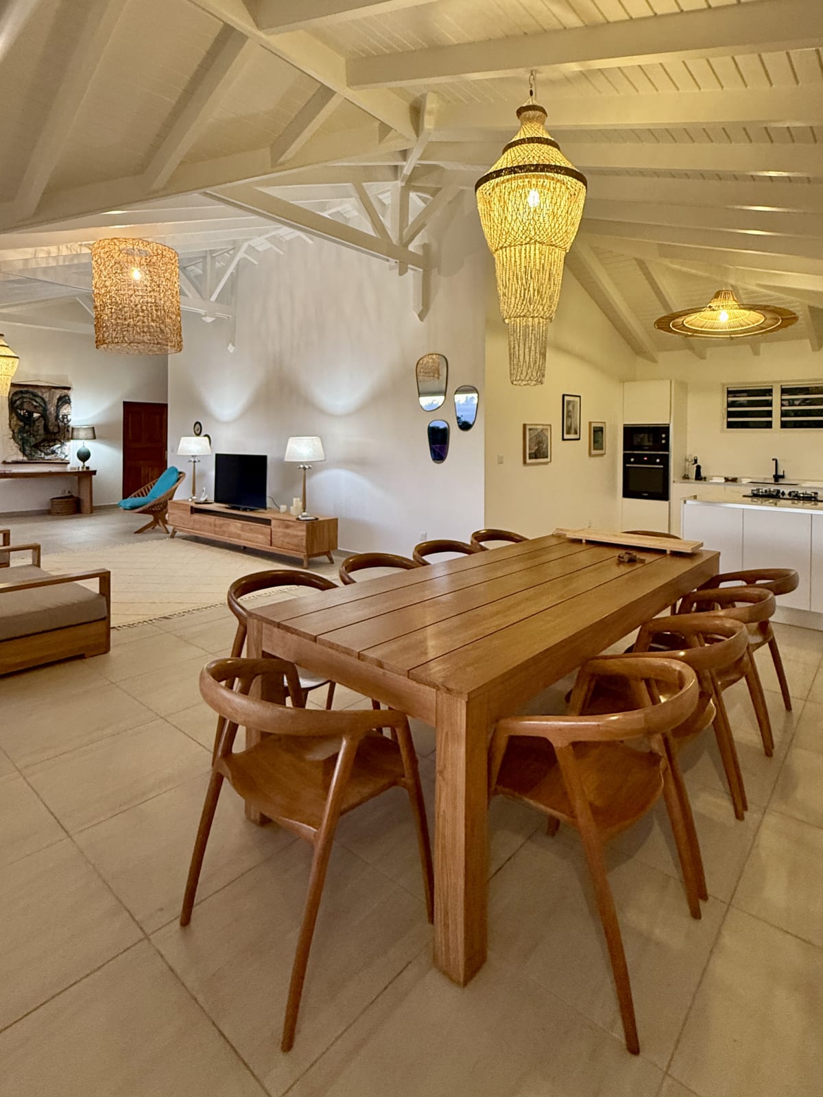The main living area, bathed in natural light, opens onto a stunning terrace with a breathtaking coastal view. Relax by your private pool, take a dip in the turquoise water, and soak up the Caribbean sun.