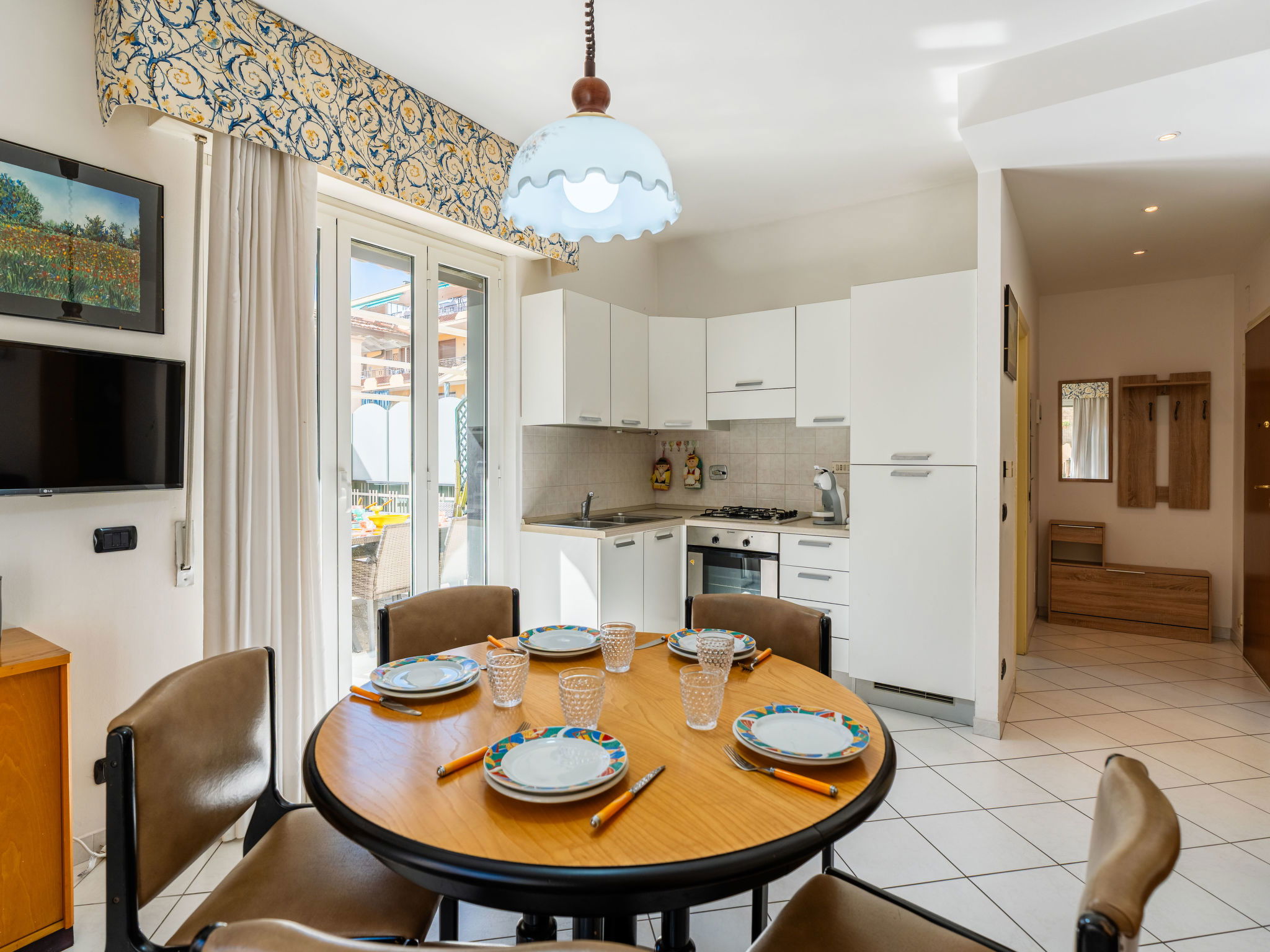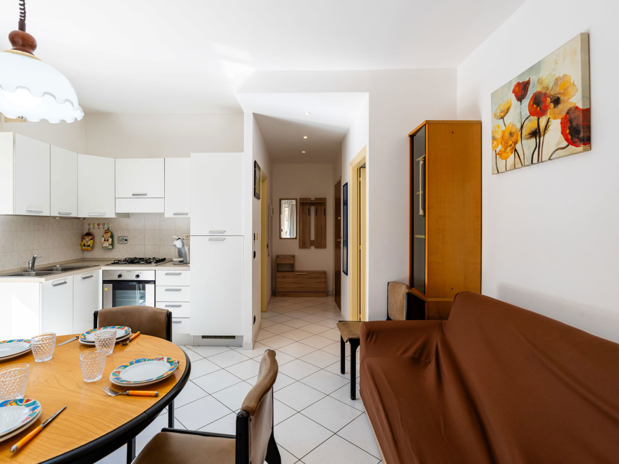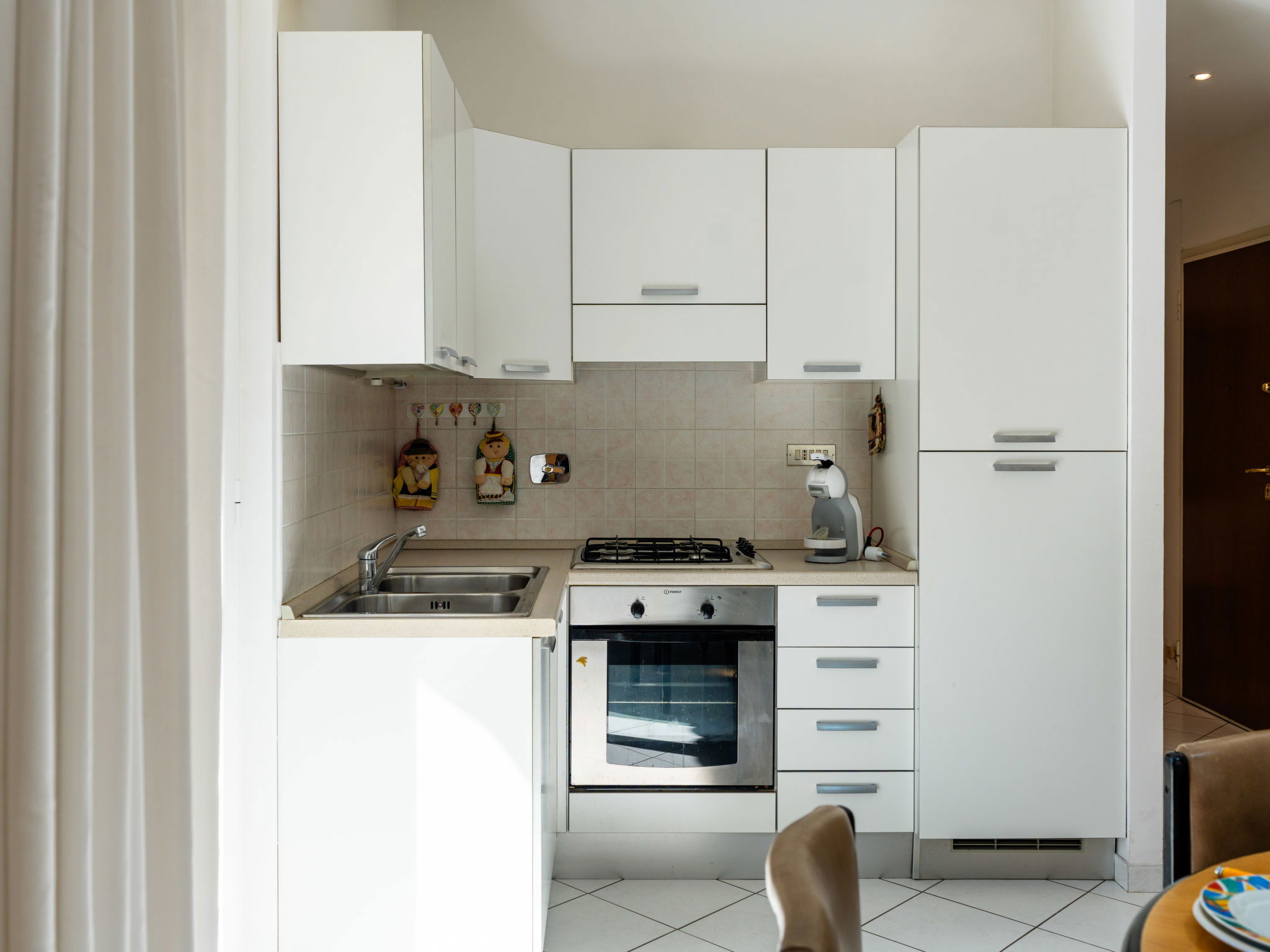 "La Terrazza di San Martino", 3-room apartment 70 m2 on 2nd floor. Beautiful and cosy furnishings: living/dining room with 1 sofabed (140 cm, length 200 cm). Exit to the terrace. 1 double bedroom with 1 x 2 bunk beds (90 cm, length 200 cm). Open kitchen (oven, 4 gas rings, toaster, kettle, electric coffee machine). Exit to the terrace. Shower/bidet/WC. Gas heating. Heating available only from 01.11. to 15.04. Large terrace. Terrace furniture. View of the resort. Facilities: washing machine, children's high chair, baby cot for up to 2 year olds. Internet (WiFi, free). Please note: non-smoking house. 1 pet/ dog allowed. Smoke alarm, fire extinguisher. IT008055B4M7ATYSKA