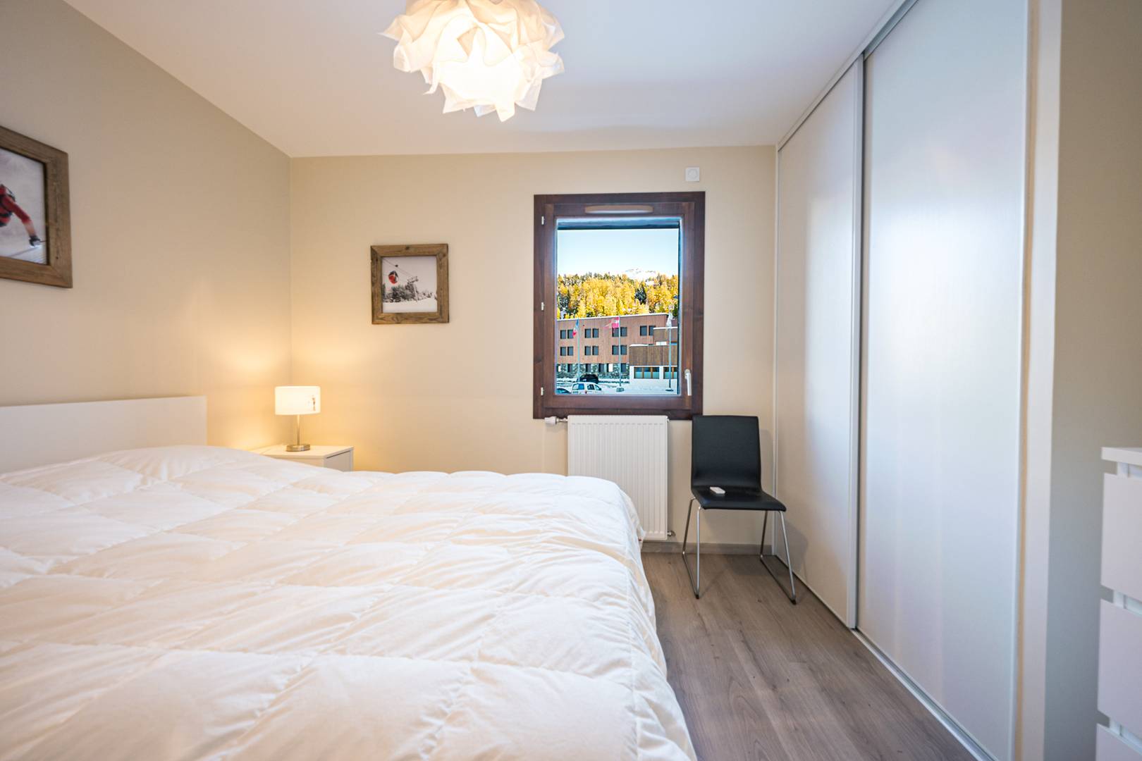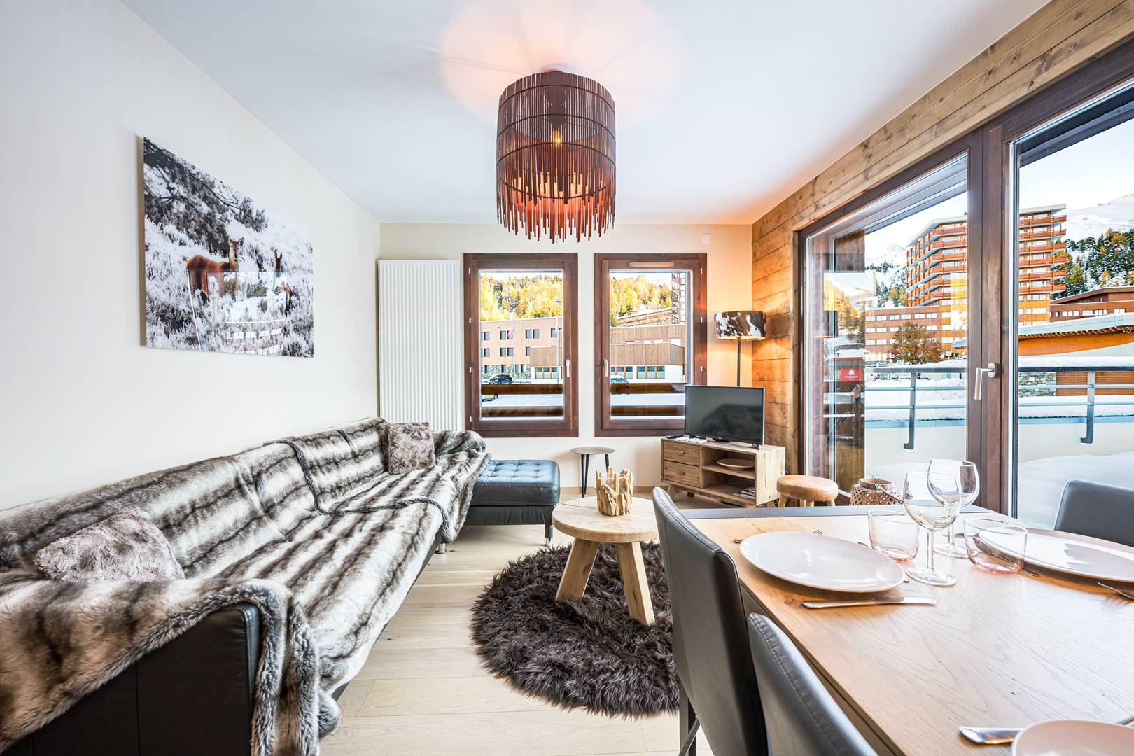- A bright and spacious living room with a television and a large sofa. It has a 52m² south-west facing terrace, which offers a magnificent view of the resort and the mountains.