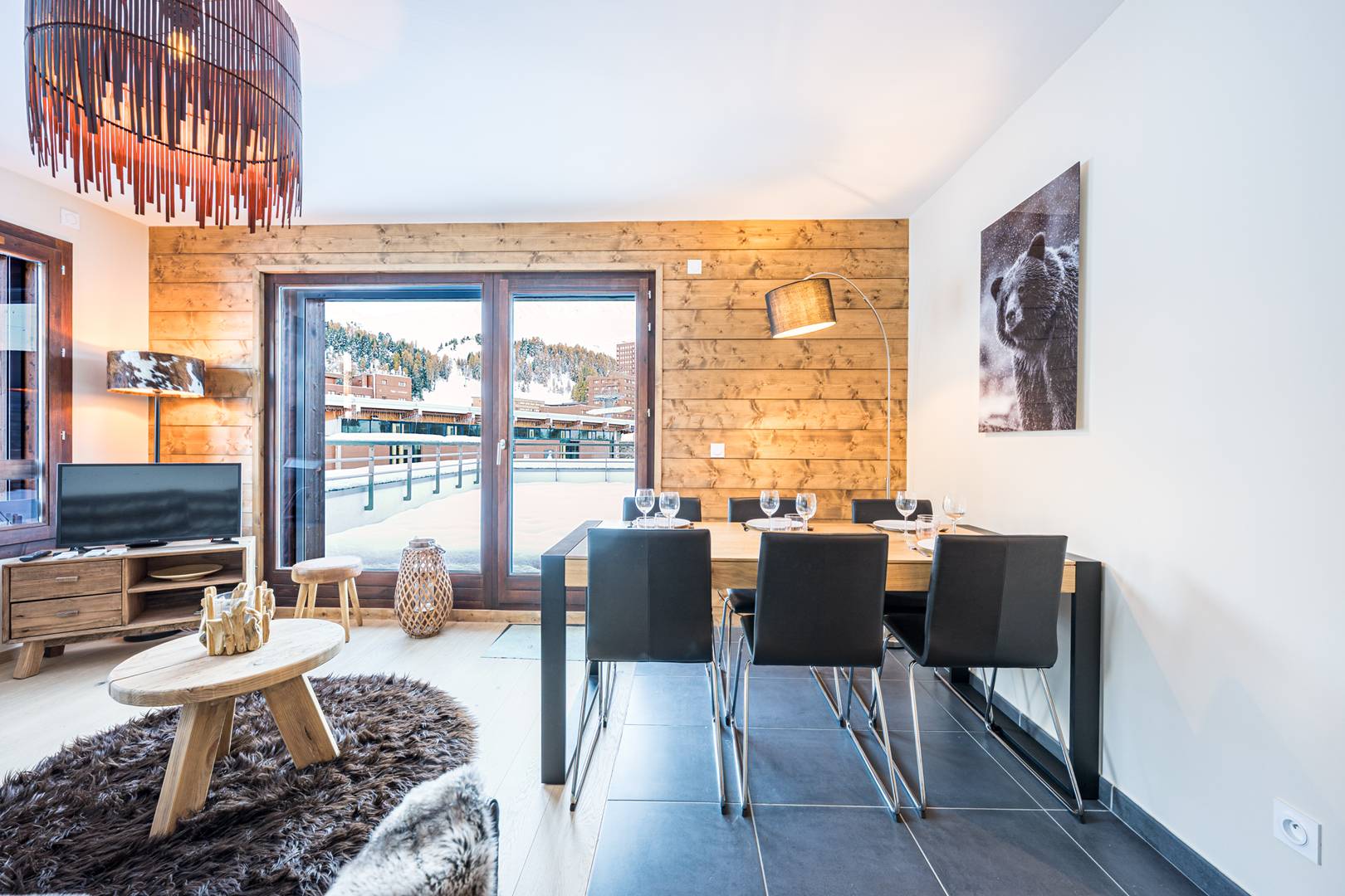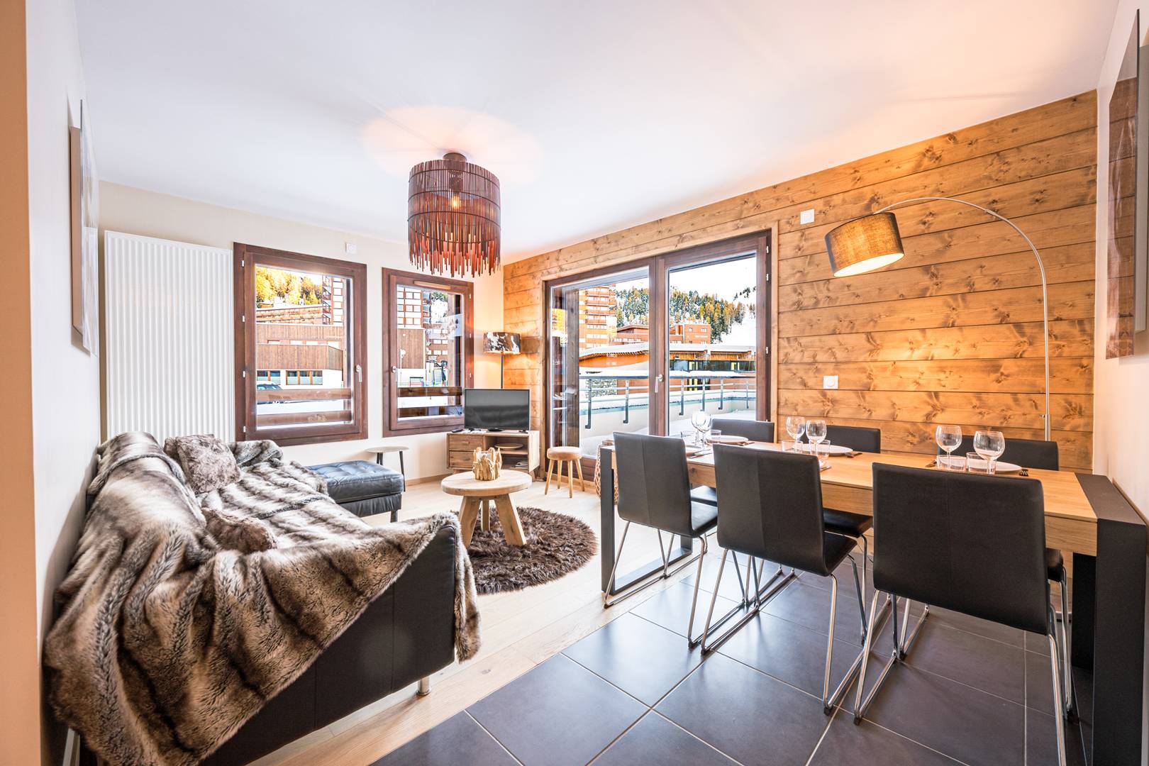 Plagne Centre - Résidence Lodges 1970 - New 3-room apartment on the 6th floor located in Plagne Centre, approximately 64m² for 4 people with a 52m² south-west facing terrace. 2 covered parking spaces.