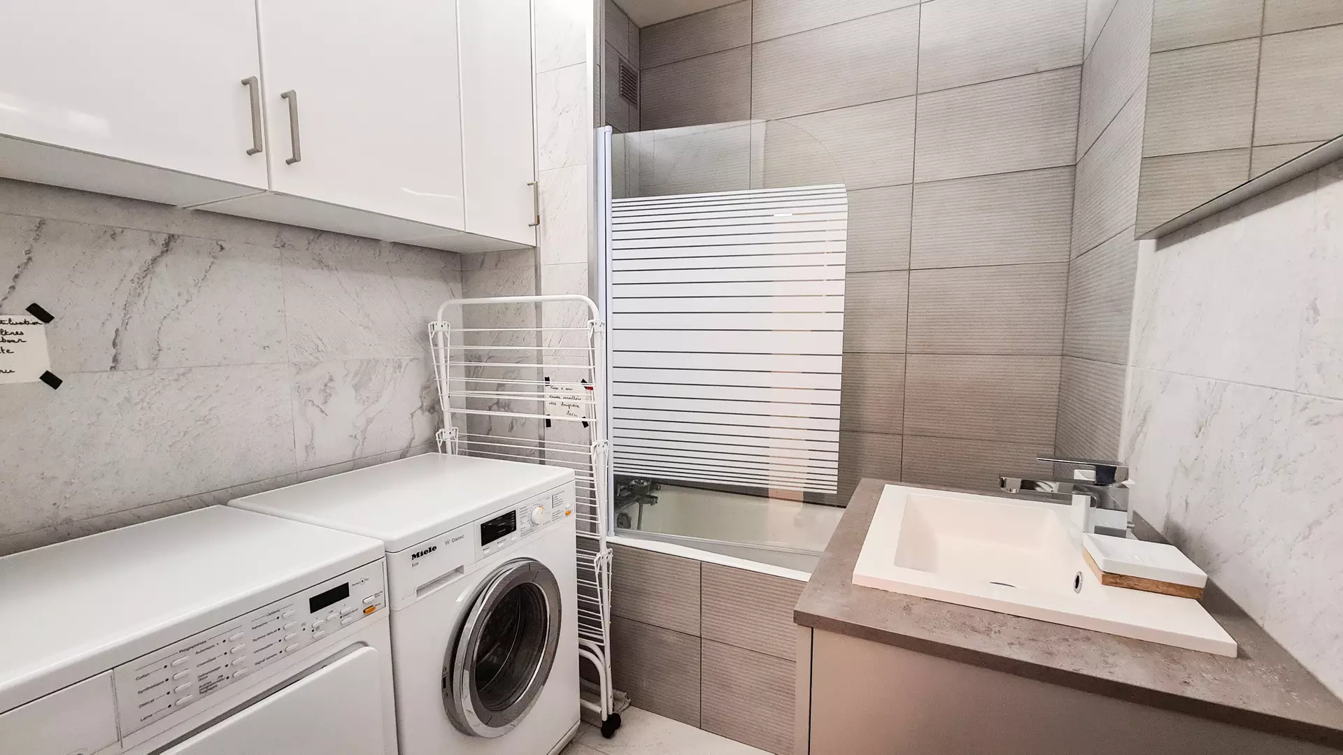 - Bathroom with bathtub, Miele washing machine, tumble dryer, towel radiator