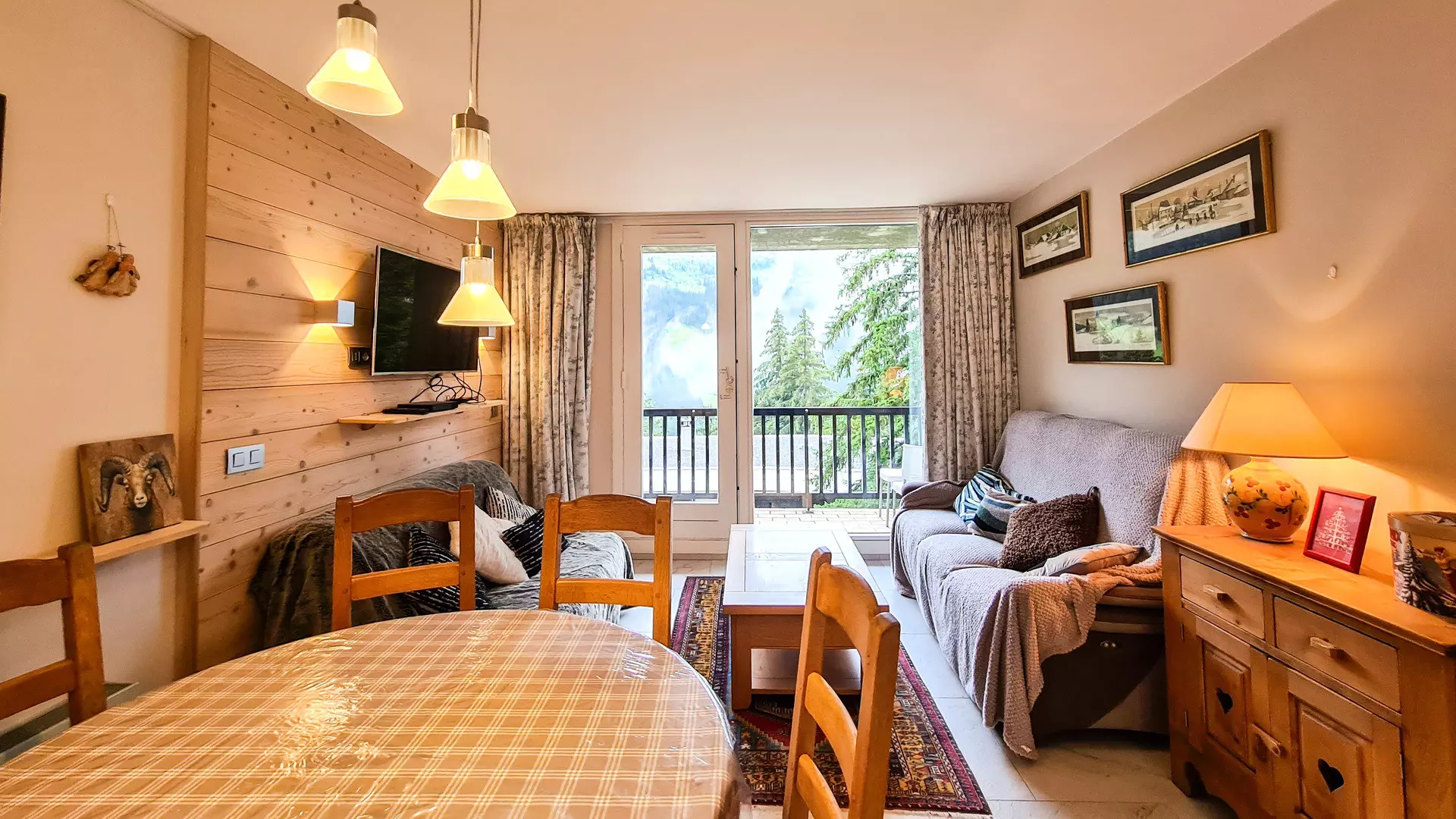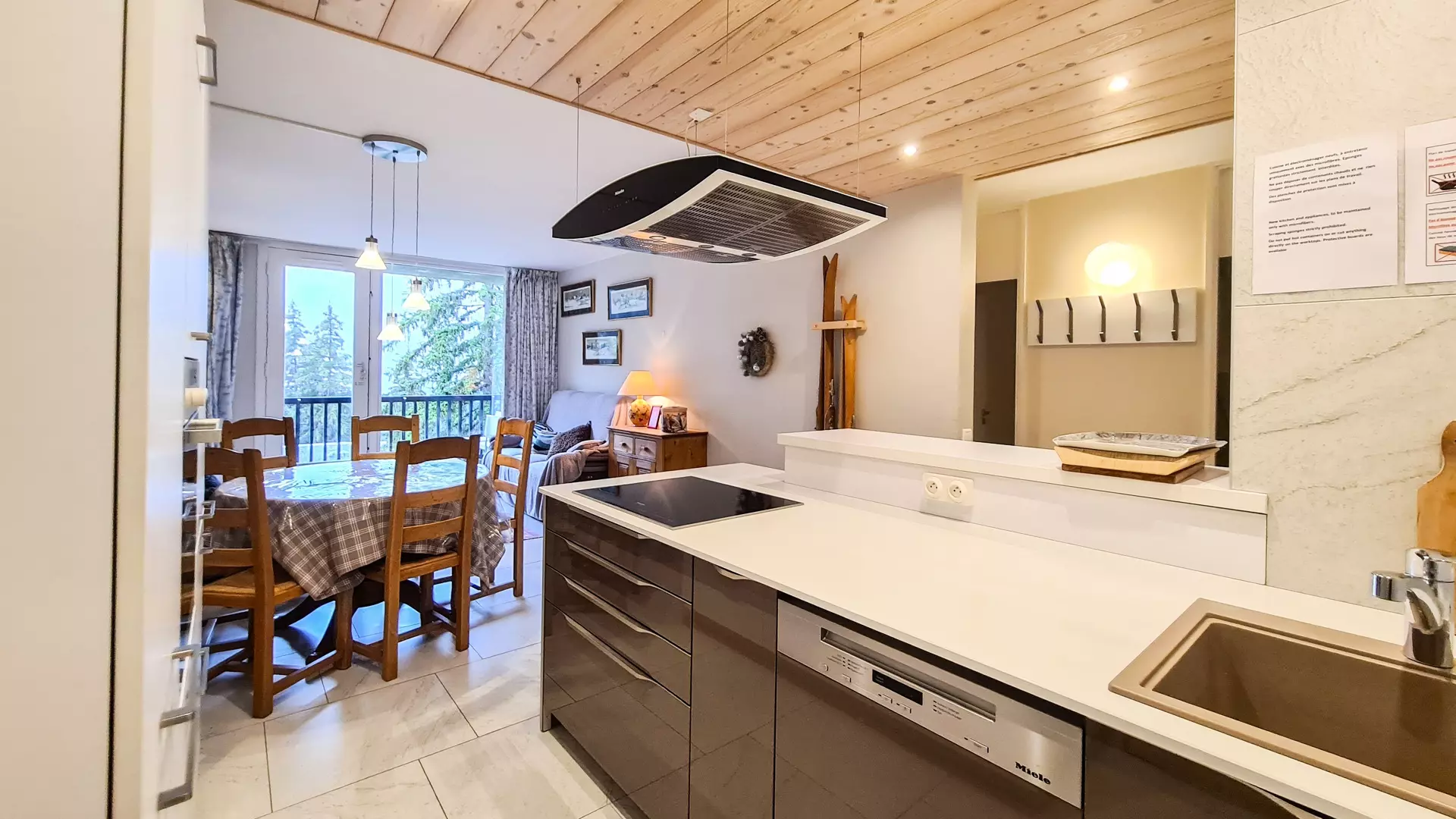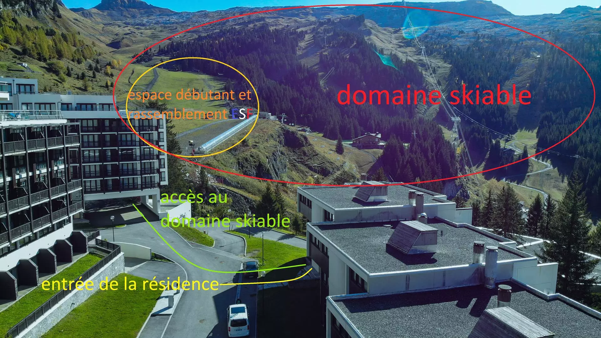 Large 2-room cabin South comfort 48 m2 on the 1st floor (entrance floor, only 2 steps to access) very spacious and facing South. Large balcony. Very quiet. Located at the foot of the slopes and the ski school meeting point