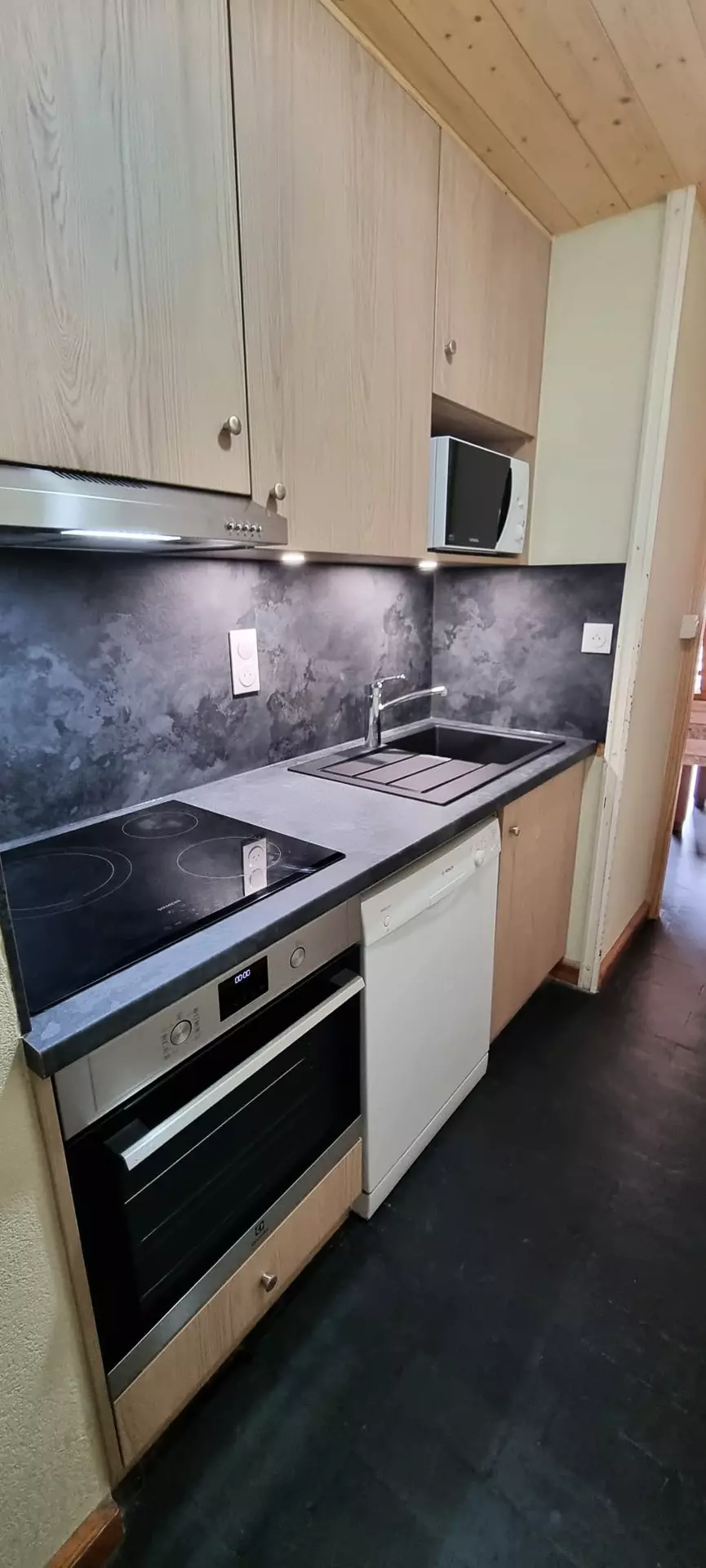 The separate kitchen is equipped with electric hobs, an oven, a microwave and a dishwasher.