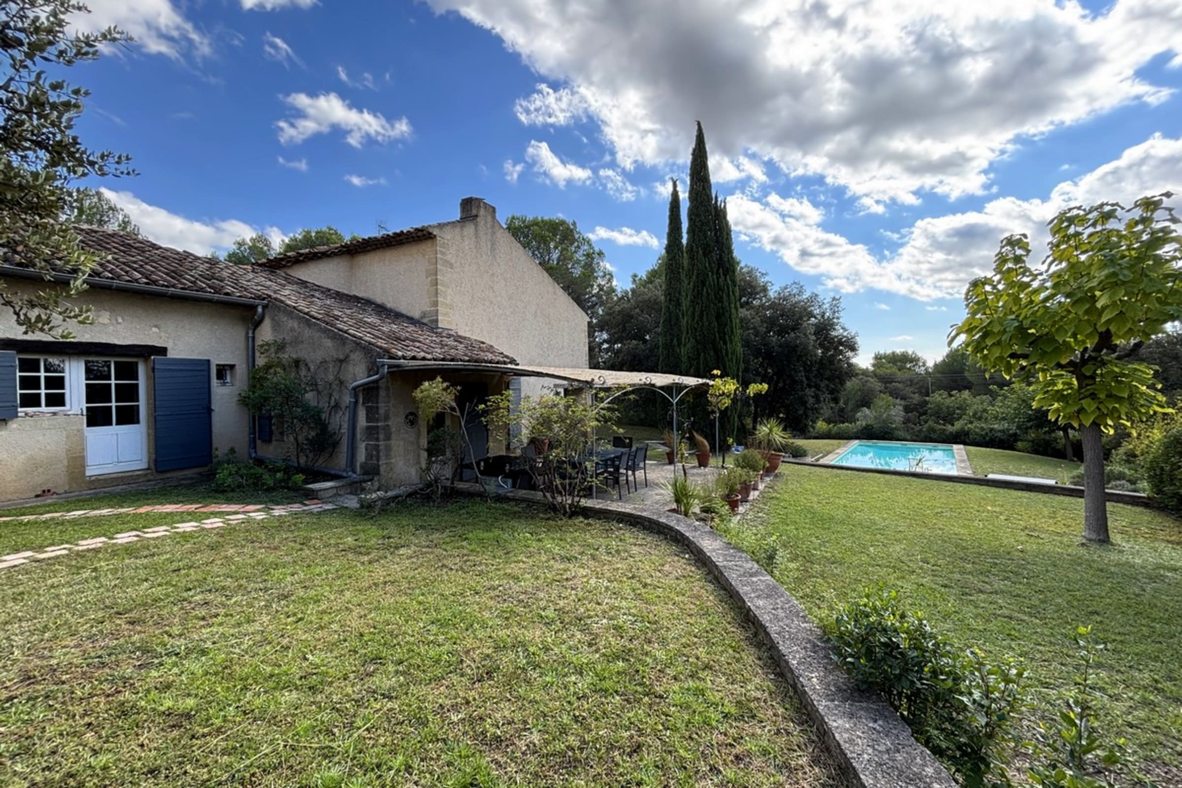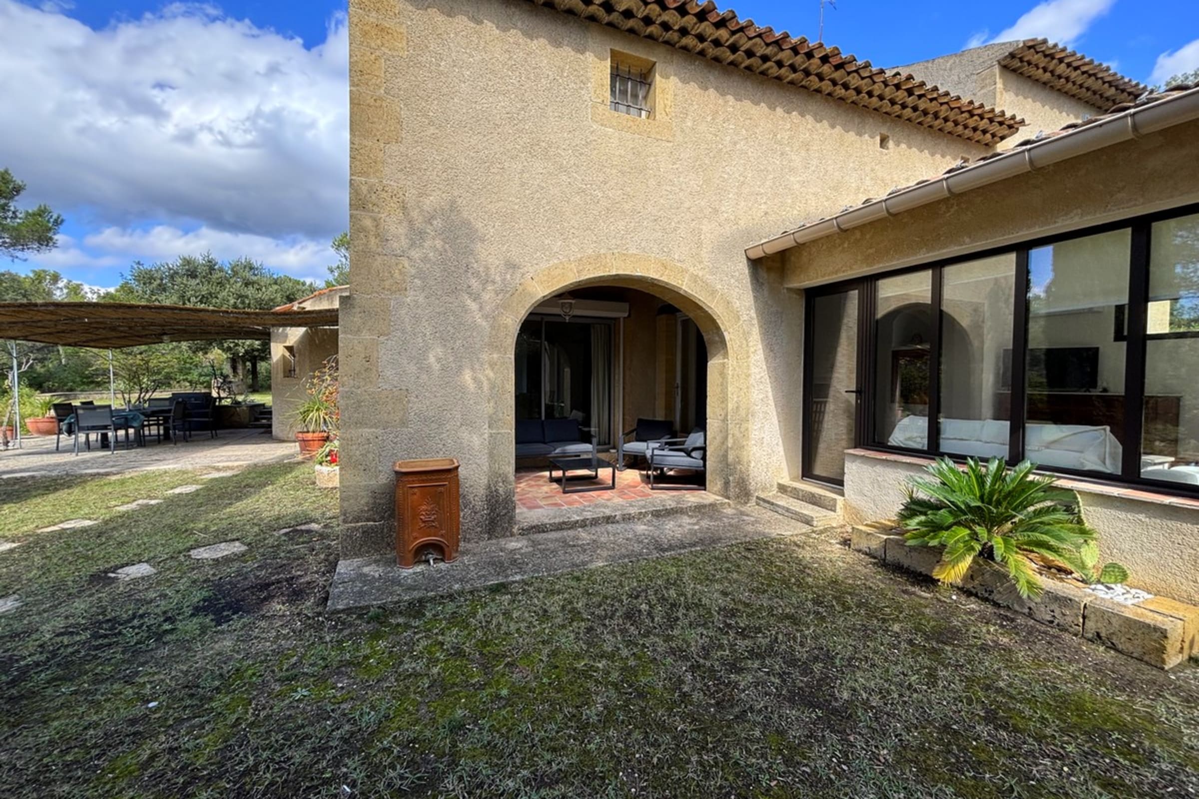 * Shaded terrace with large table and barbecue.