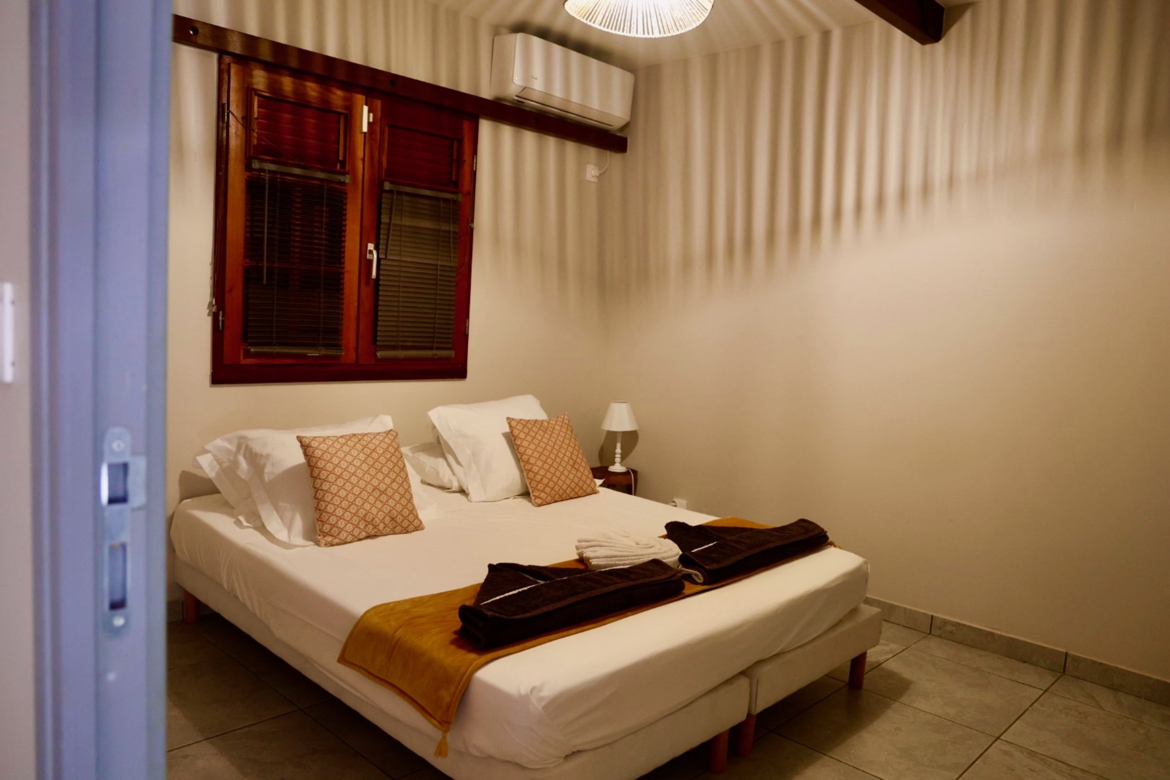 A haven of peace nestled on the outskirts of Sainte-Anne, ideal for a peaceful getaway. The Orchyd & Ka Residence offers 5 inviting bungalows total that host up to 16 guests. The Kaz Mendé bungalow combines Creole charm with contemporary comfort, offering a setting conducive to relaxation and conviviality. With 66 m² of single-storey space, it comfortably accommodates up to 4 people thanks to its two cosy bedrooms, both equipped with a 160 cm double bed. The modern bathroom includes a walk-in shower and toiletries for your well-being.