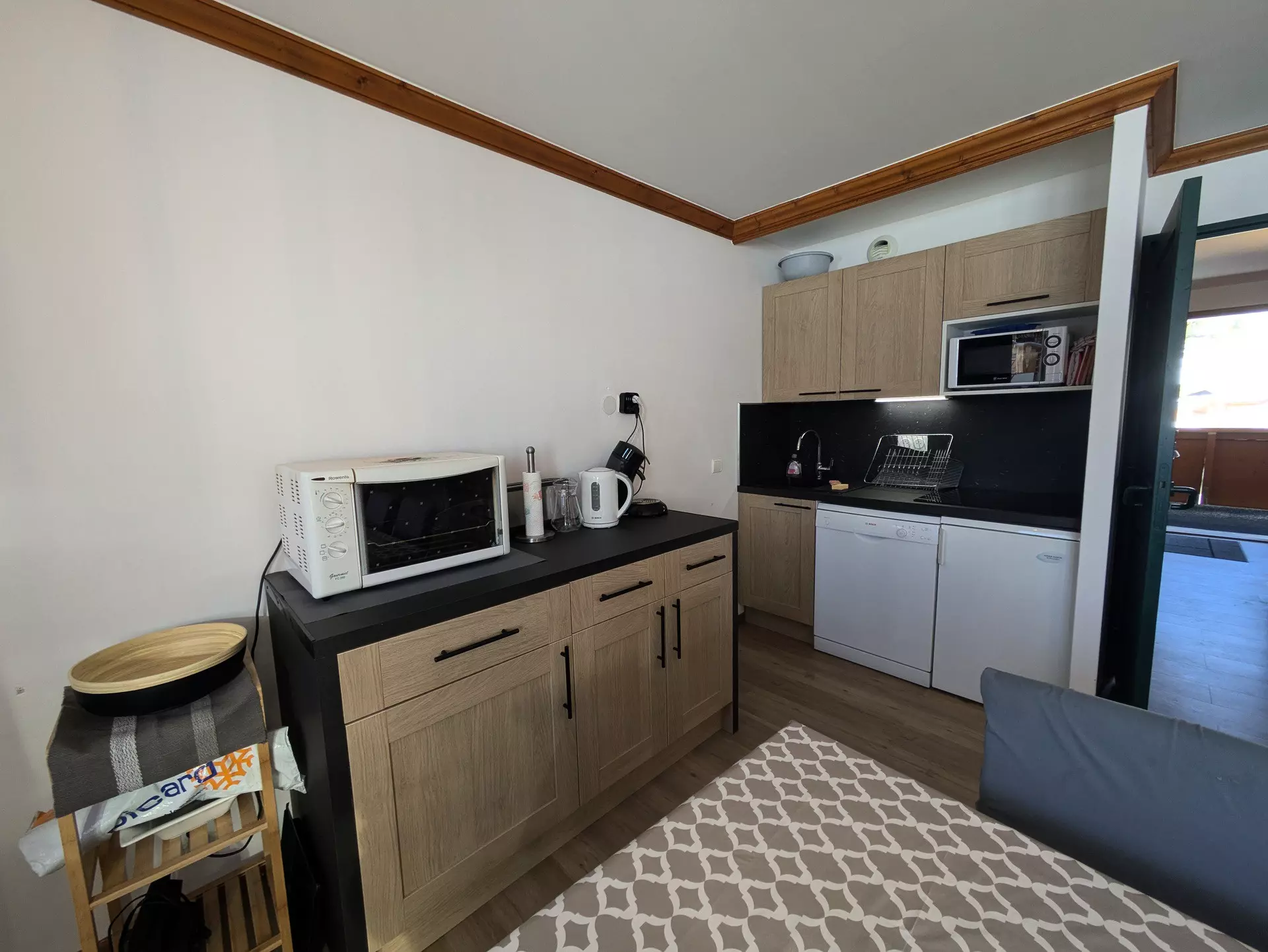 For your comfort, the kitchen, open to the living room, is equipped with 4 electric hotplates, 1 oven, 1 refrigerator and 1 dishwasher.