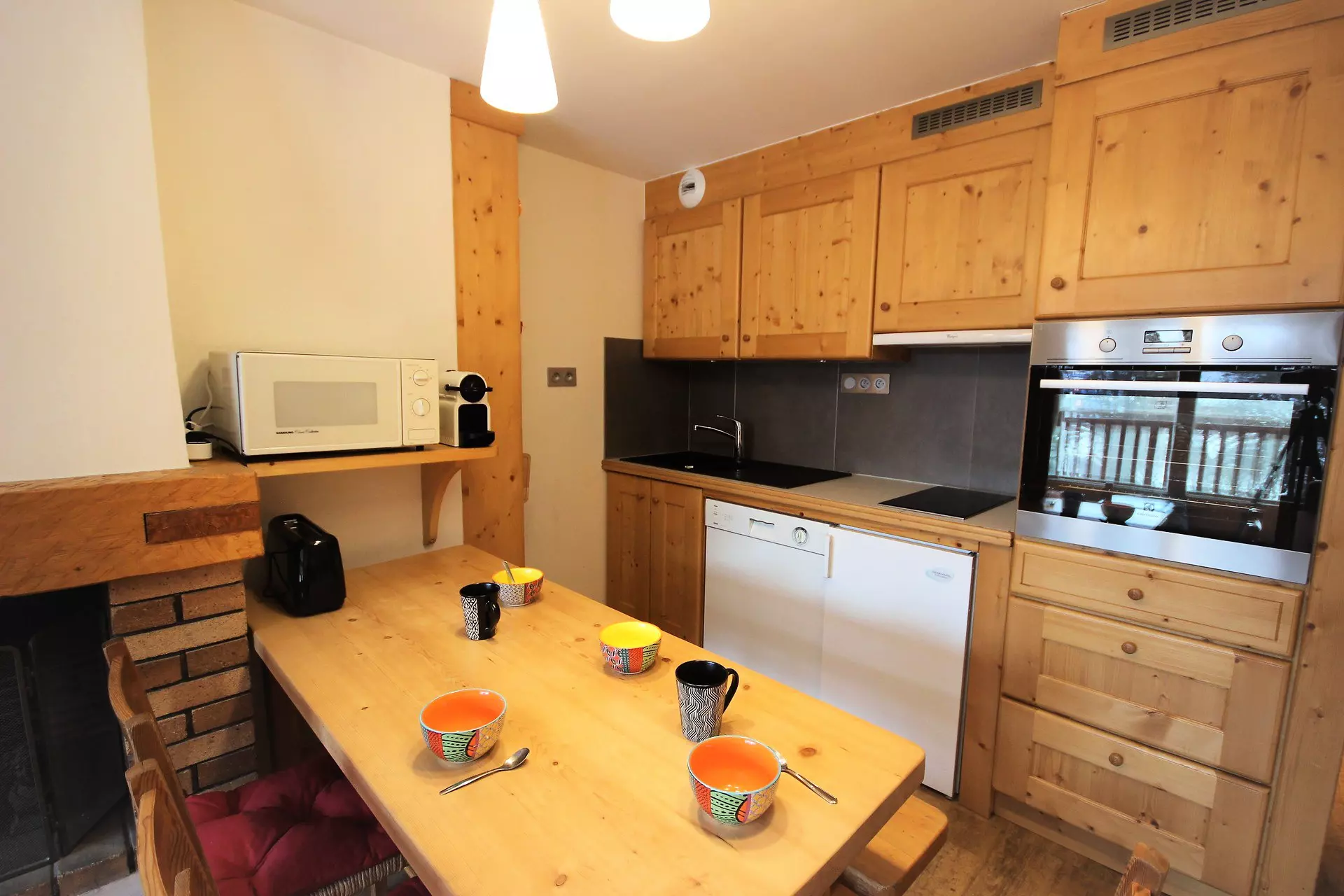 It is equipped with ceramic hobs, a dishwasher, an oven, a microwave and a refrigerator.
