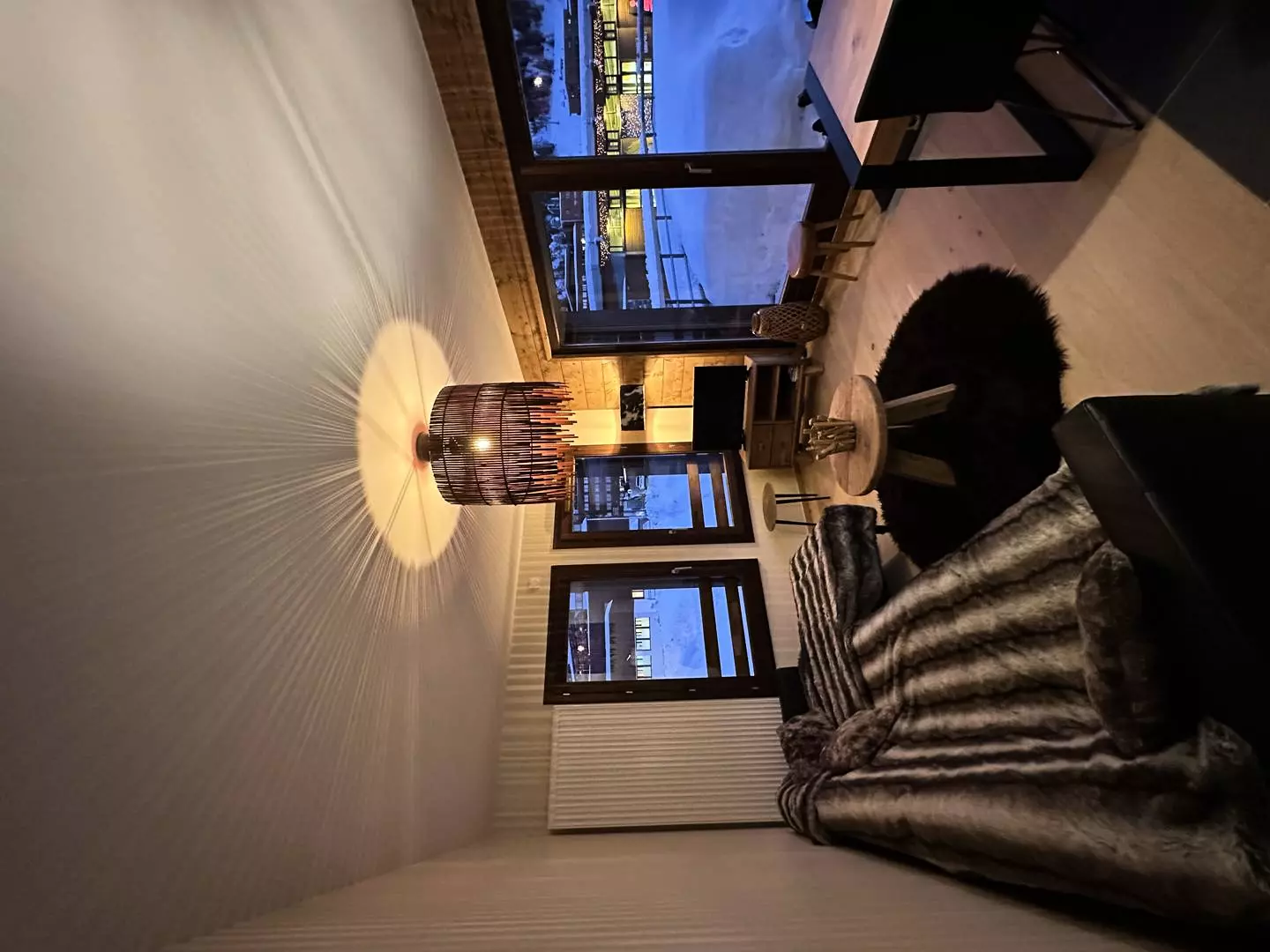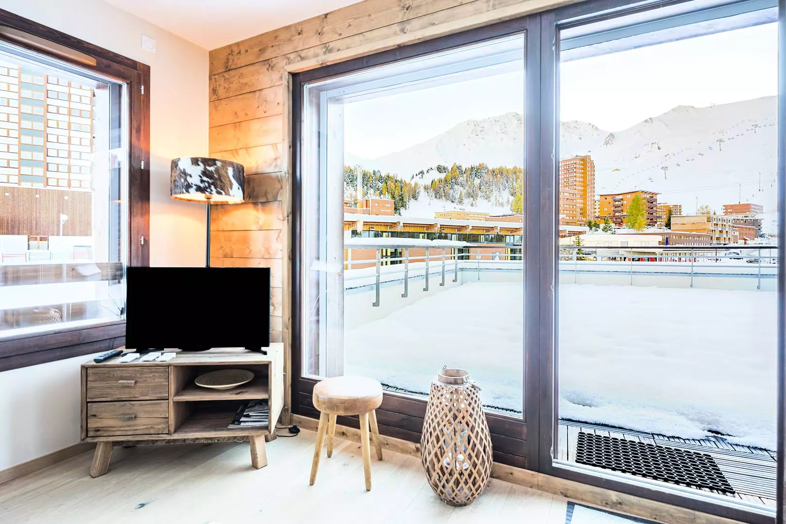 - A bright and spacious living room with a television and a large sofa. It benefits from a 52m2 southwest-facing terrace, which offers a magnificent view of the resort and the mountains.