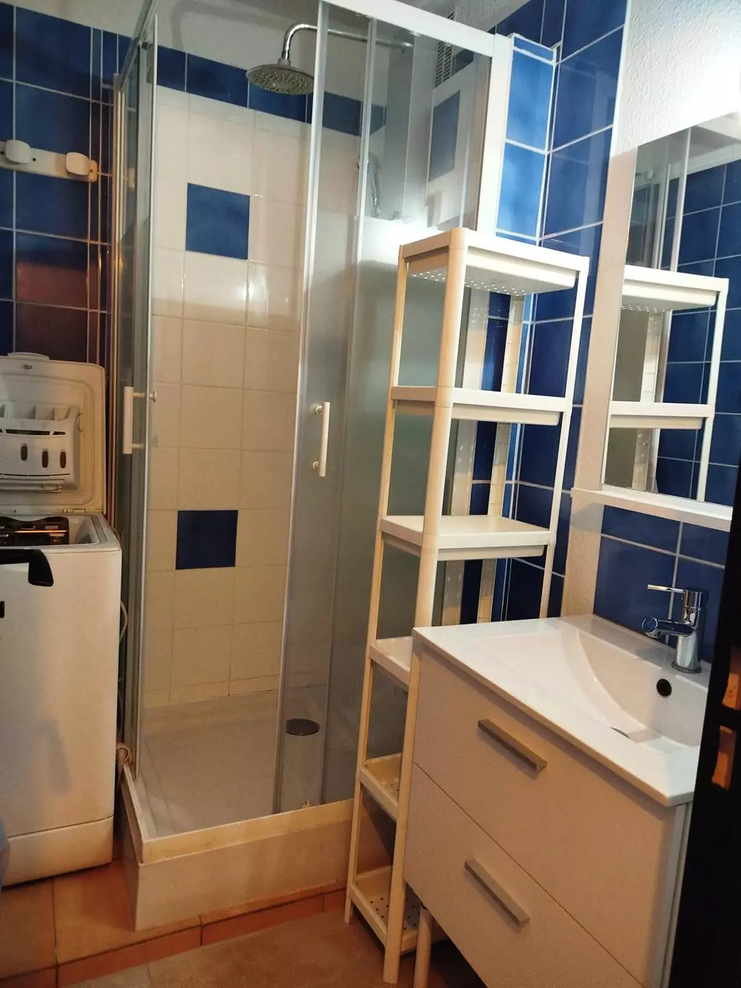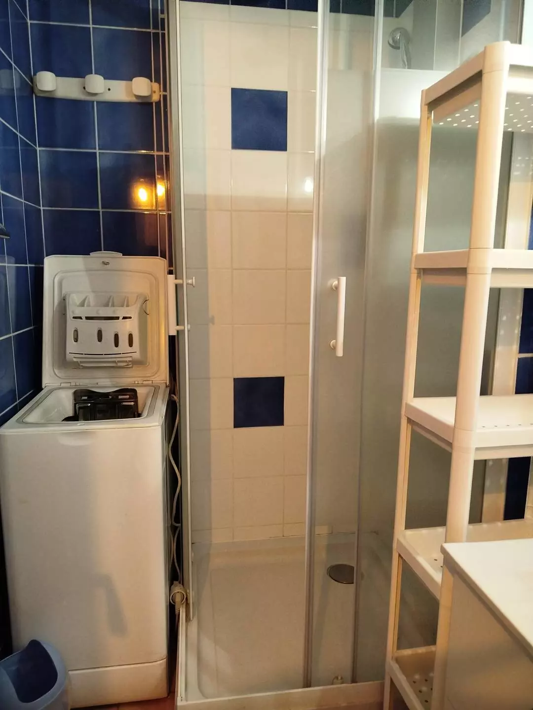 Shower room with shower and washing machine, separate toilet