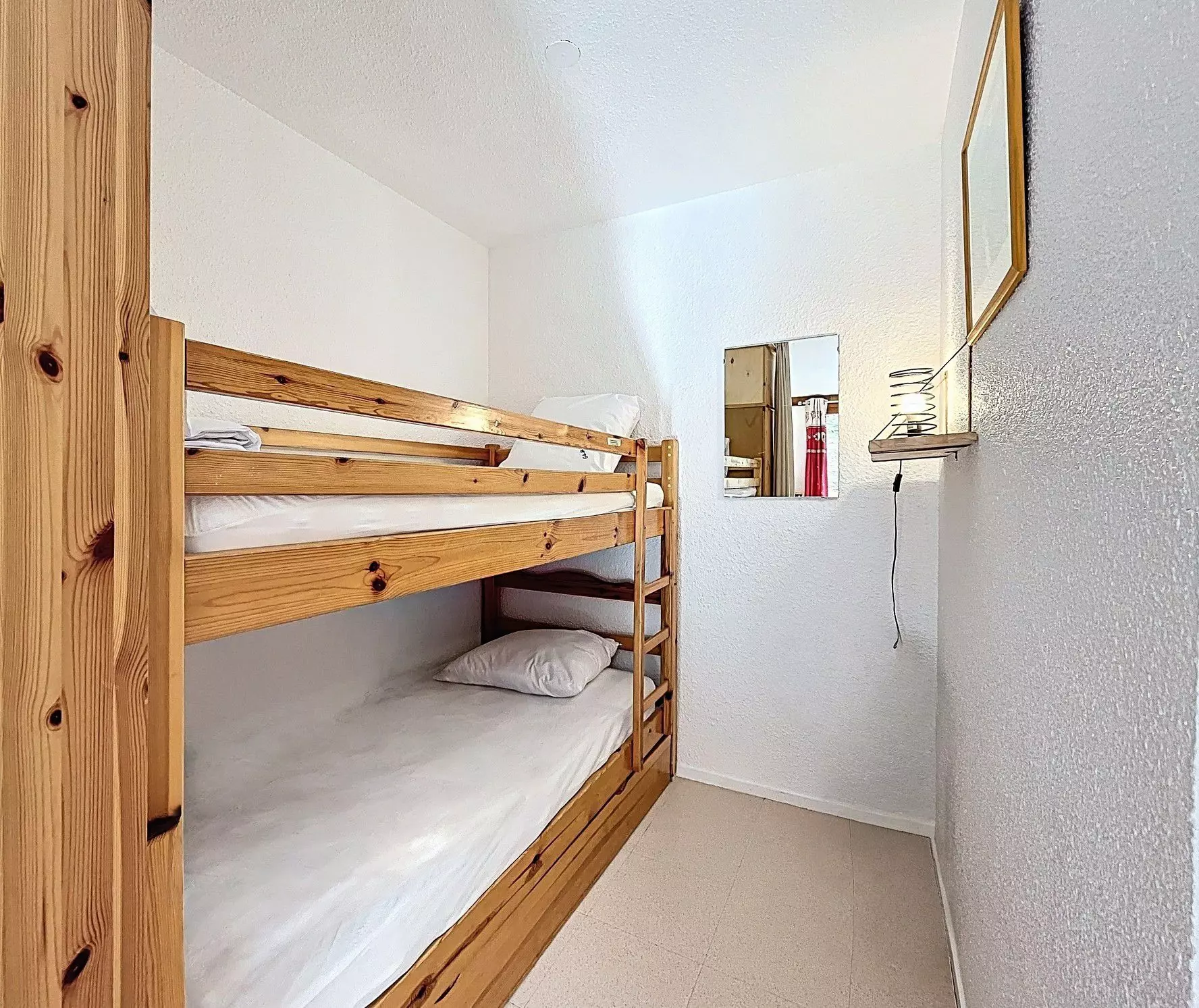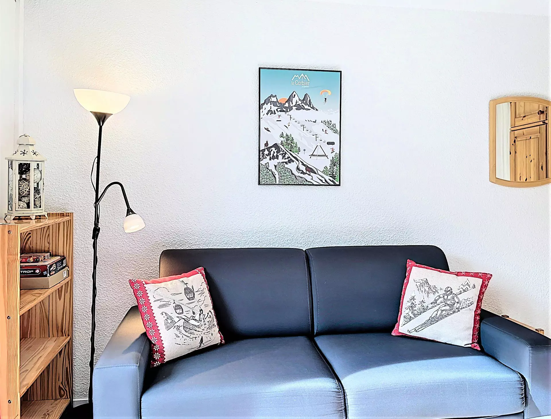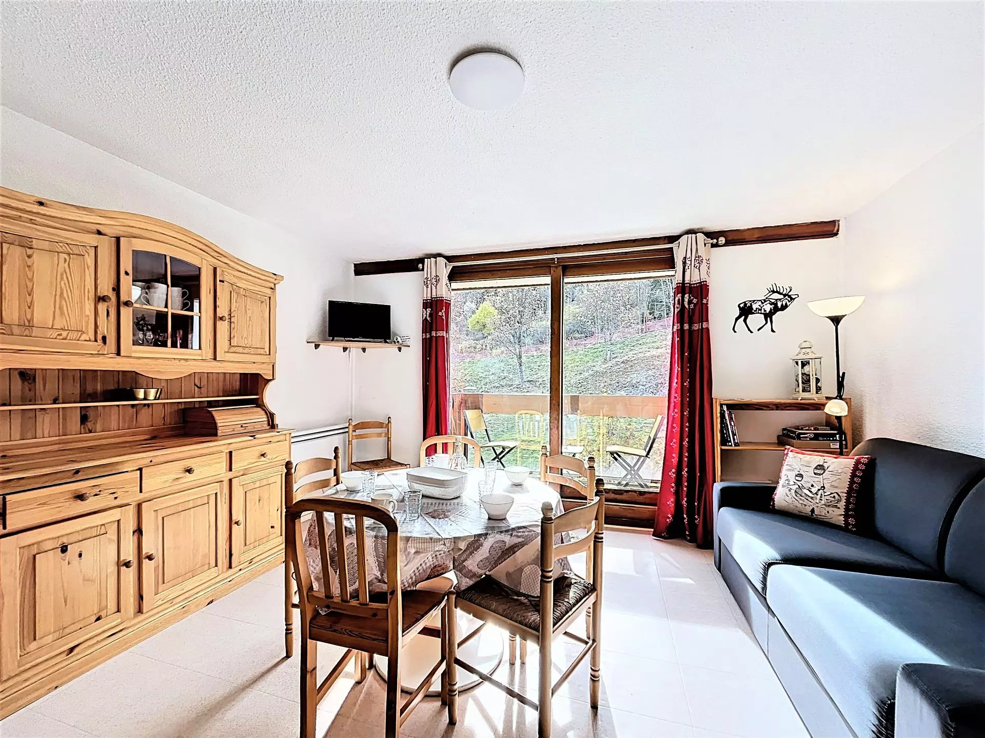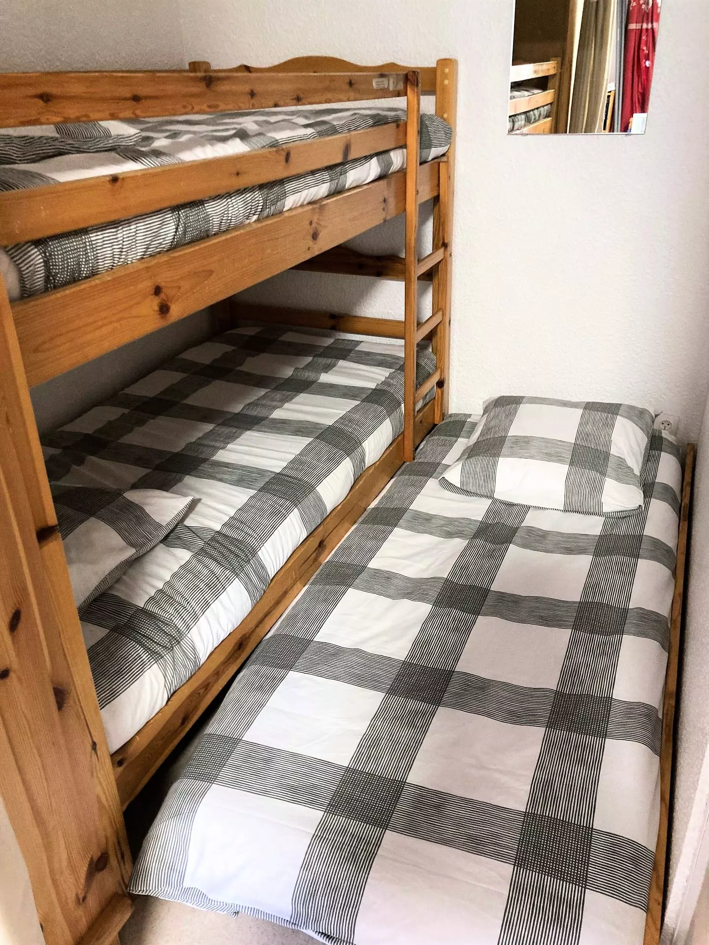 The living room is pleasant and furnished with pine furniture. It includes a double sofa bed, a television, and a large bay window overlooking the slopes. It also features a separate alcove with two bunk beds.
