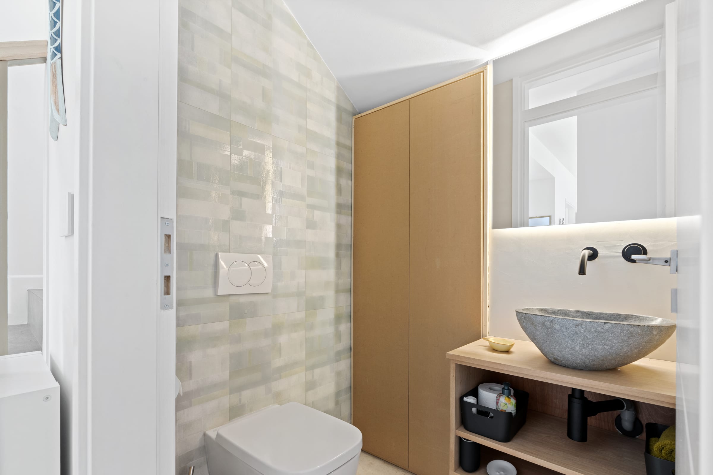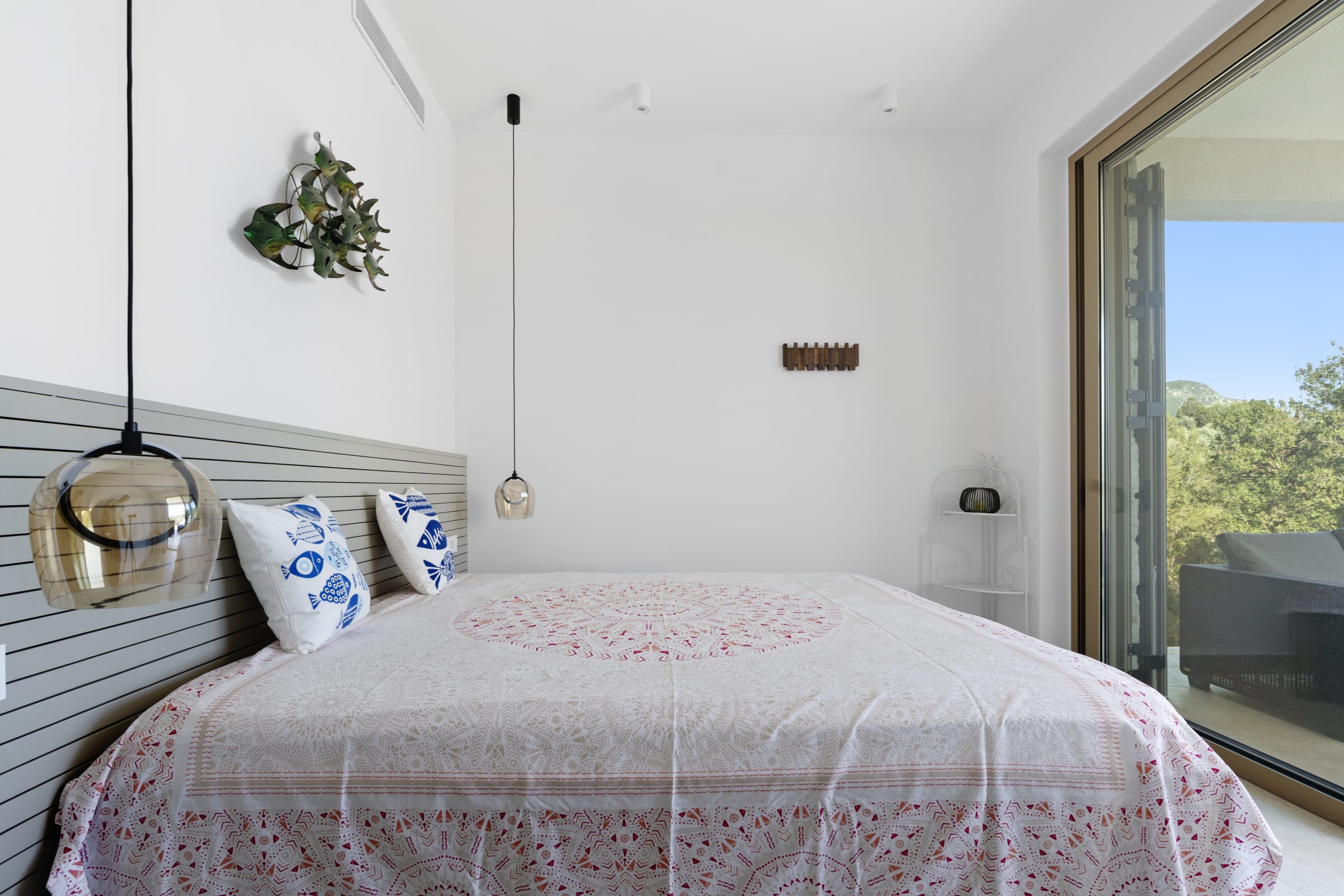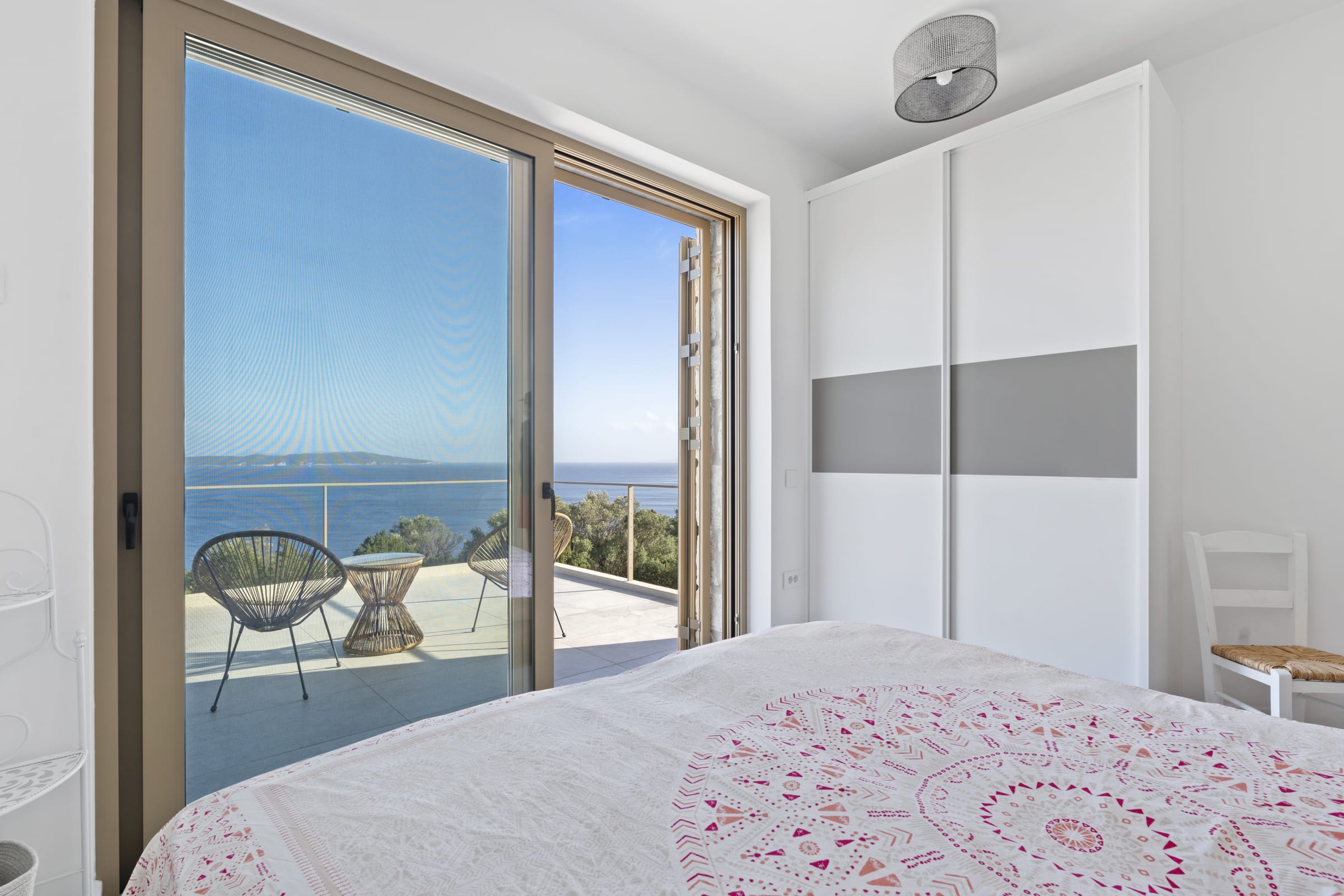 Set on a beautifully landscaped, tree-filled 4,000-square-meter plot, the property features a bright, open-plan living area facing the sea, a fully equipped, modern kitchen, and two comfortable bedrooms, each with its own bathroom and terrace access as well as a separate guest toilet.