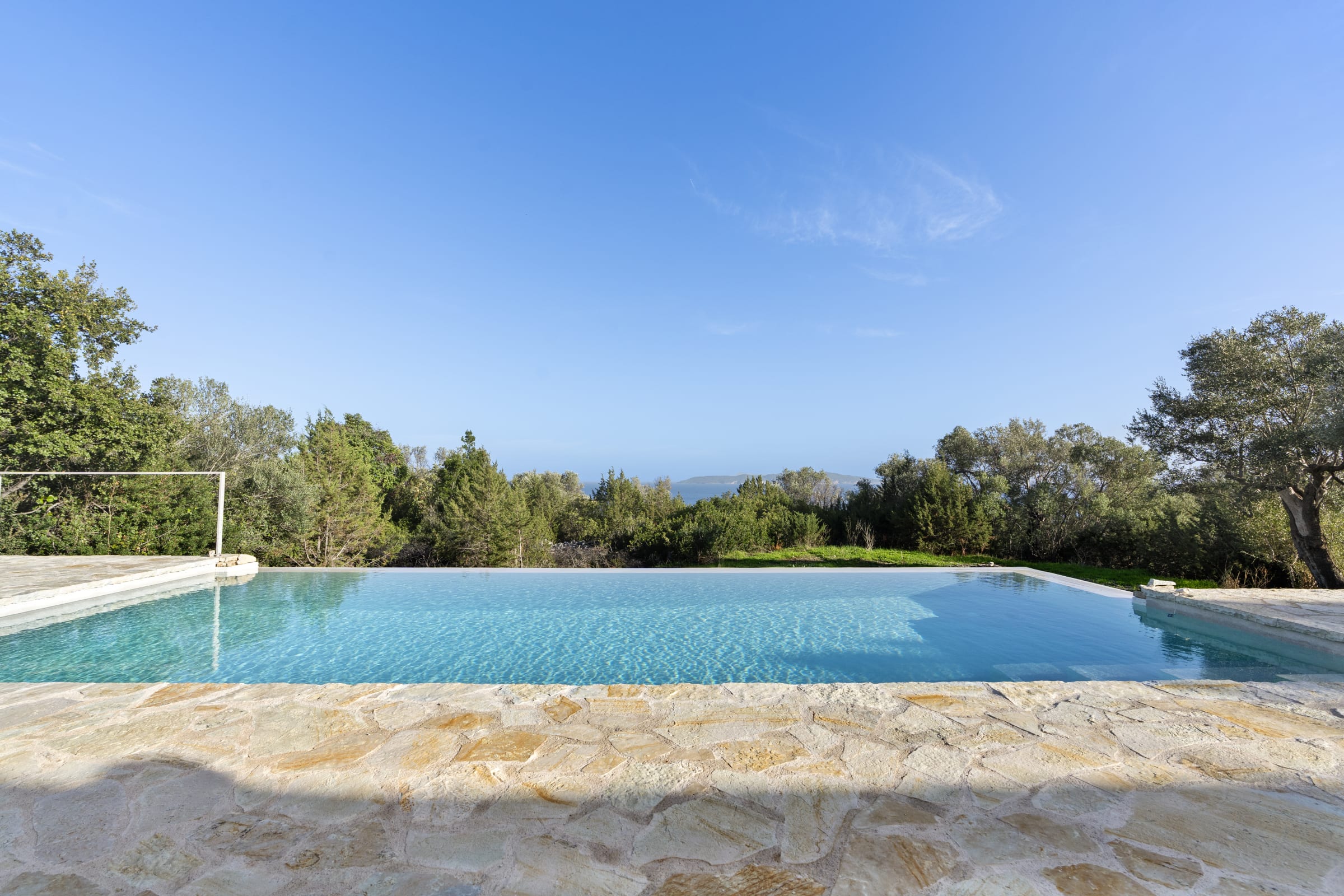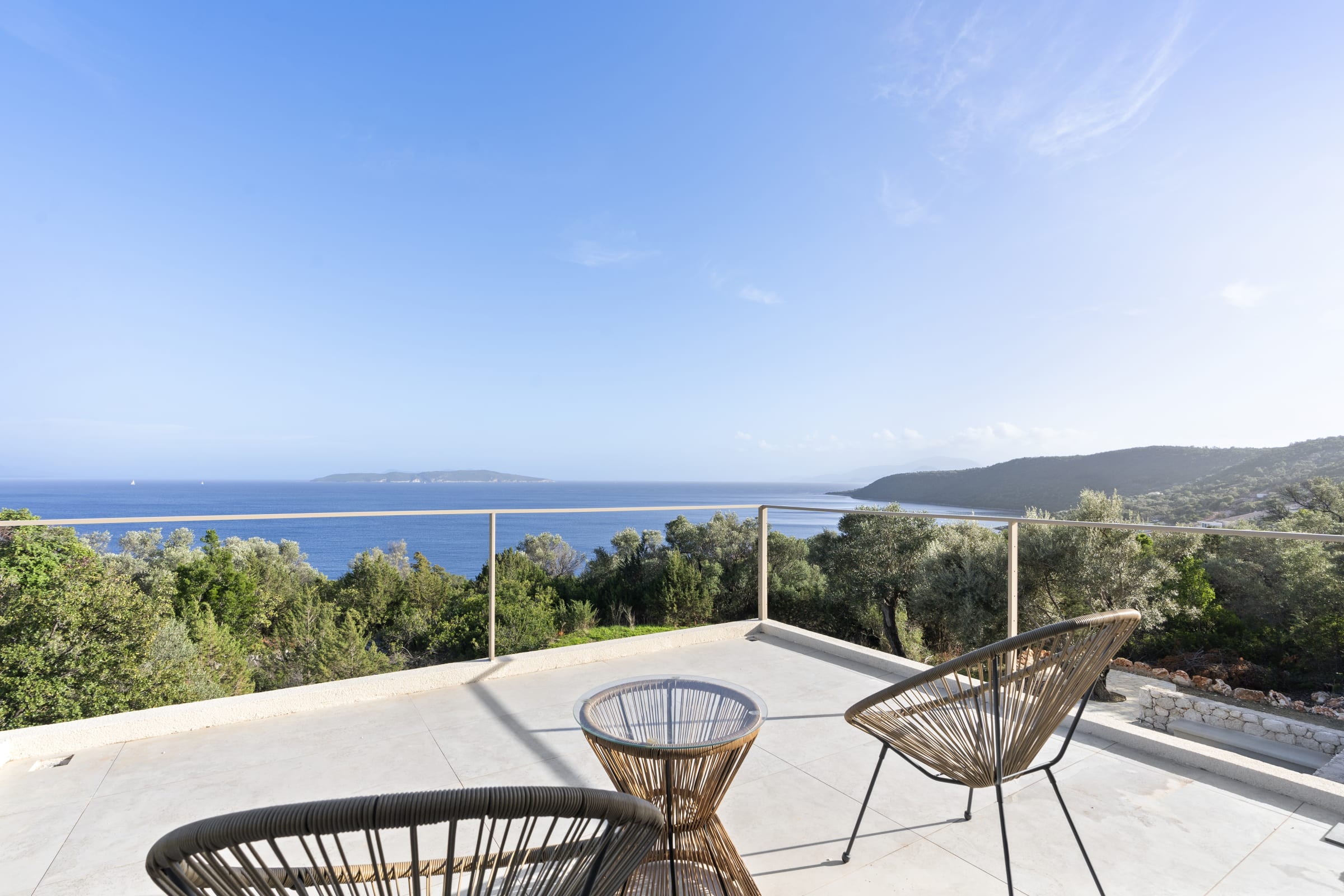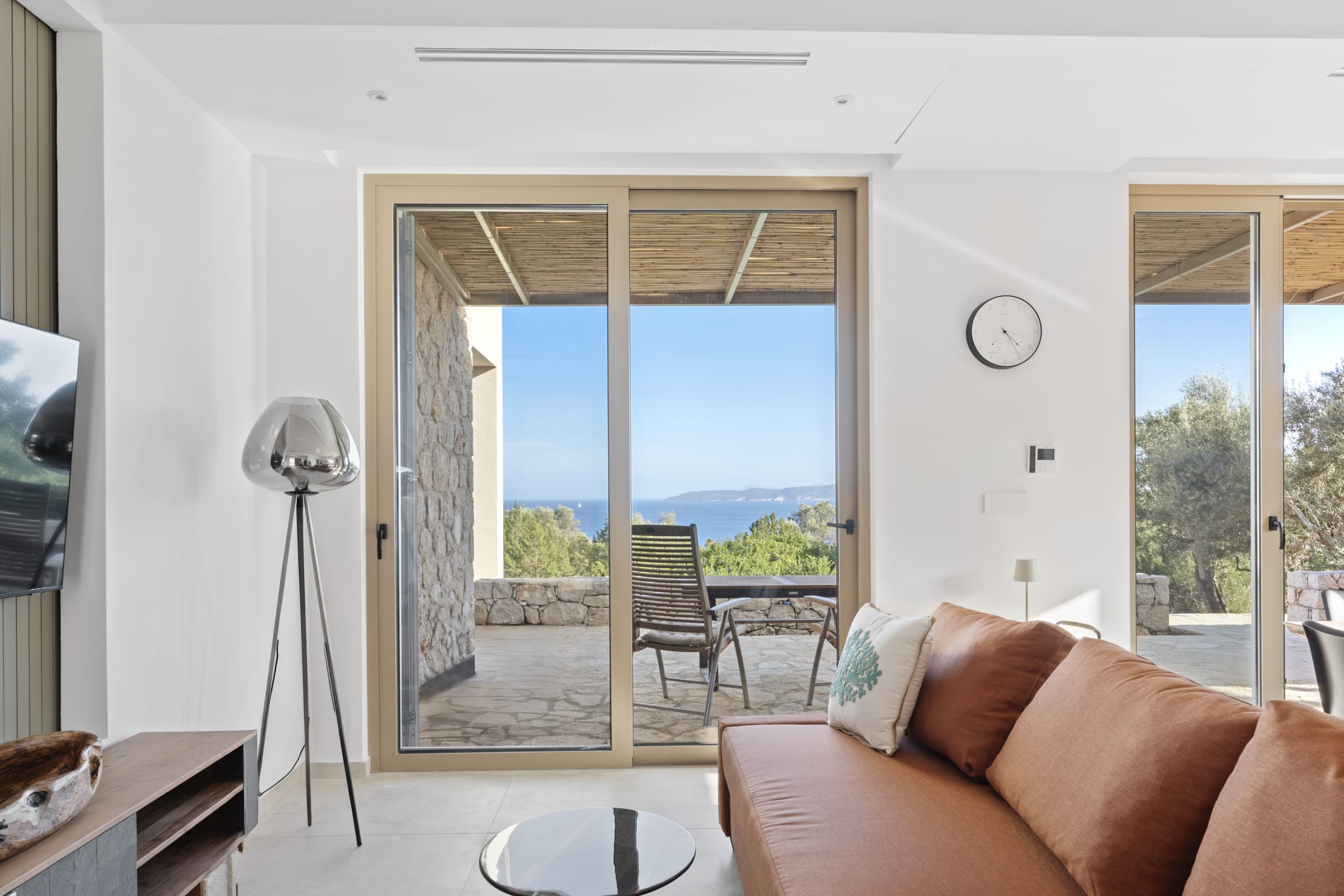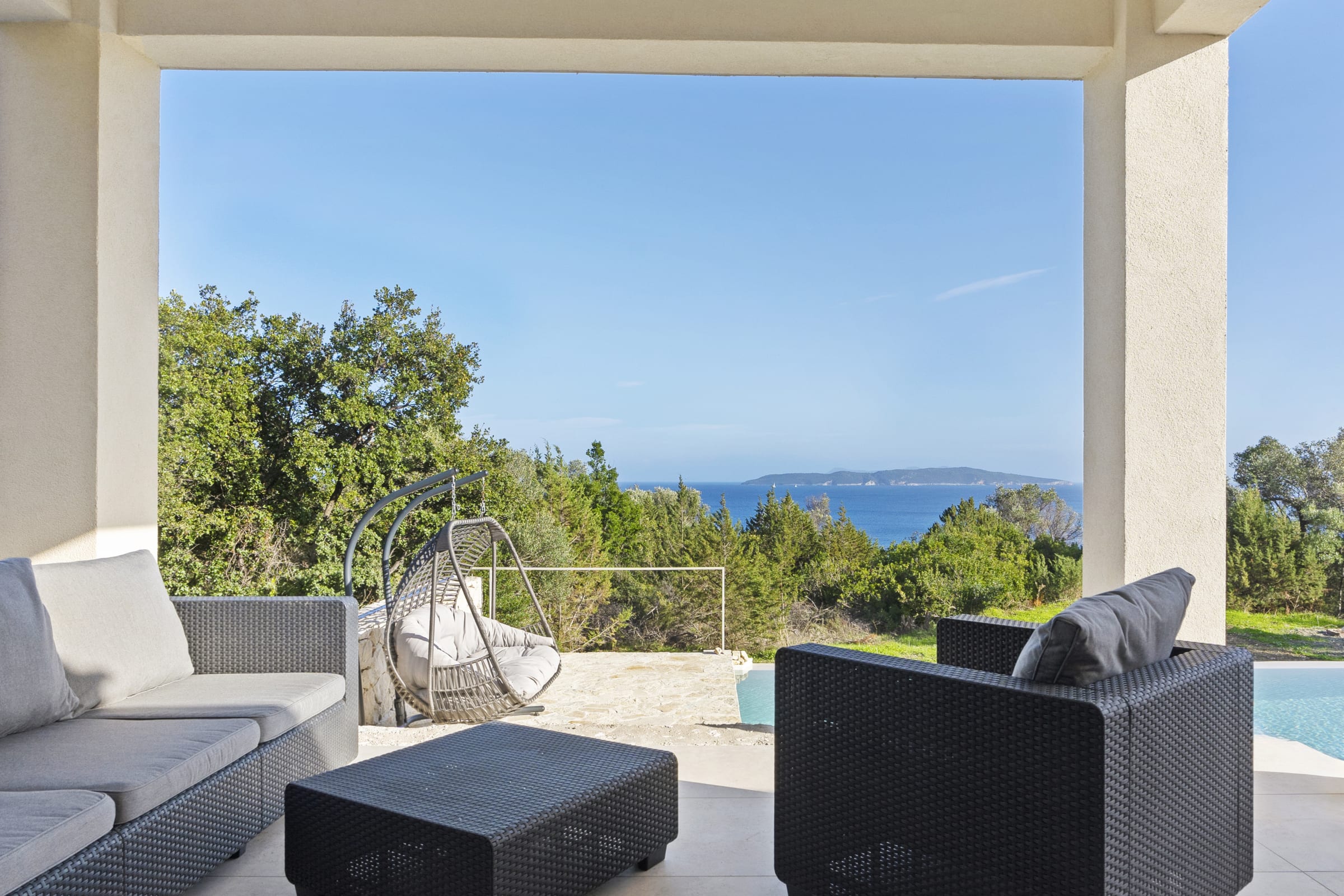 Outdoors, the south-facing infinity pool invites you to enjoy panoramic views of the Ionian Sea and the nearby hills.