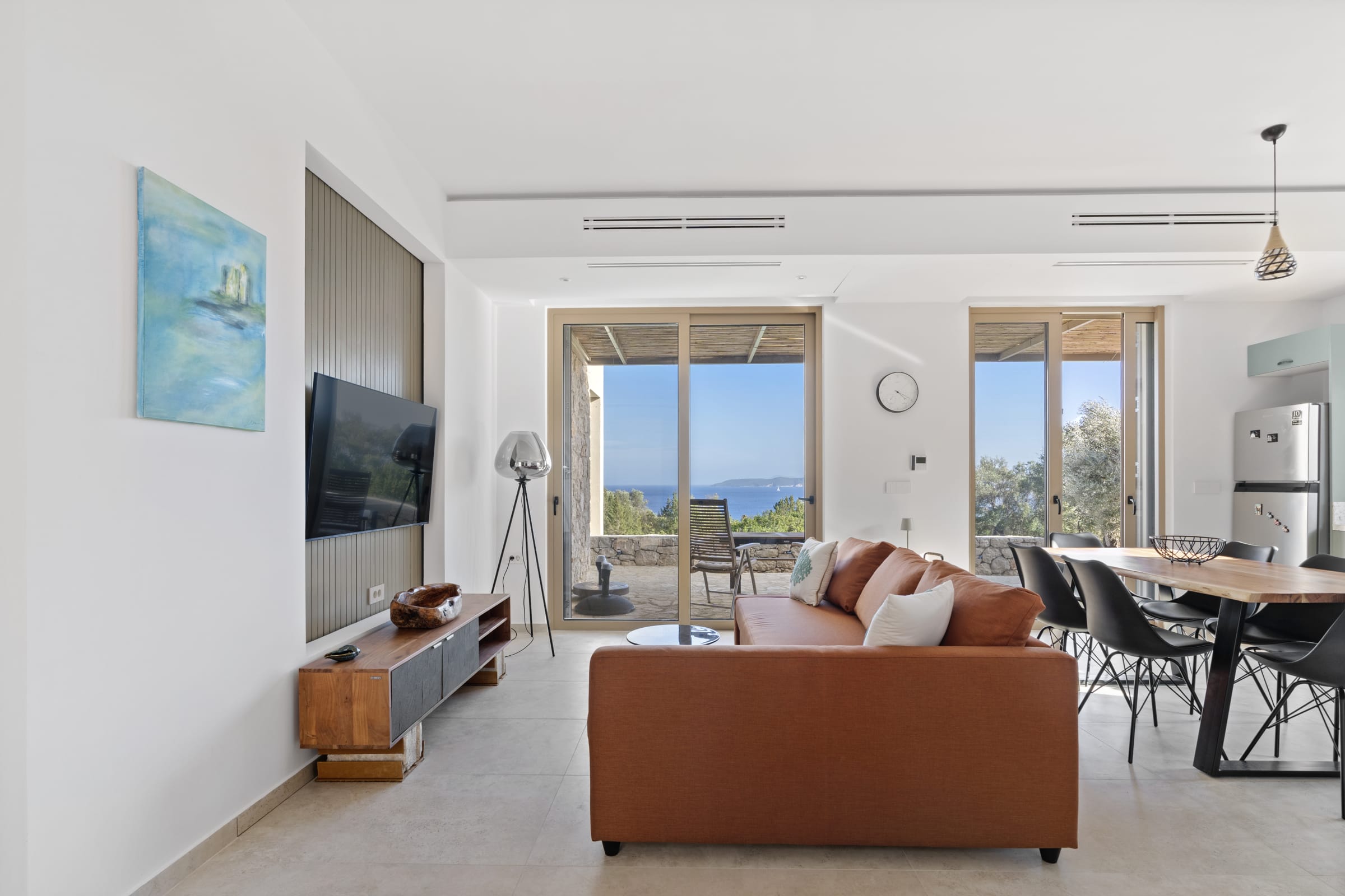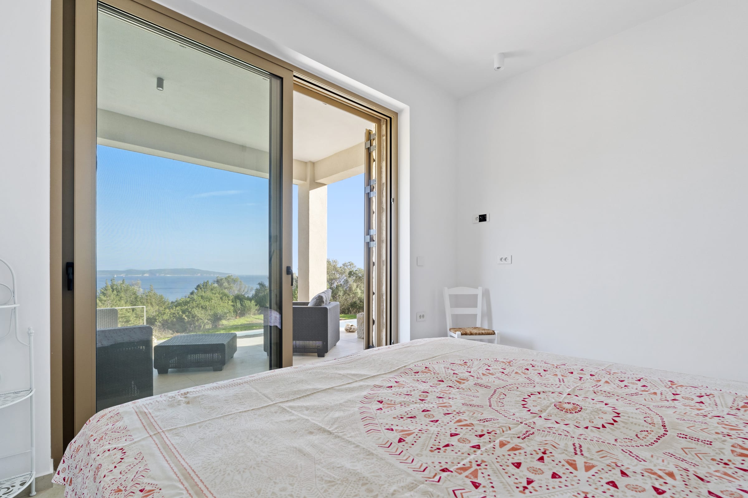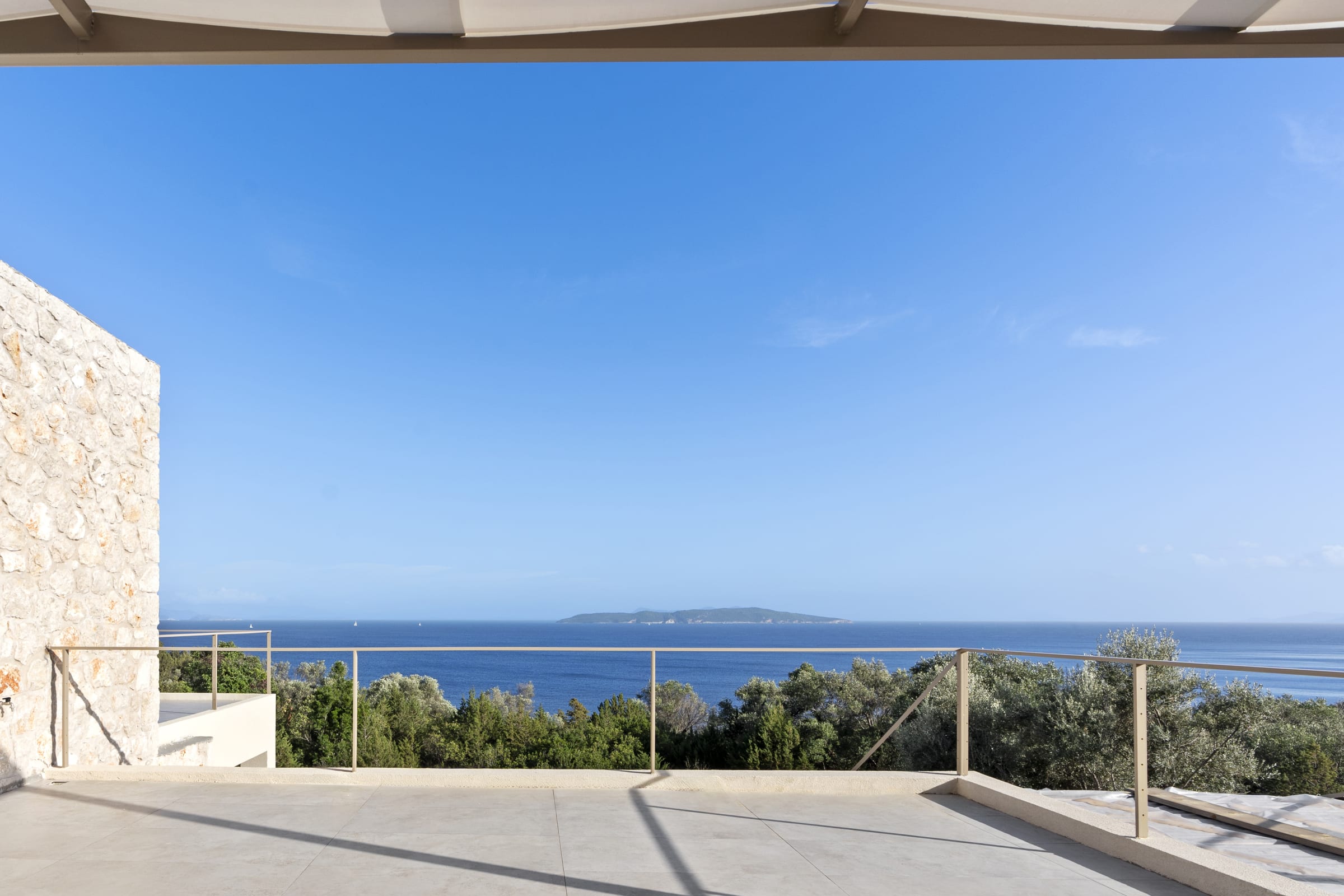 Outdoors, the south-facing infinity pool invites you to enjoy panoramic views of the Ionian Sea and the nearby hills.