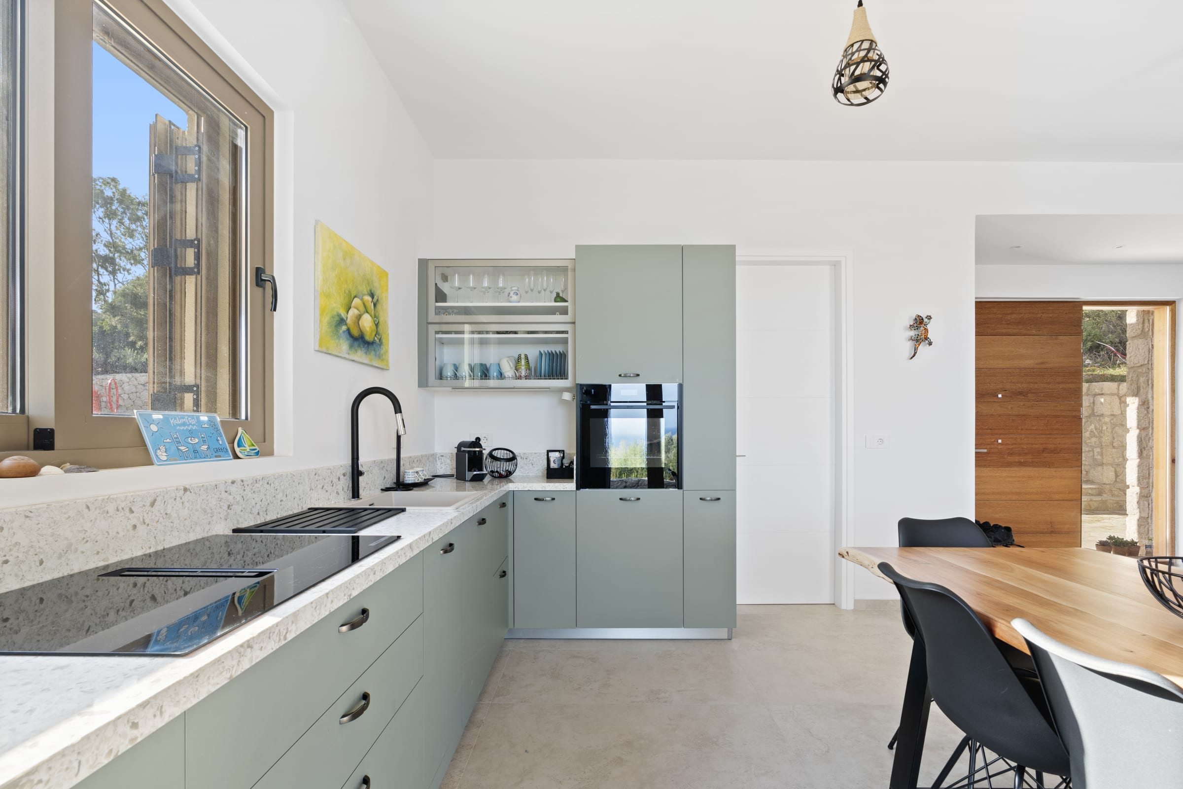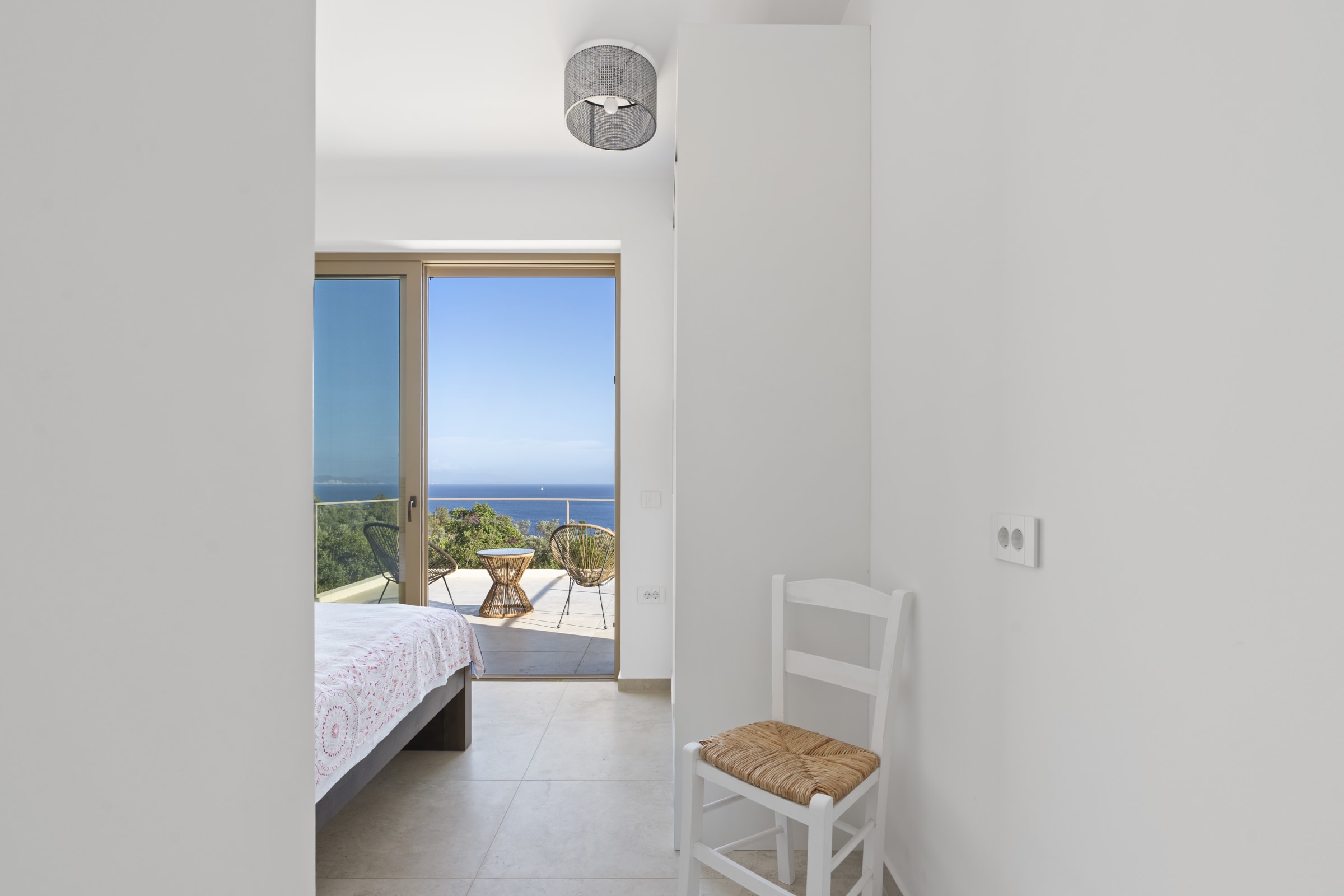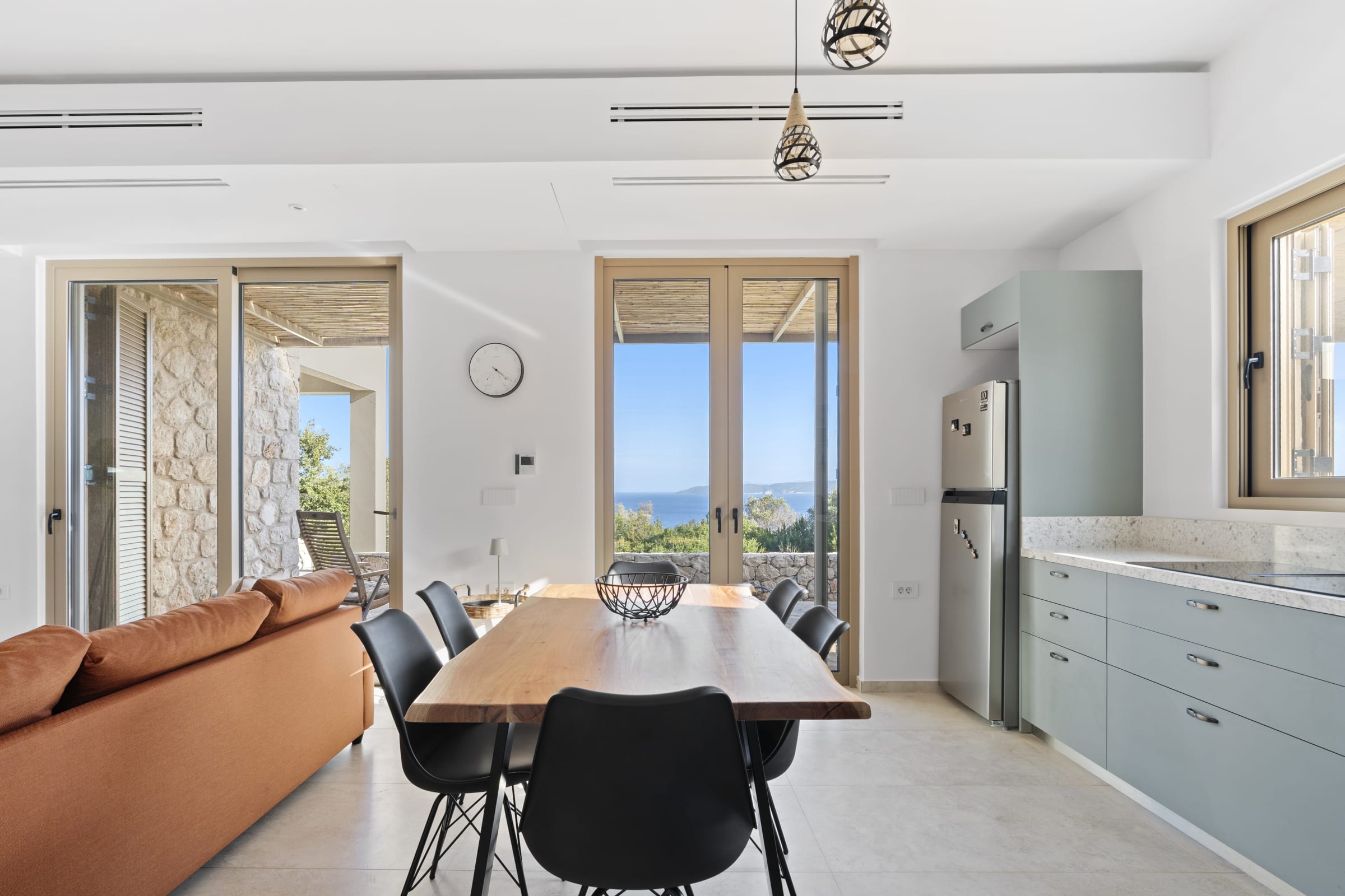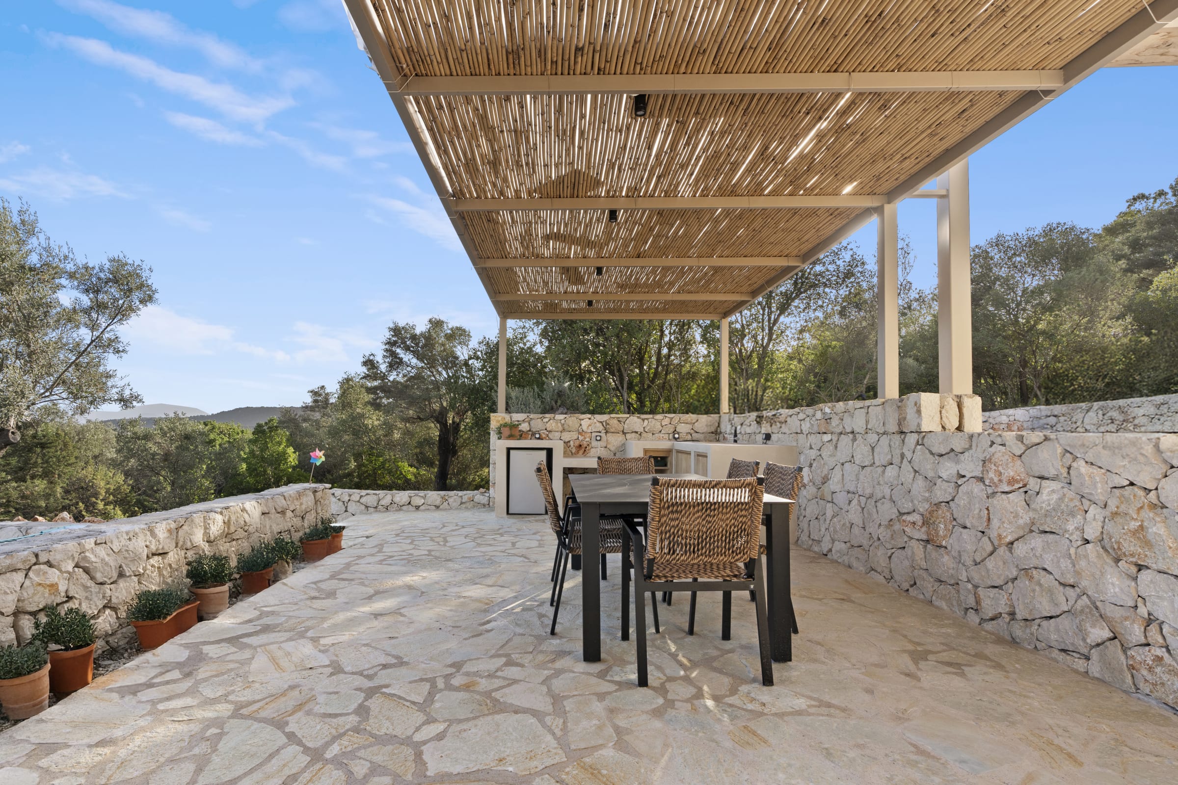 Outdoors, the south-facing infinity pool invites you to enjoy panoramic views of the Ionian Sea and the nearby hills.