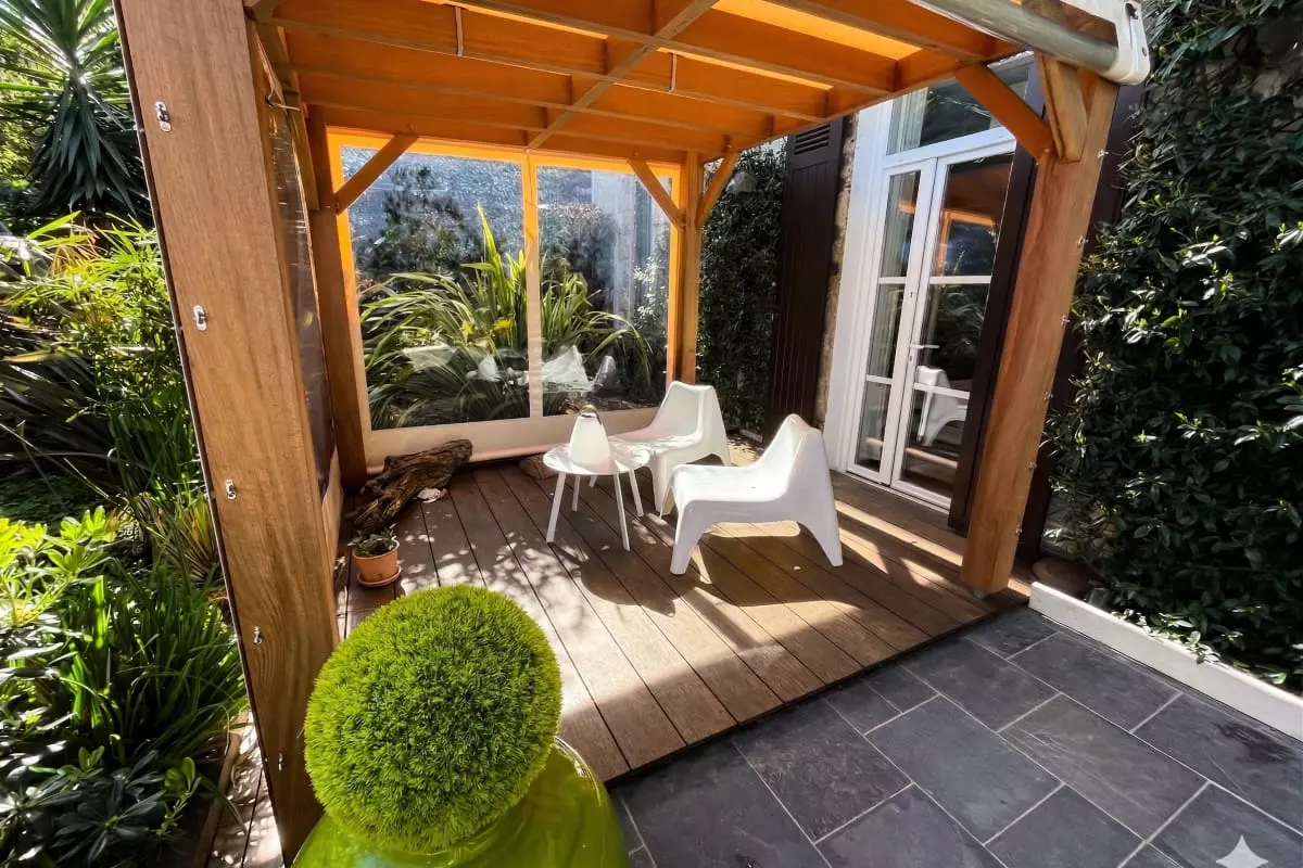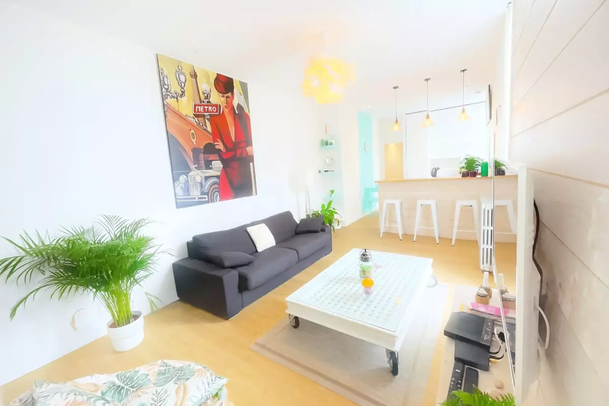 Tastefully and elegantly decorated, the apartment offers a cozy atmosphere, ideal for a stay in the heart of the Basque Country. The glass doors of the living room and kitchen open onto an unexpected outdoor space in the city: a large landscaped garden with a paved terrace, table, chairs and garden furniture – a true haven of greenery right in the center!