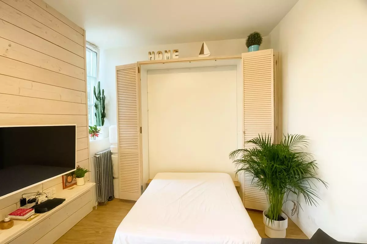 - In the living room, you will find a fold-down bed (140x200), stored in a cupboard.